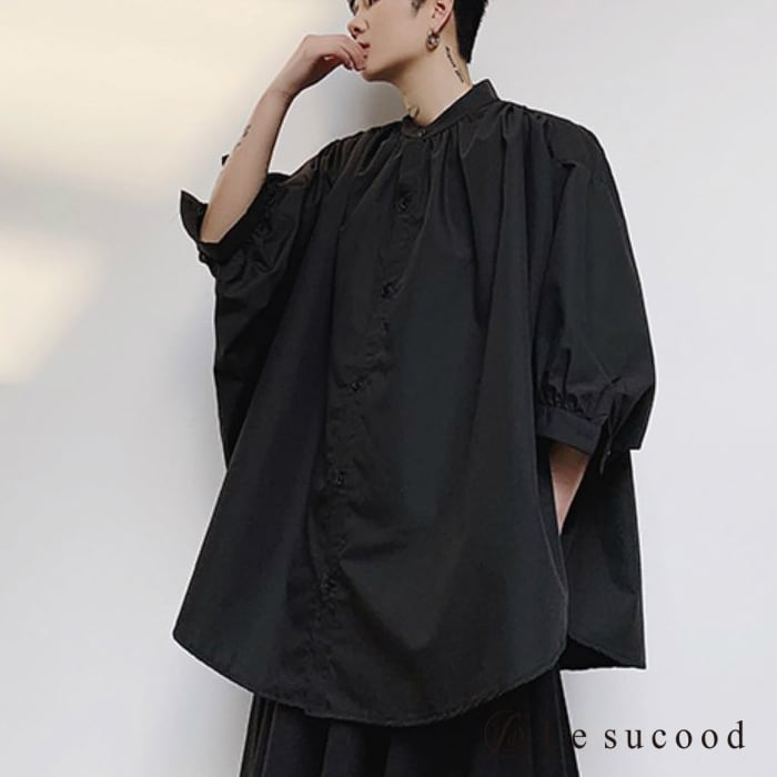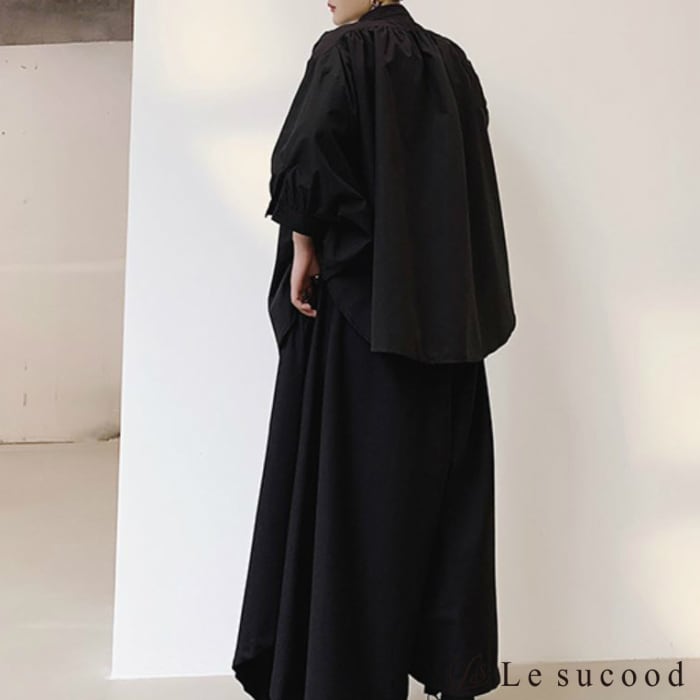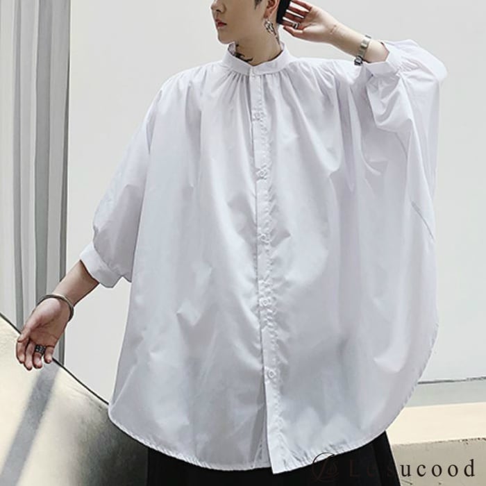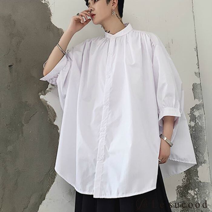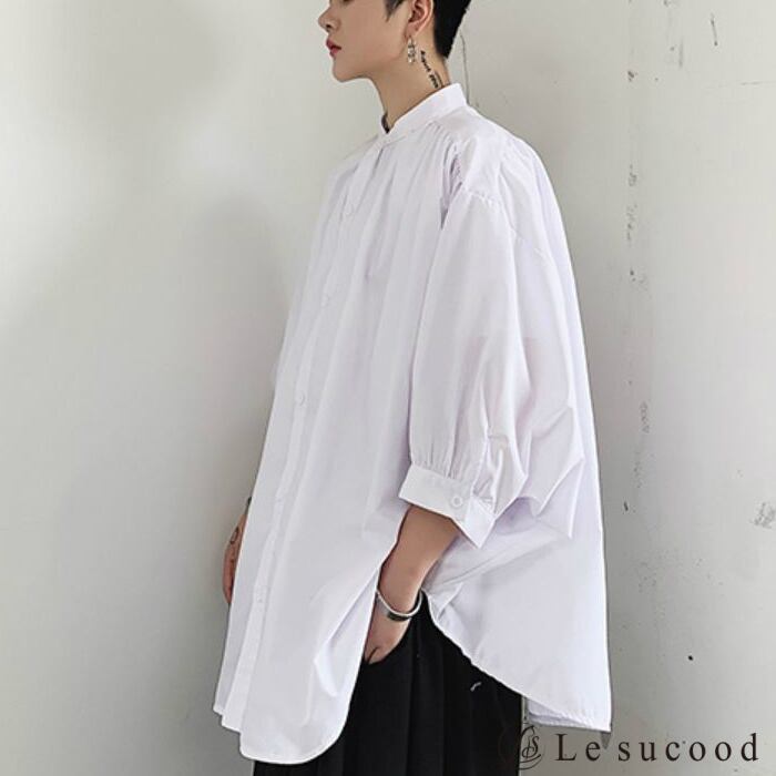 【Le sucood】【お支払い確認後20日以内発送】top244 ロングシャツ オーバーサイズシャツ ビッグシルエット メンズ 無地 七分袖 シンプル 韓国ファッション モード系 V系 ストリート 黒 白 ブラック ホワイト