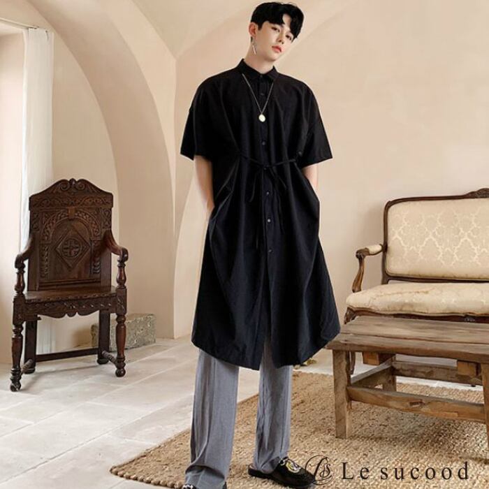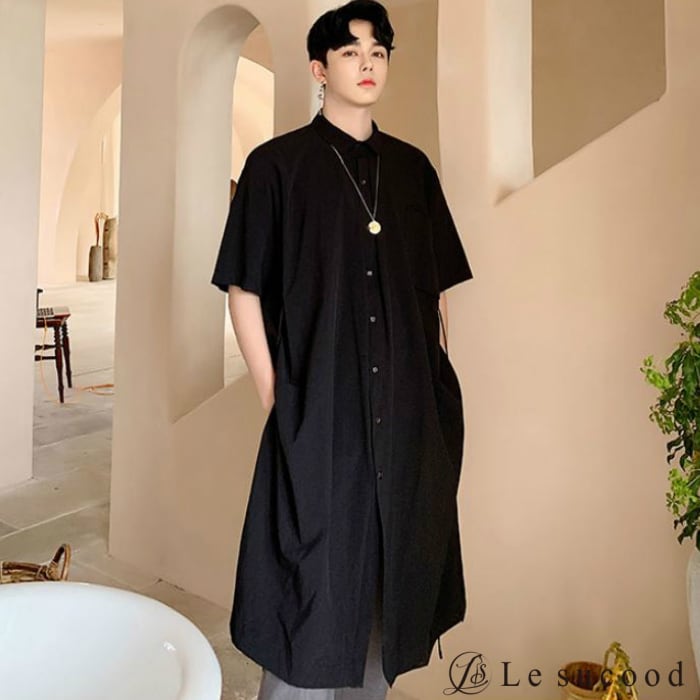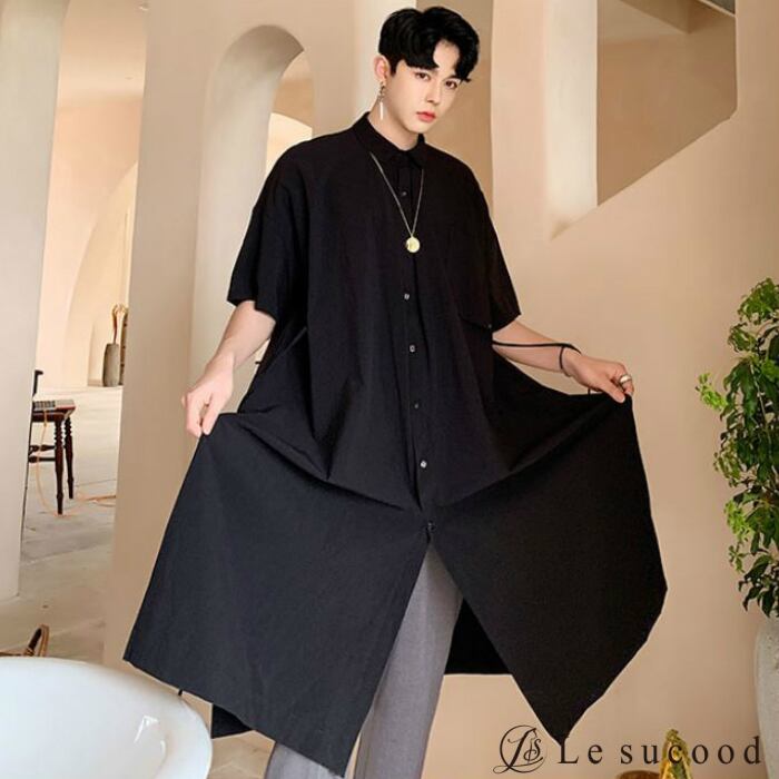 【Le sucood】【お支払い確認後20日以内発送】 ロングスリットシャツ 変形シャツ シャツワンピース ビッグシルエット メンズ ユニセックス 黒 ブラック 白 ホワイト モード系 ストリート ヴィジュアル系 V系 ゴシック ゆるシャツ 半袖