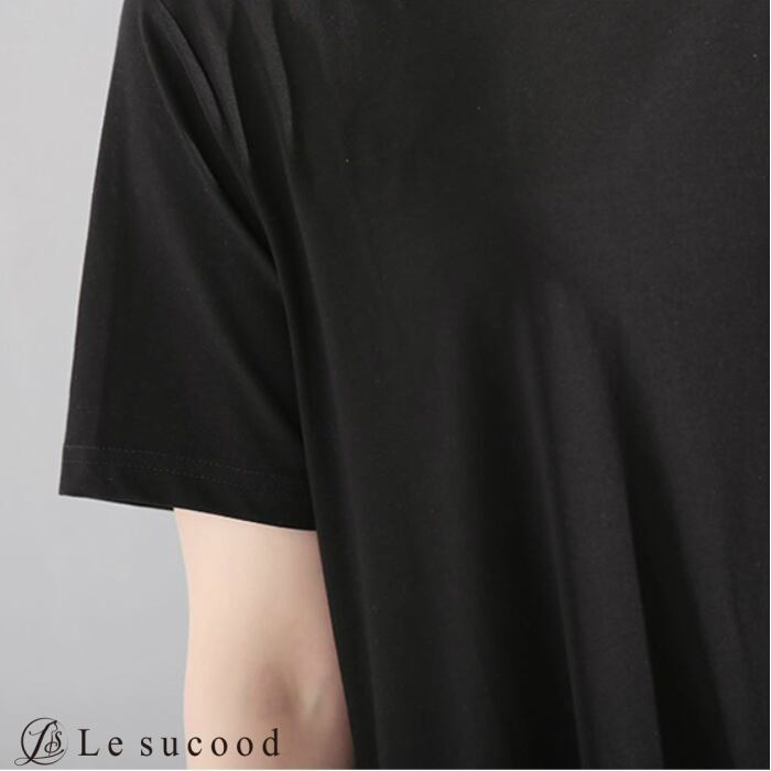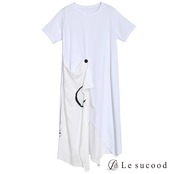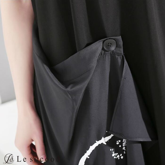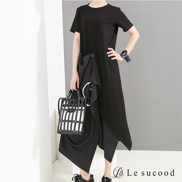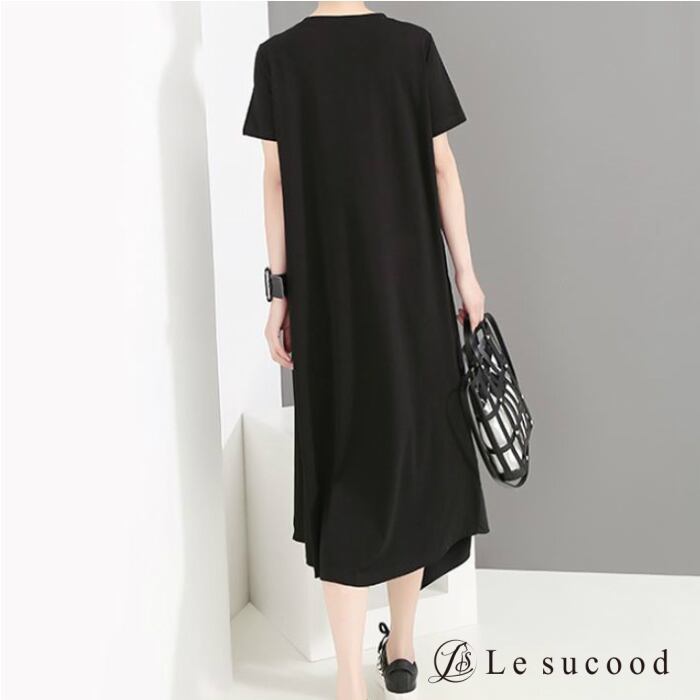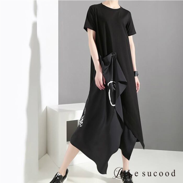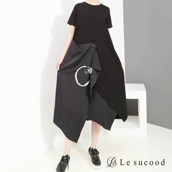 【Le sucood】【お支払い確認後20日以内発送】top256 レイヤード風ワンピース プリント 手書き風 ペイント ワンピ モード ストリート モノトーン 黒 白 ロング丈 レディース ブラック ホワイト 黒 白