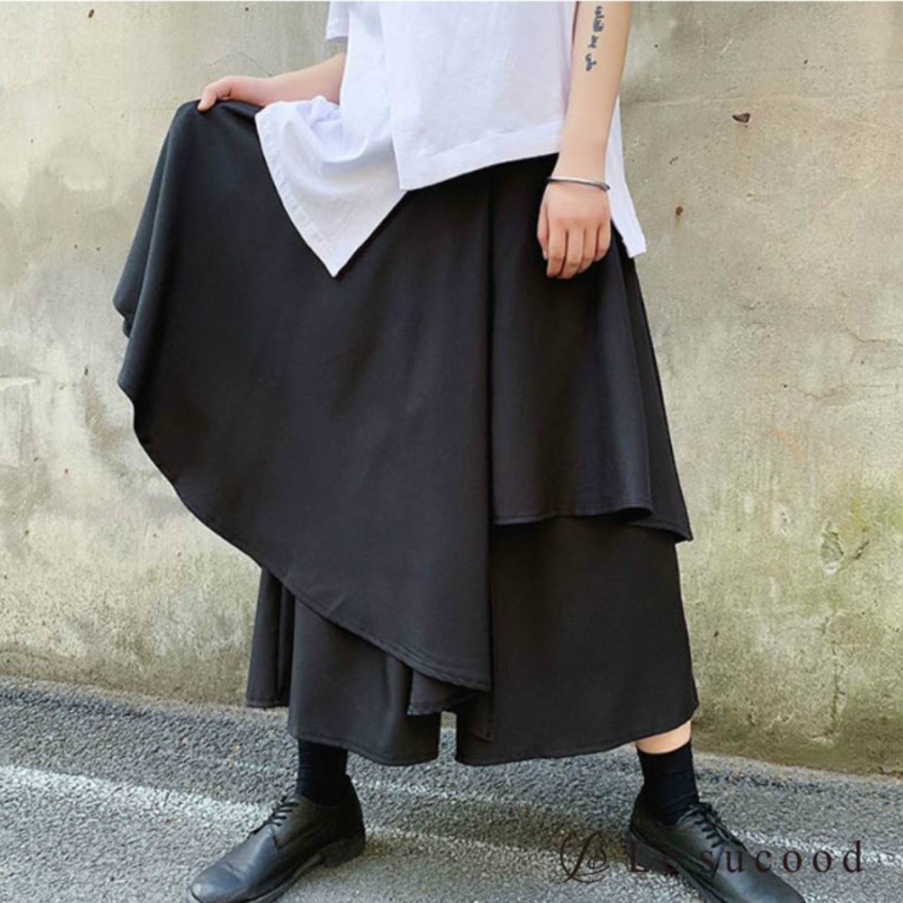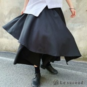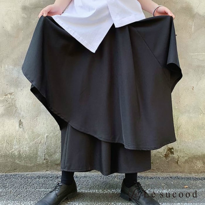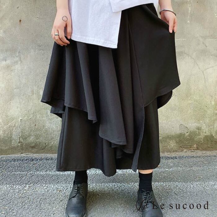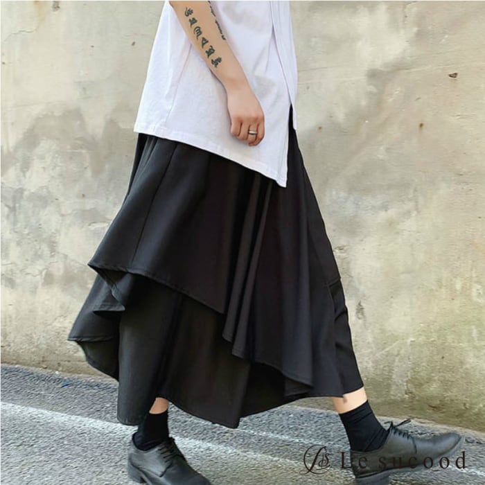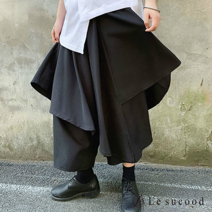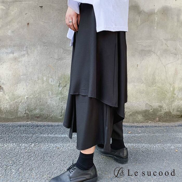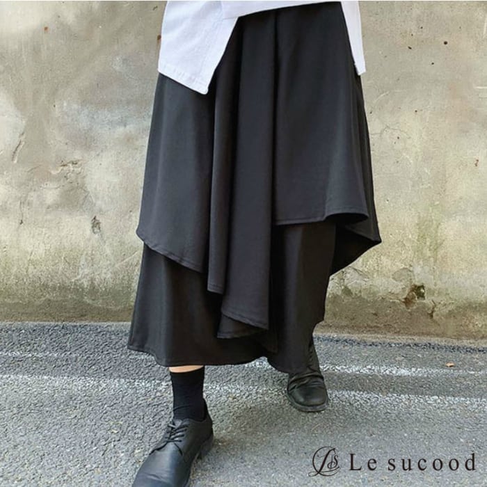 【お支払い後20日以内発送】レイヤードパンツ 重ね着風 スカート ガウチョ 袴 カフェパンツ サロン系 モード mode ストリート ブラック 黒 個性的 変形 アシンメトリー V系 | Le sucood