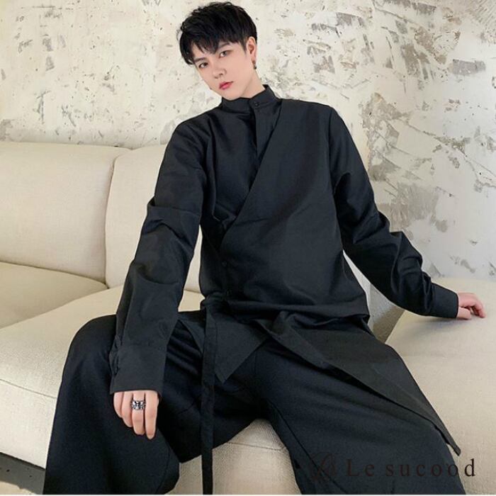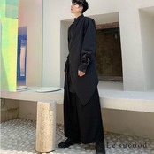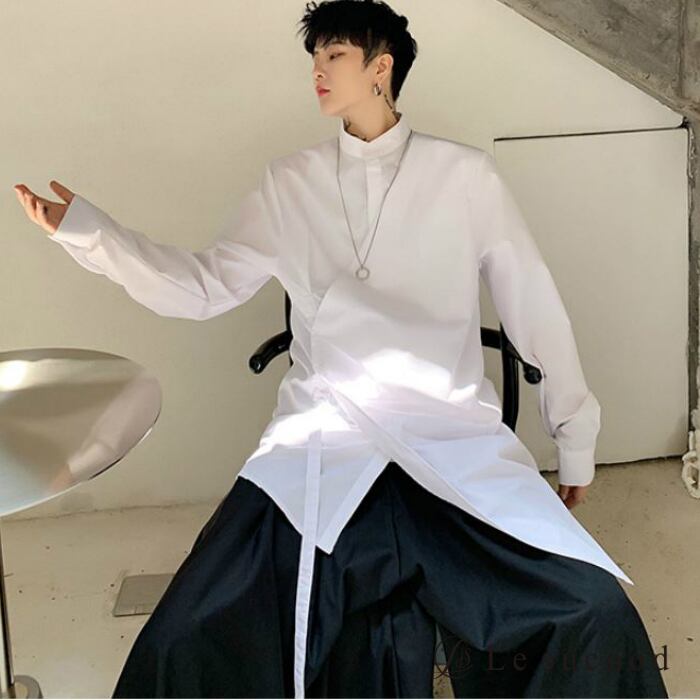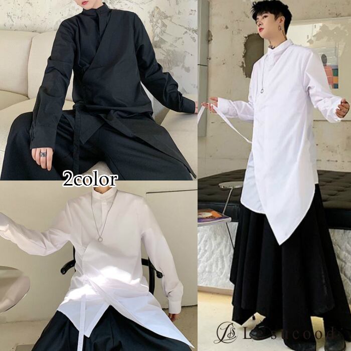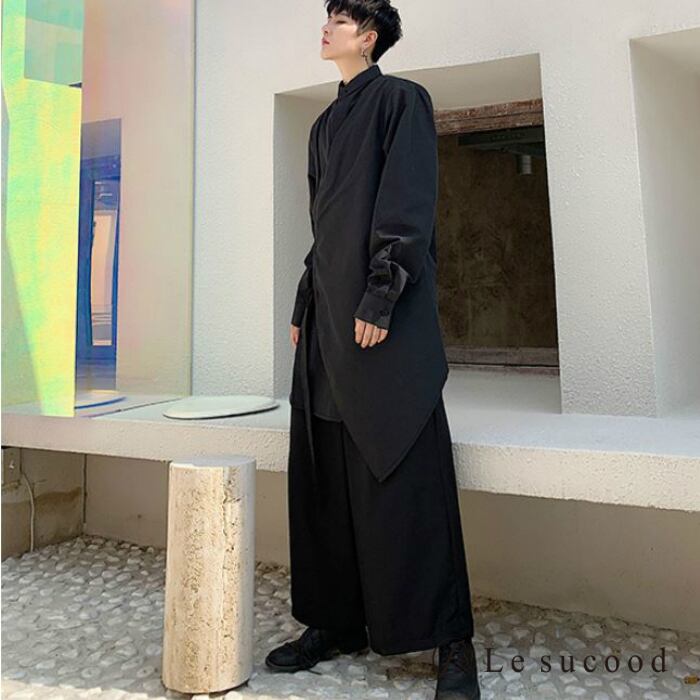 【Le sucood】【お支払い確認後20日以内発送】top261 レイヤード風ロングシャツ モード ブラック 黒 ホワイト 白 羽織 長袖 アシンメトリー 個性的 ストリート 独創的 ユニセックス