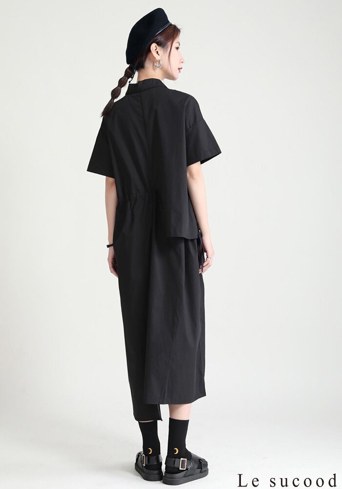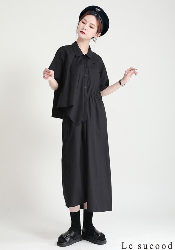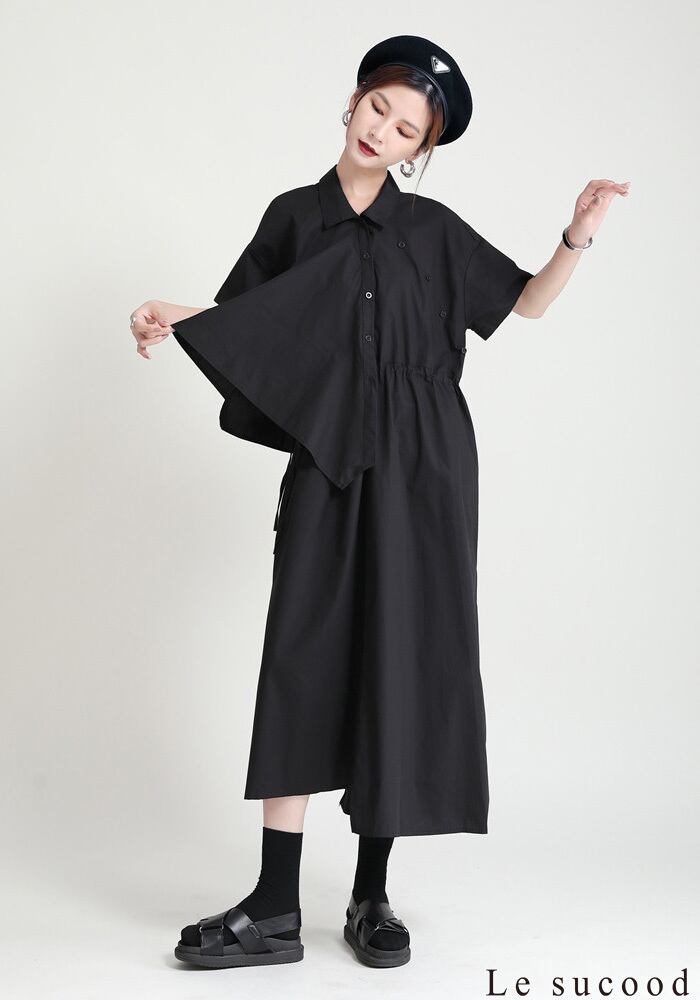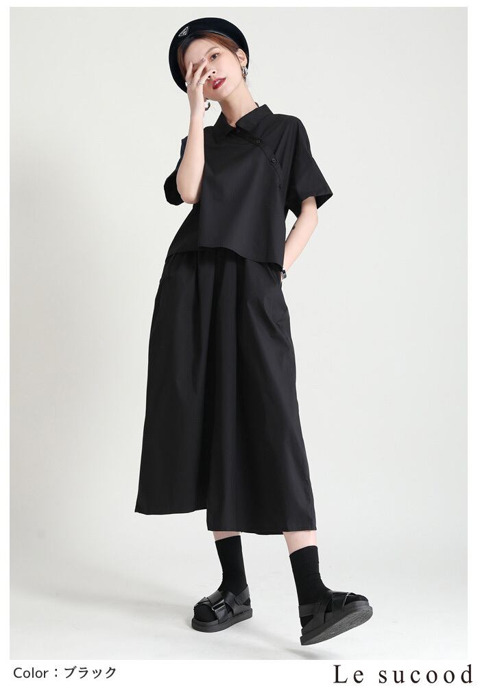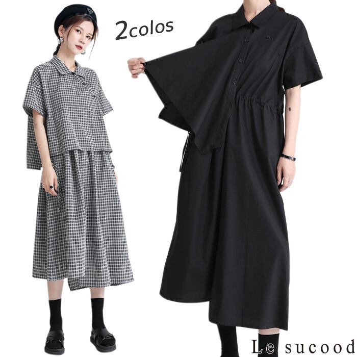 【Le sucood】【お支払い確認後20日以内発送】セットアップ風ワンピース アシメ 変形 ミモレ丈 ロング丈 ワンピ シャツワンピース きれいめワンピース Iライン レトロ 無地 チェック 大人カジュアル 大人可愛い レディース モード系 原宿系 青文字系 | Le sucood