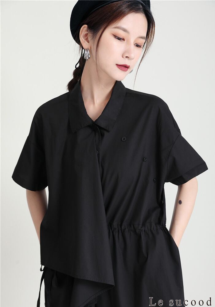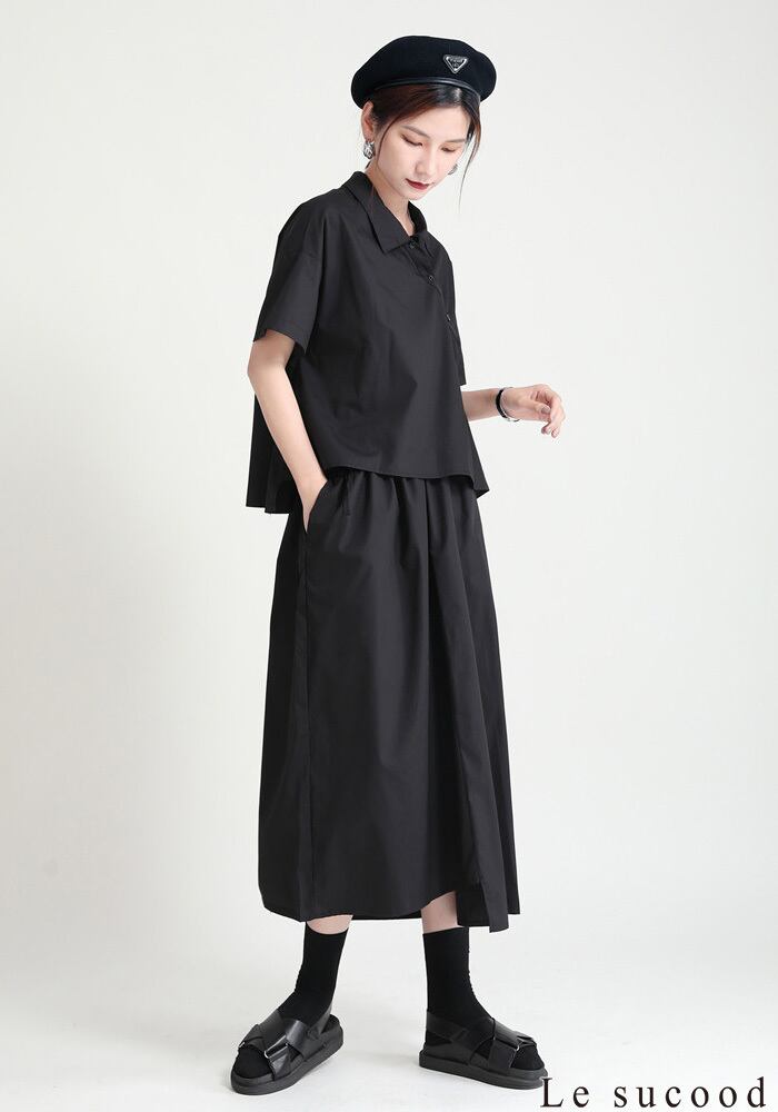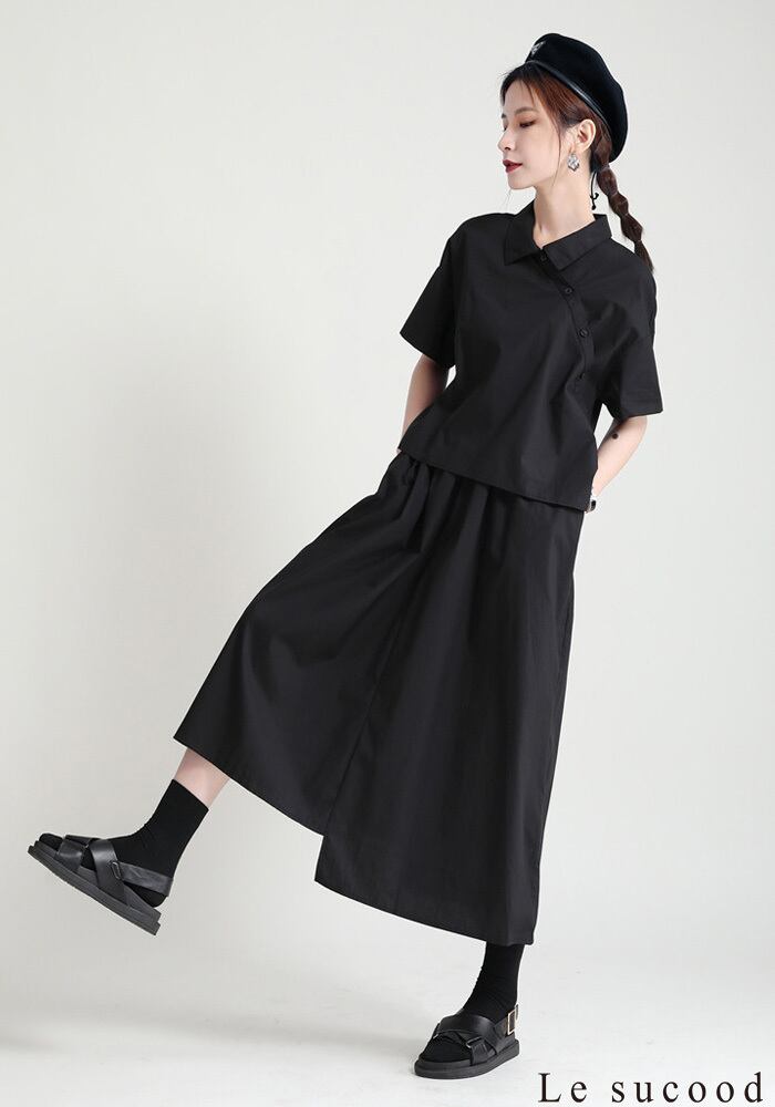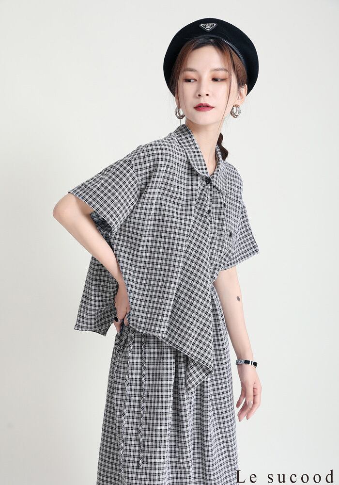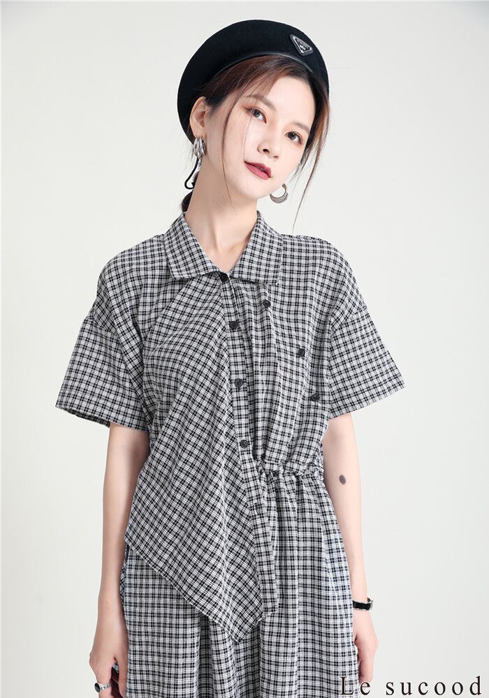 【Le sucood】【お支払い確認後20日以内発送】セットアップ風ワンピース アシメ 変形 ミモレ丈 ロング丈 ワンピ シャツワンピース きれいめワンピース Iライン レトロ 無地 チェック 大人カジュアル 大人可愛い レディース モード系 原宿系 青文字系 | Le sucood
