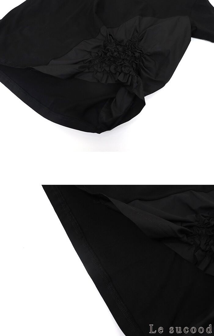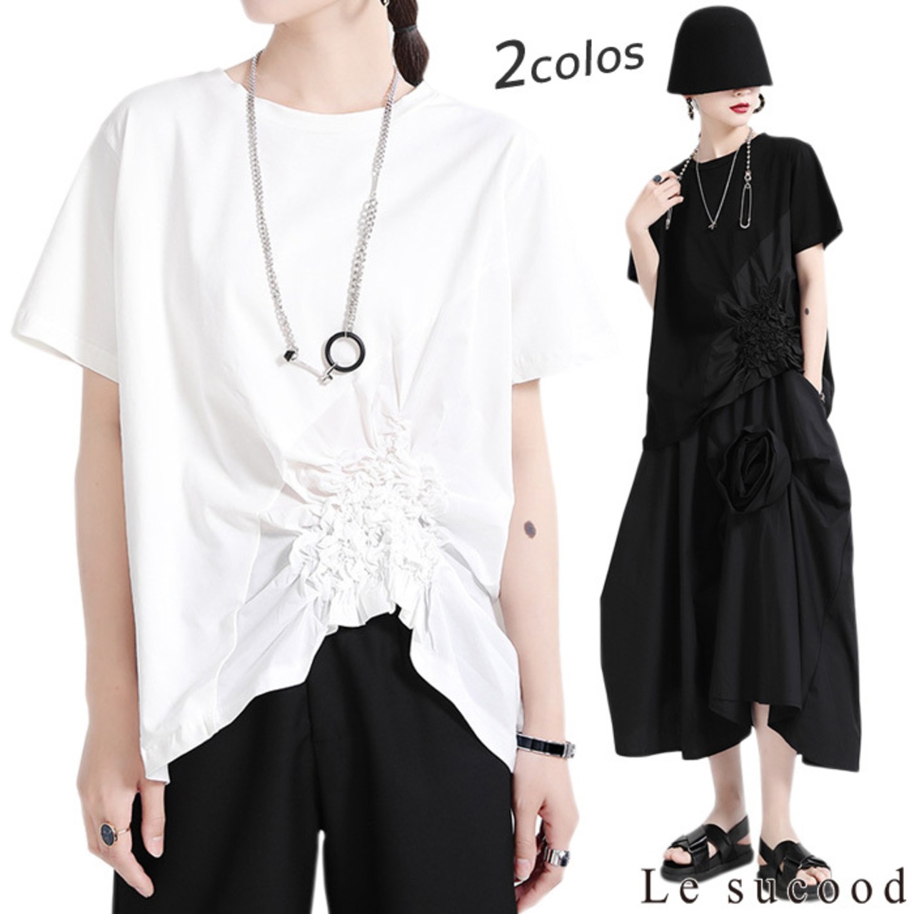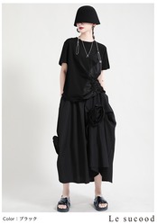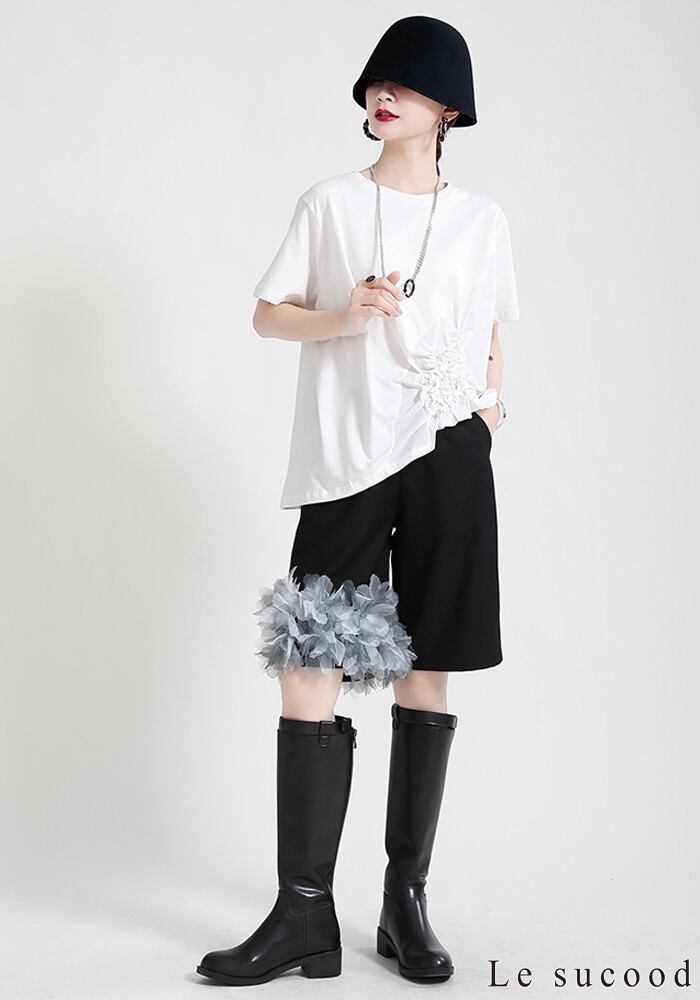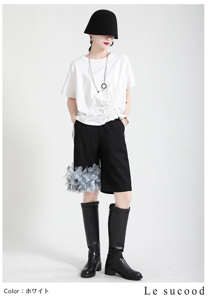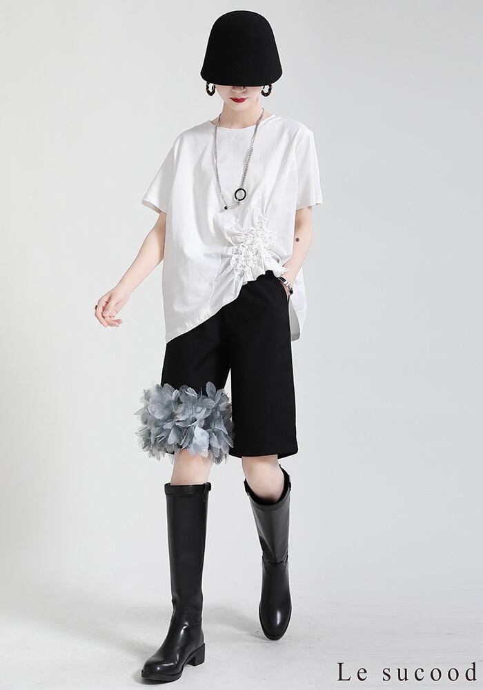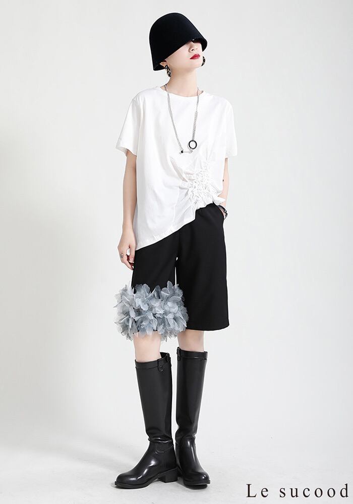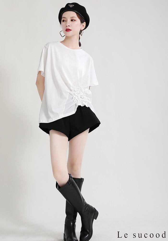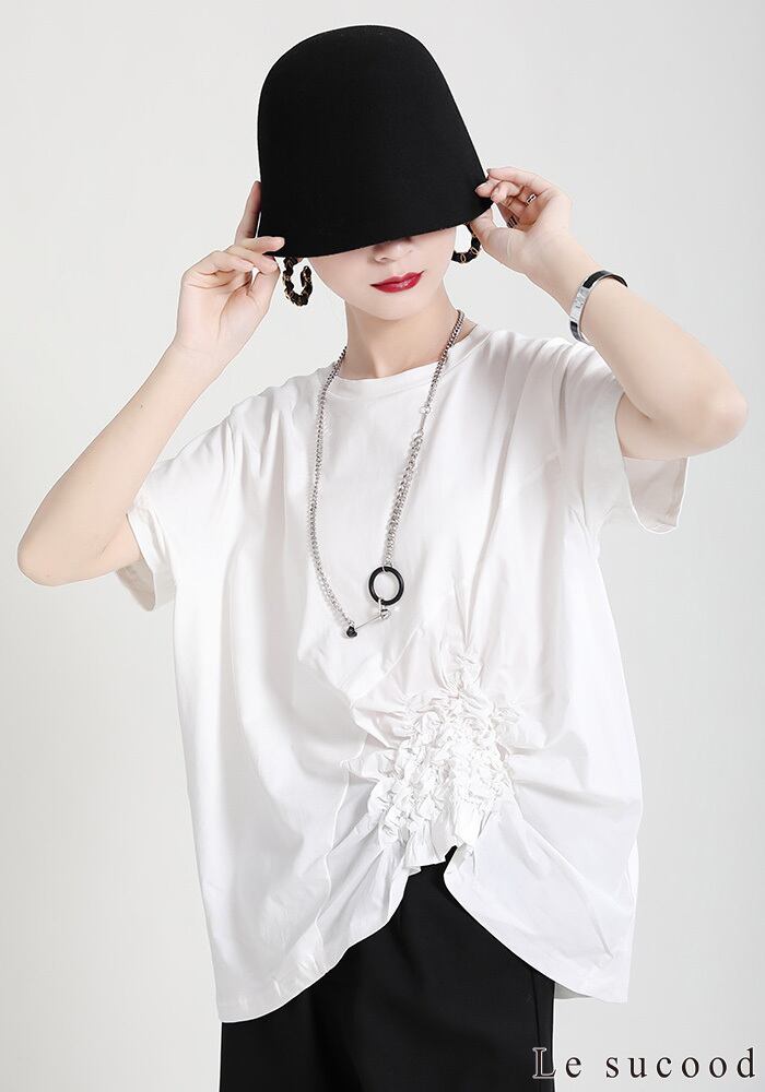 【Le sucood】【お支払い確認後20日以内発送】花加工半袖シャツ Tシャツ 変形 ドレープ アシンメトリー きれいめ 白tシャツ 白シャツ 無地 トップス デザインカットソー 大人カジュアル 大人可愛い レディース モード系 原宿系 青文字系 | Le sucood