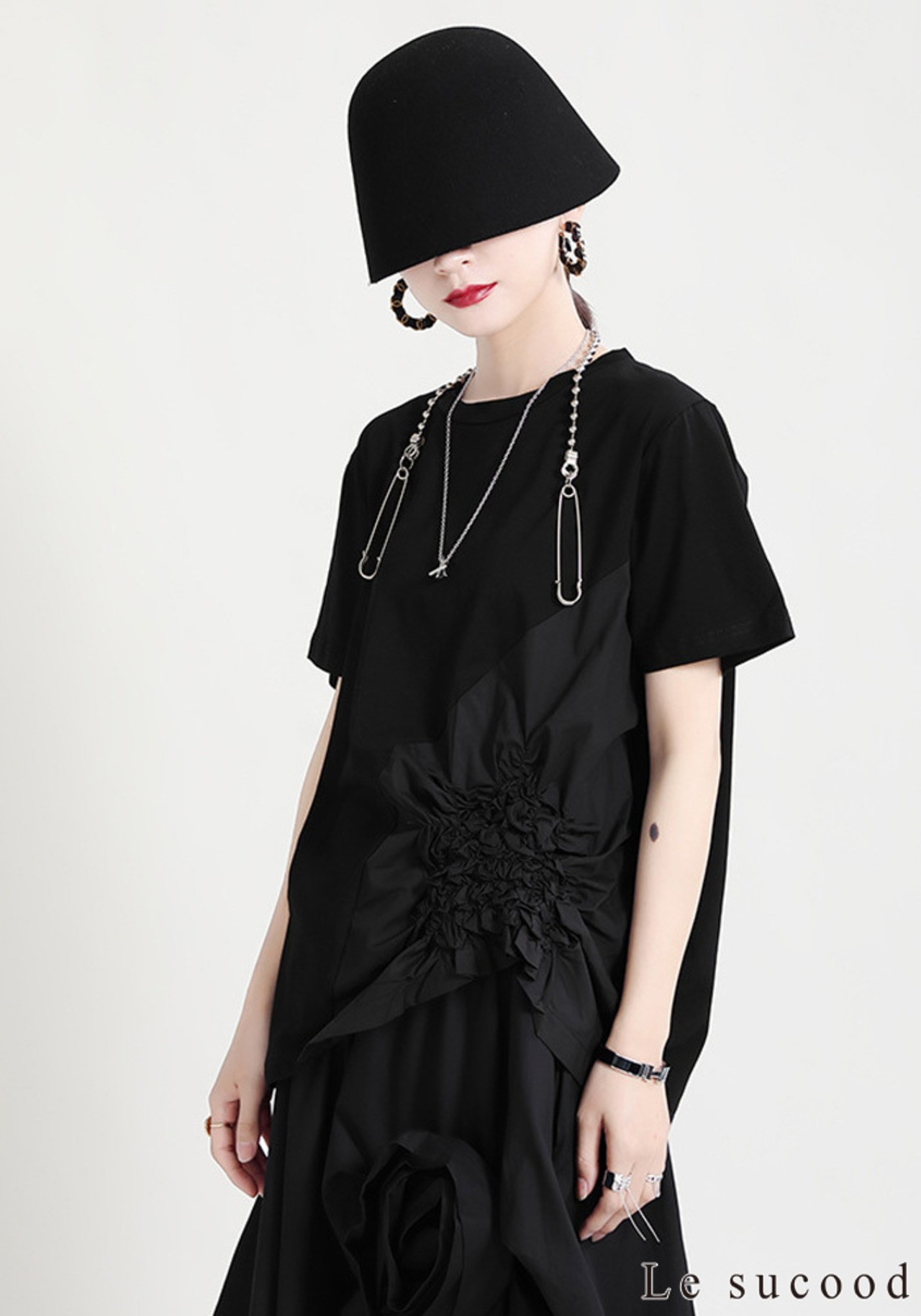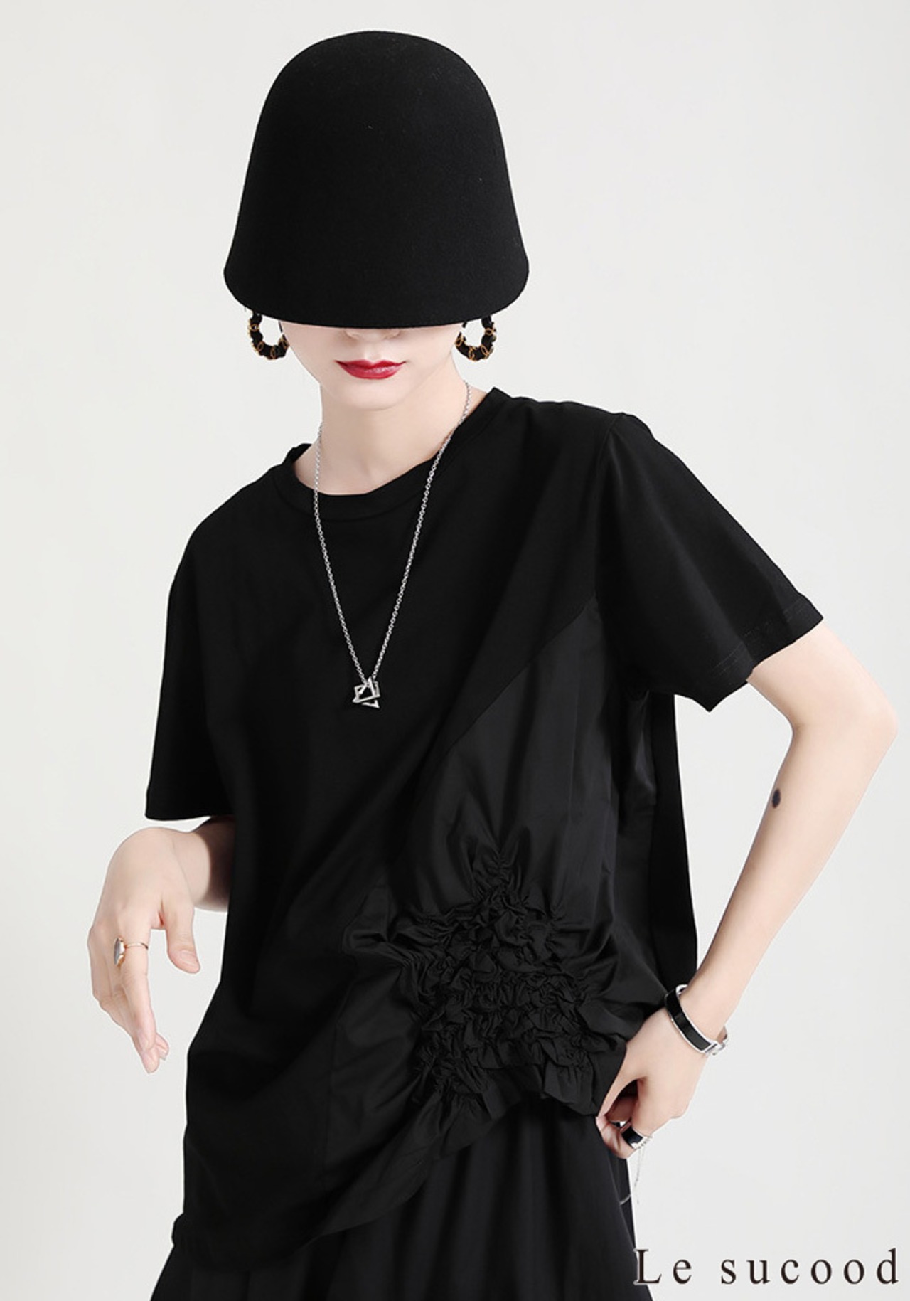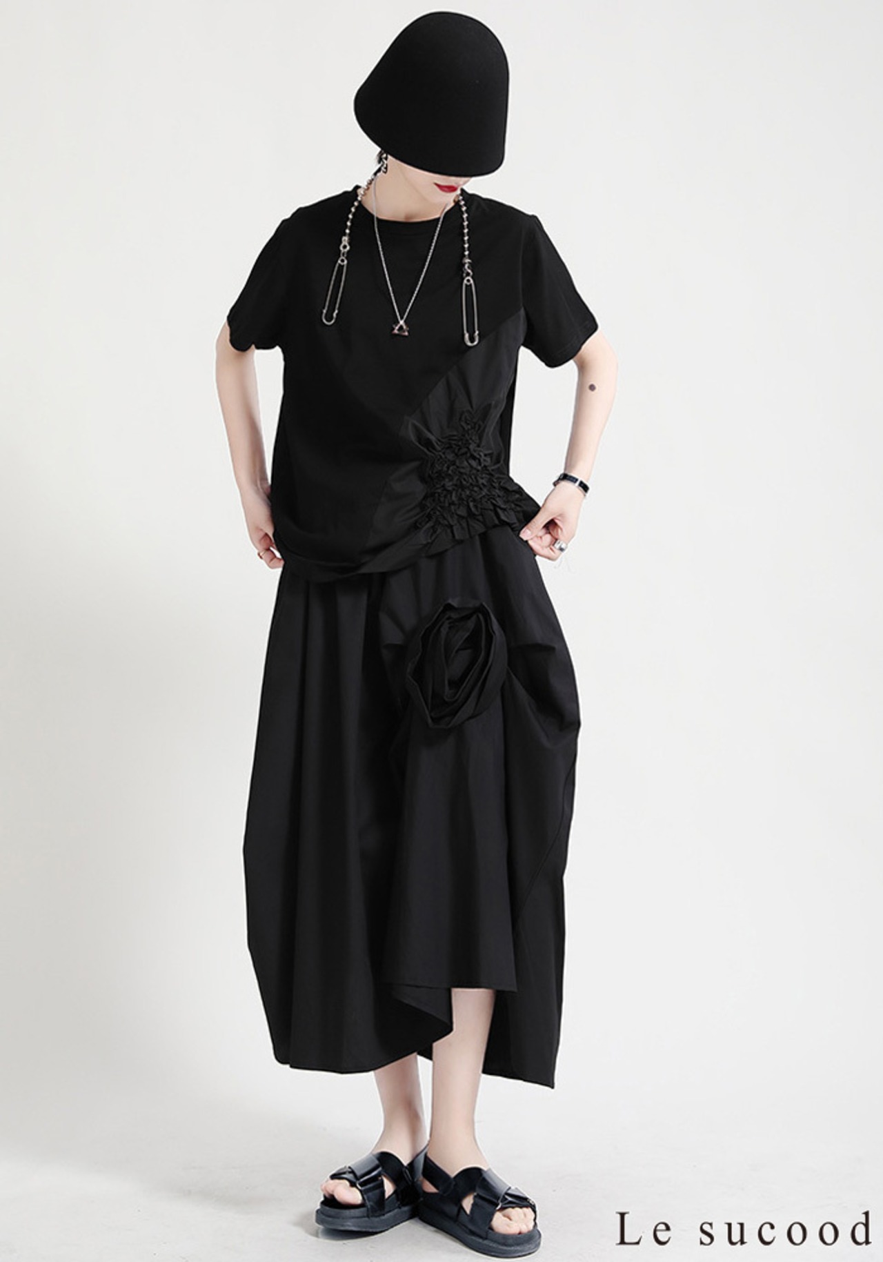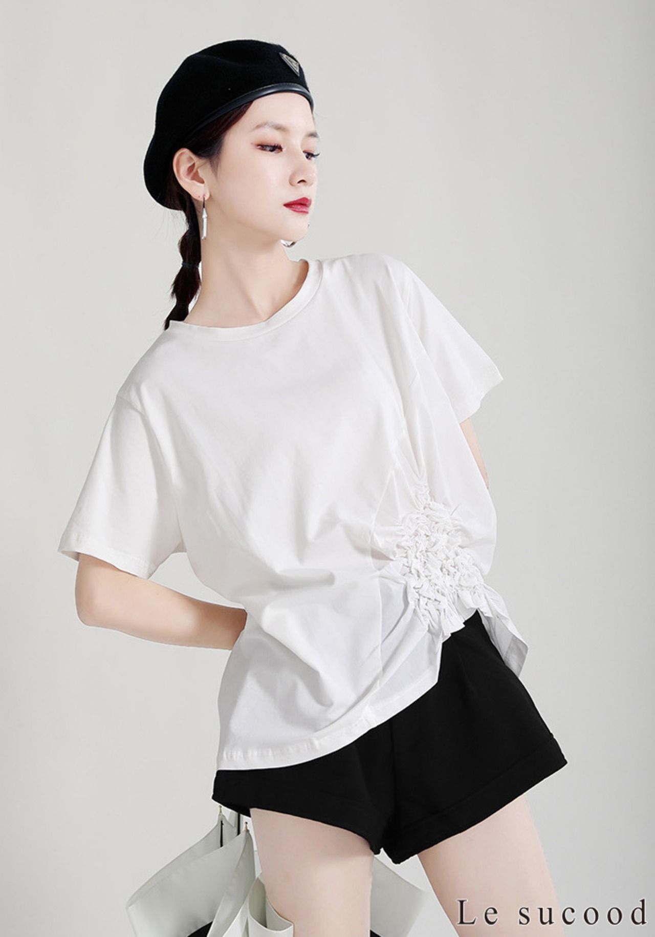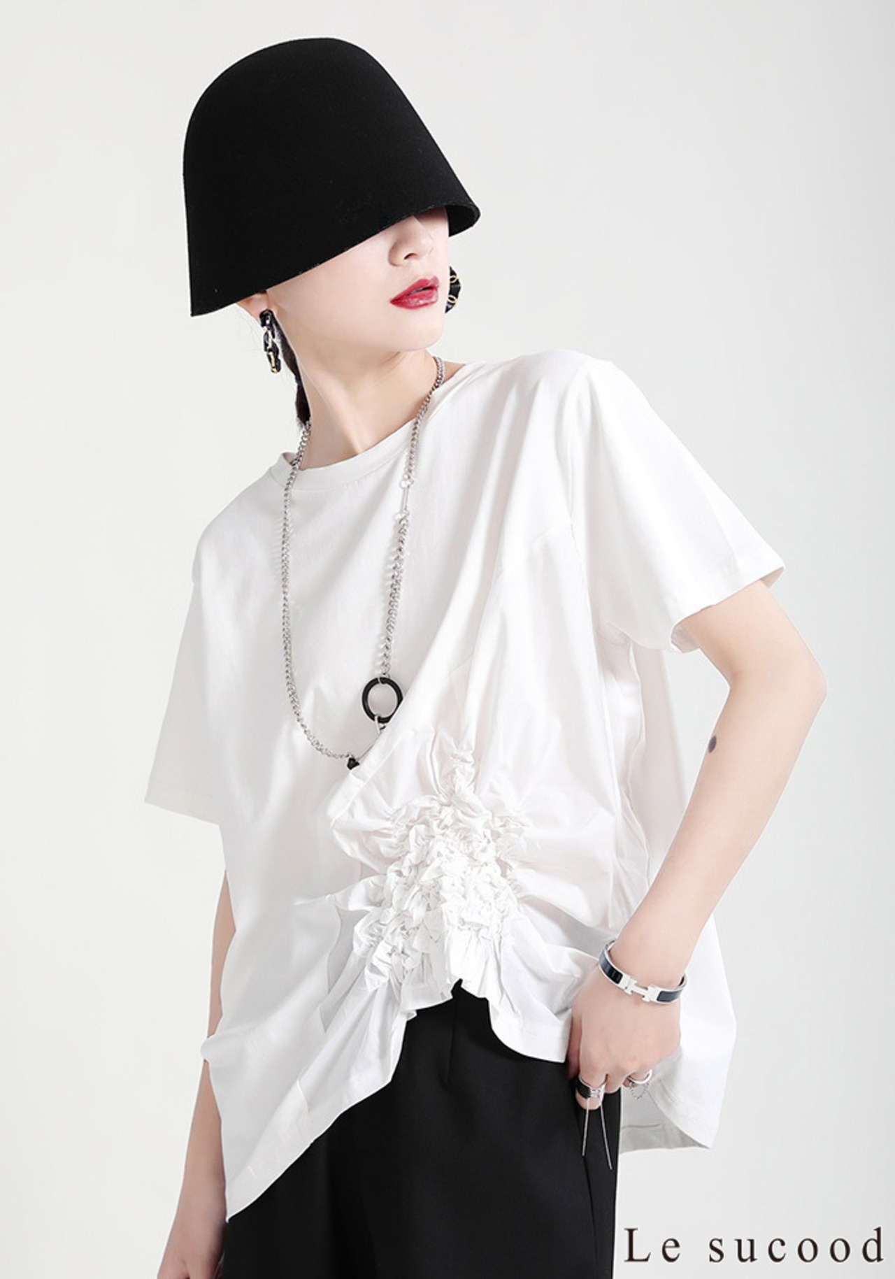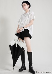 【Le sucood】【お支払い確認後20日以内発送】花加工半袖シャツ Tシャツ 変形 ドレープ アシンメトリー きれいめ 白tシャツ 白シャツ 無地 トップス デザインカットソー 大人カジュアル 大人可愛い レディース モード系 原宿系 青文字系 | Le sucood