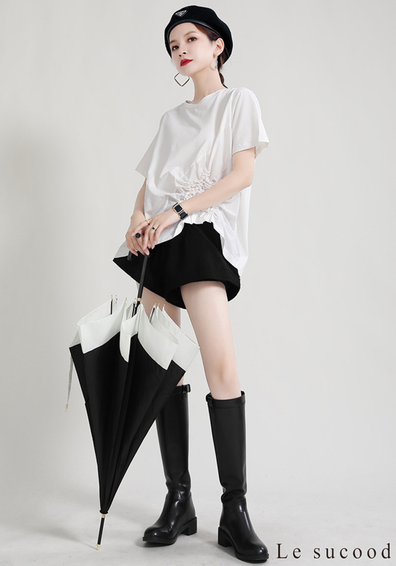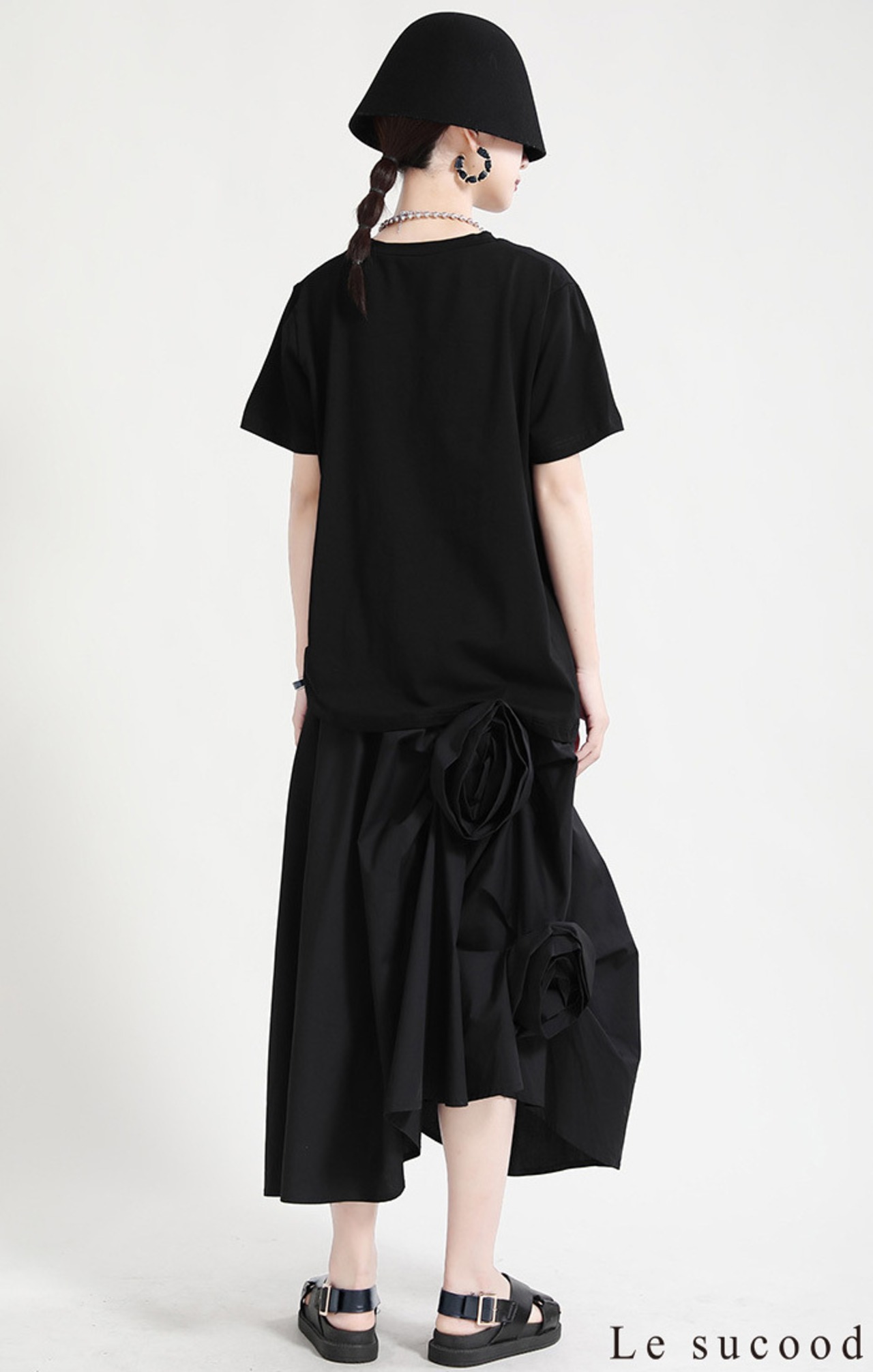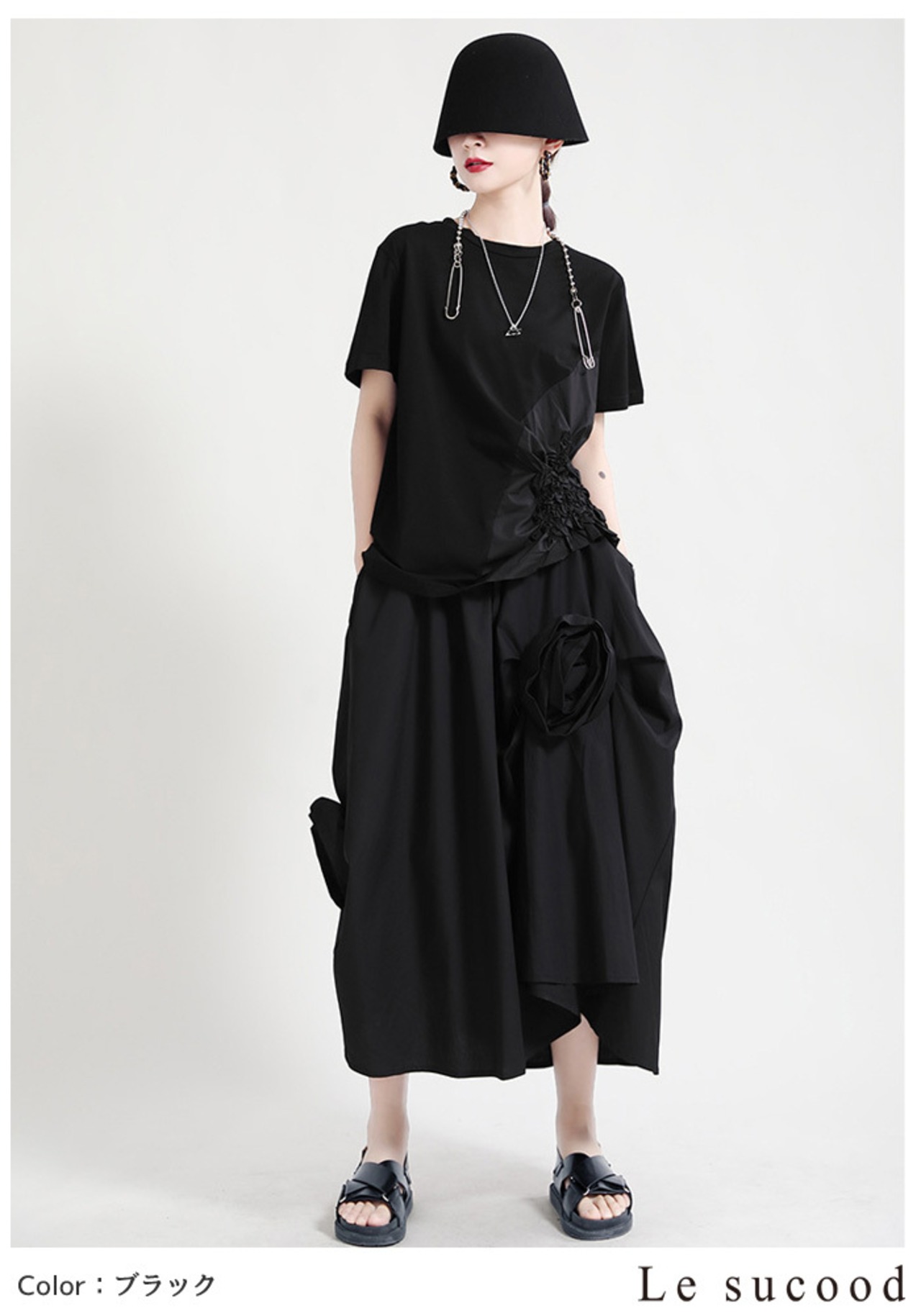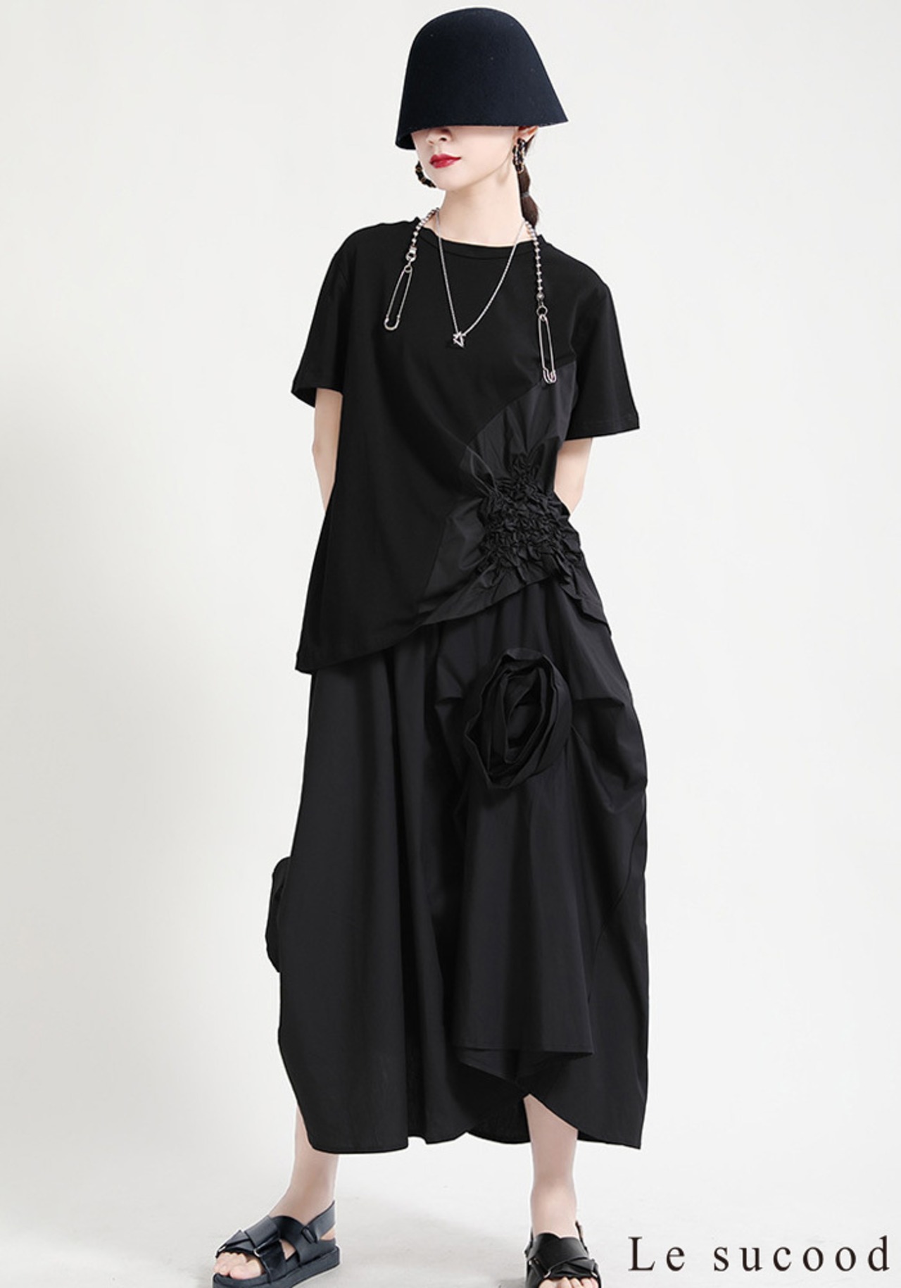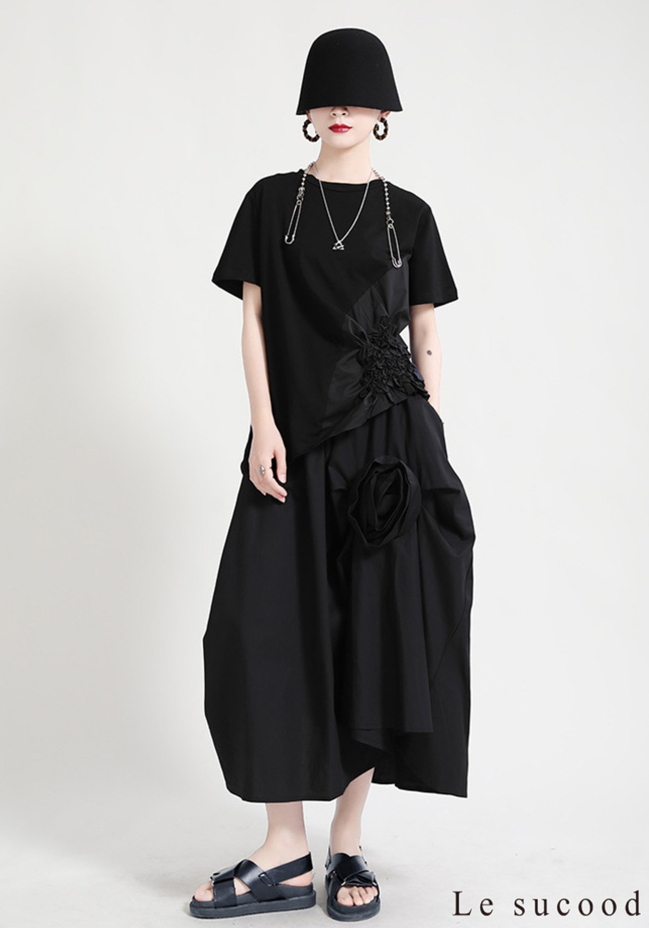 【Le sucood】【お支払い確認後20日以内発送】花加工半袖シャツ Tシャツ 変形 ドレープ アシンメトリー きれいめ 白tシャツ 白シャツ 無地 トップス デザインカットソー 大人カジュアル 大人可愛い レディース モード系 原宿系 青文字系 | Le sucood