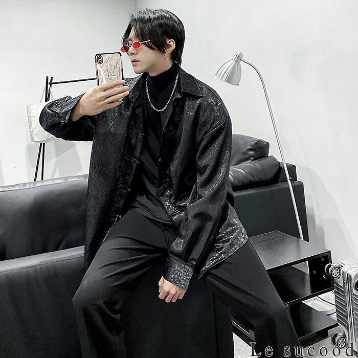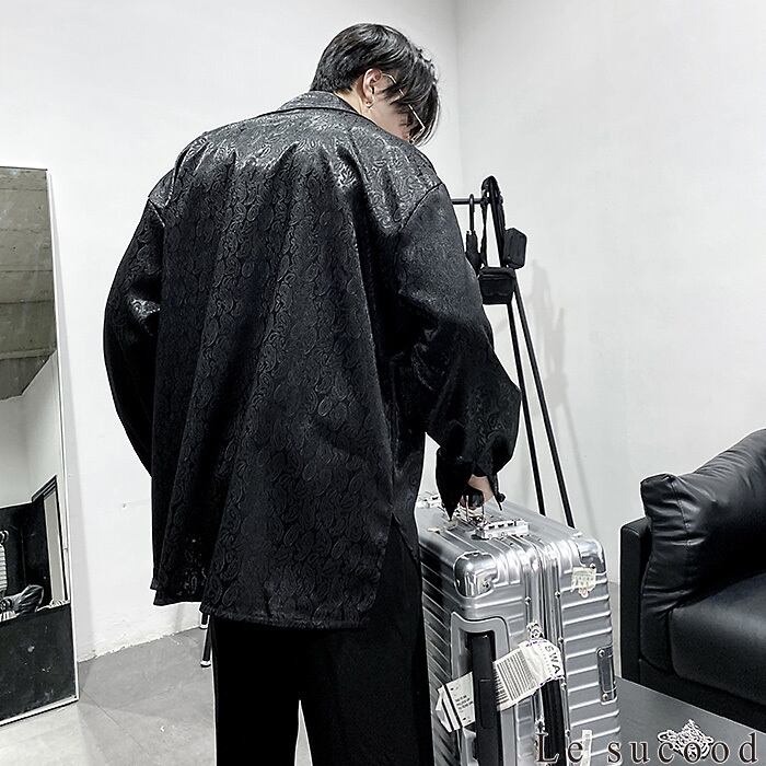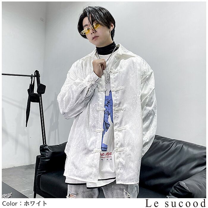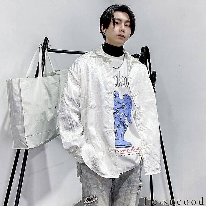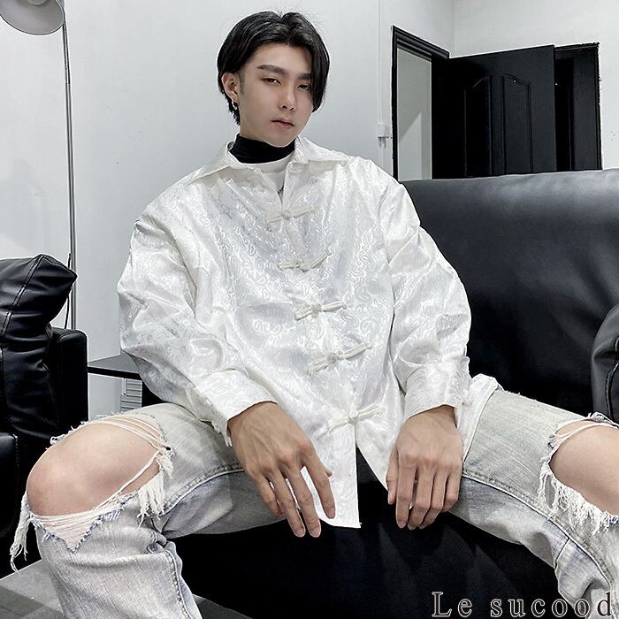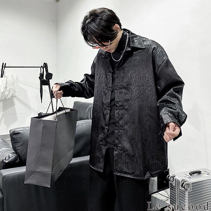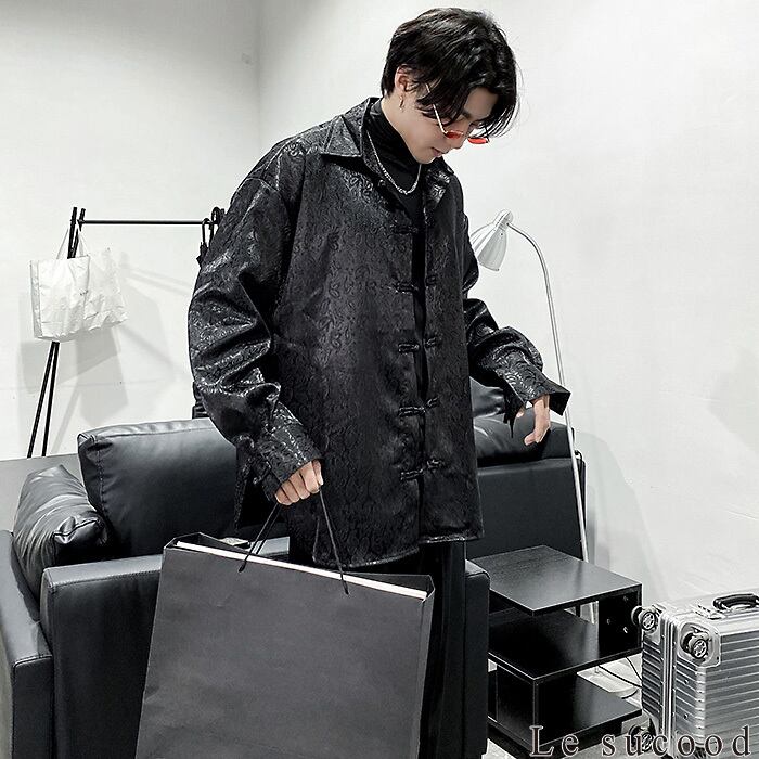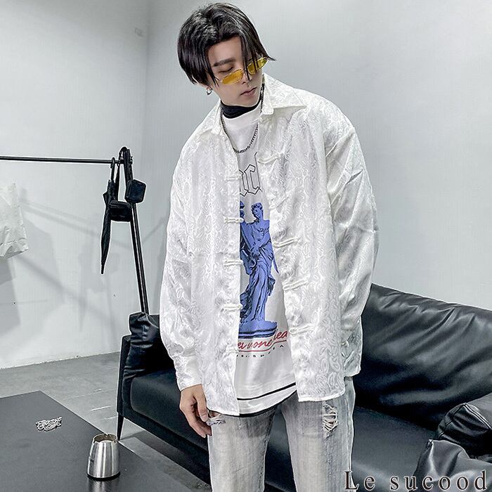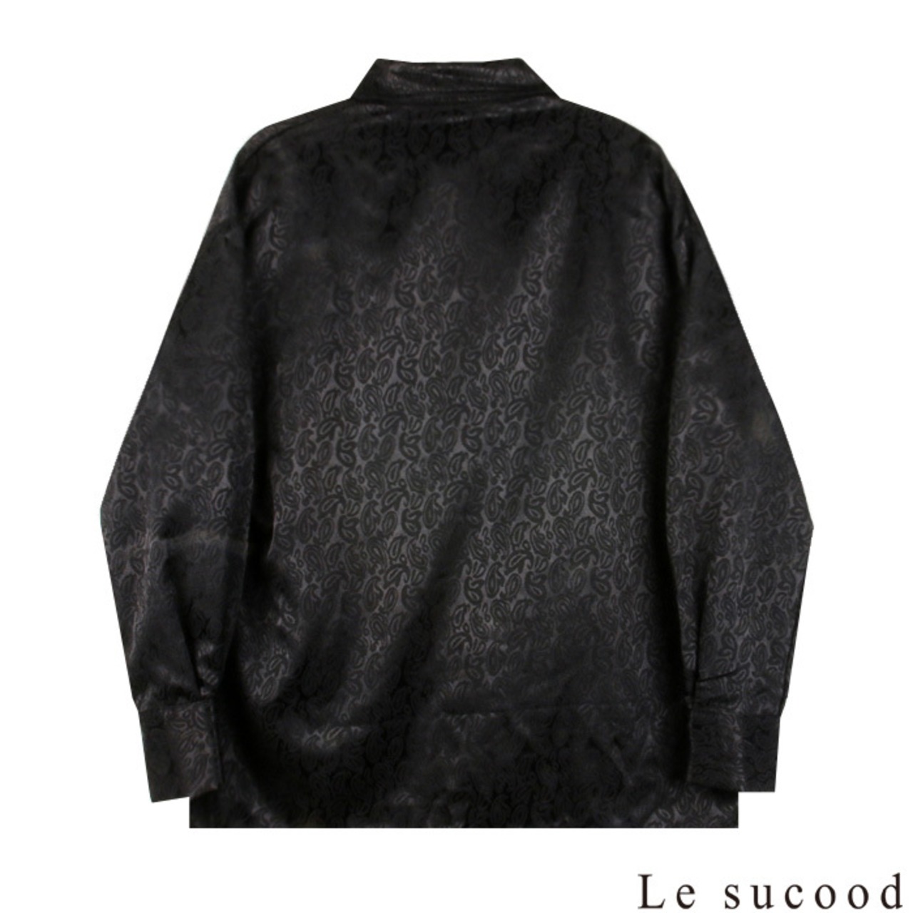 【Le sucood】【お支払い確認後20日以内発送】チャイナボタンモードシャツ オーバーサイズシャツ ビッグシルエット ゆったり チャイナシャツ チャイナ服 羽織り ペイズリー柄 漢服 総柄 ダボシャツトップス 長袖 個性 メンズ モード系 ストリート 原宿系 青文字系 | Le sucood