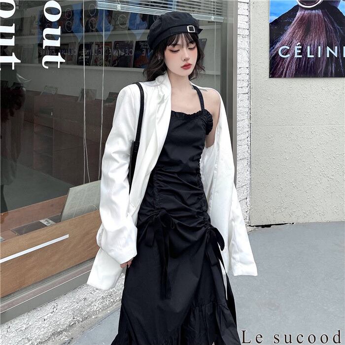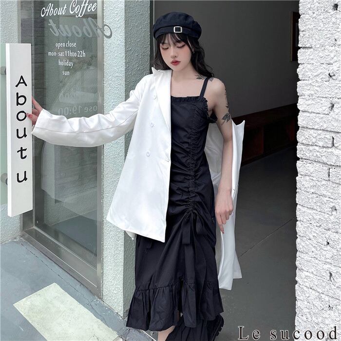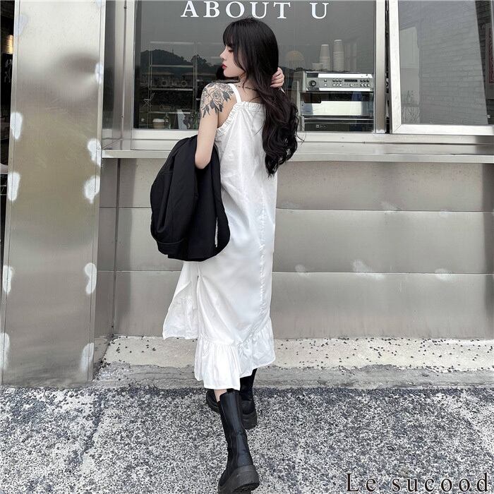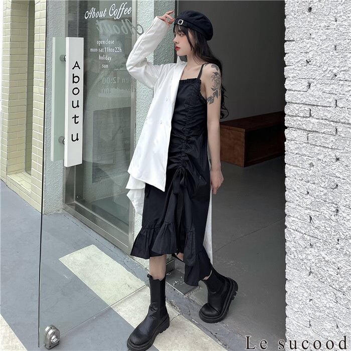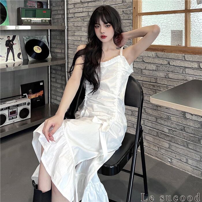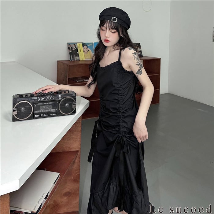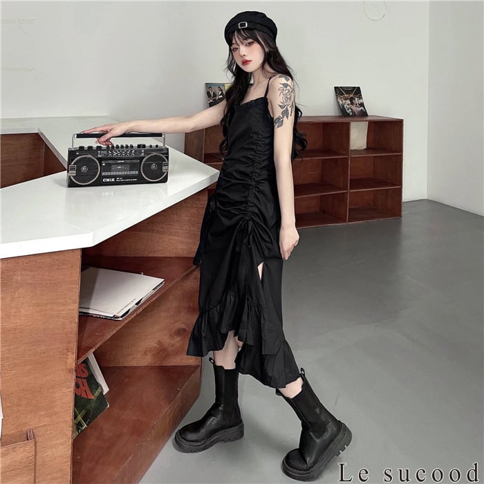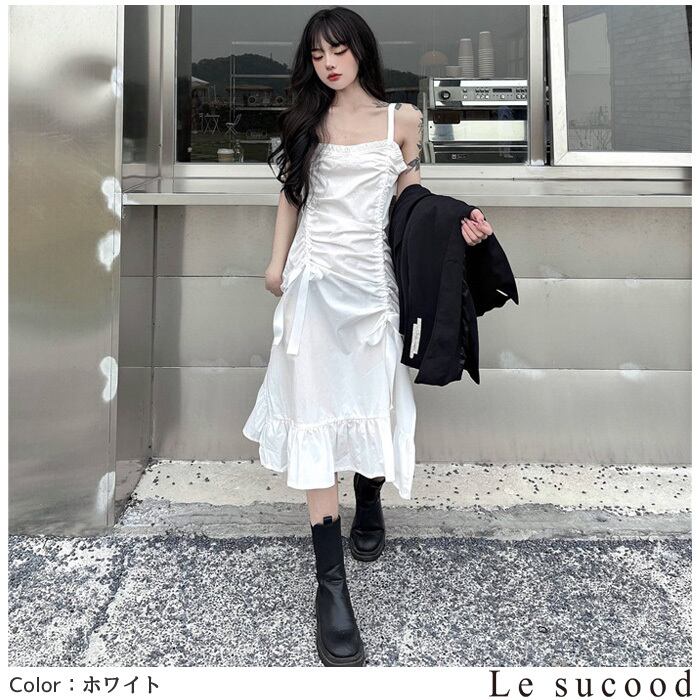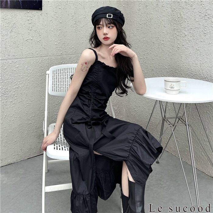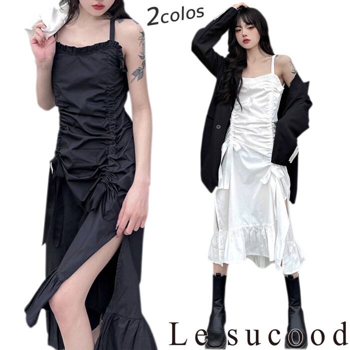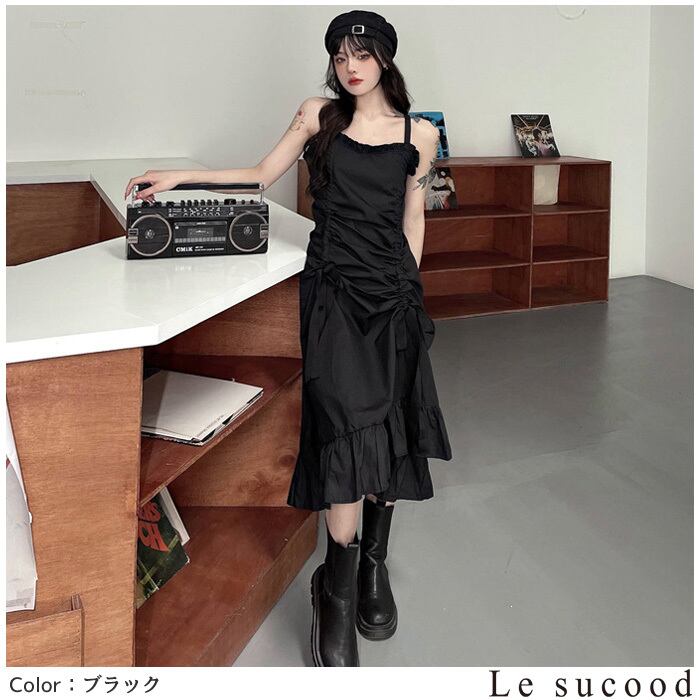 【Le sucood】【お支払い確認後20日以内発送】シャーリングフリルキャミワンピース キャミソール ノースリーブ ひざ丈 スリット 変形 アシメシンプル 無地 大人ワンピ フェミニン カジュアル セクシー レディース モード系 ストリート 原宿系 青文字系 | Le sucood