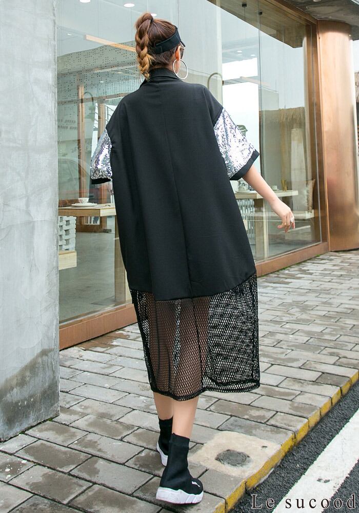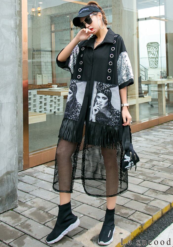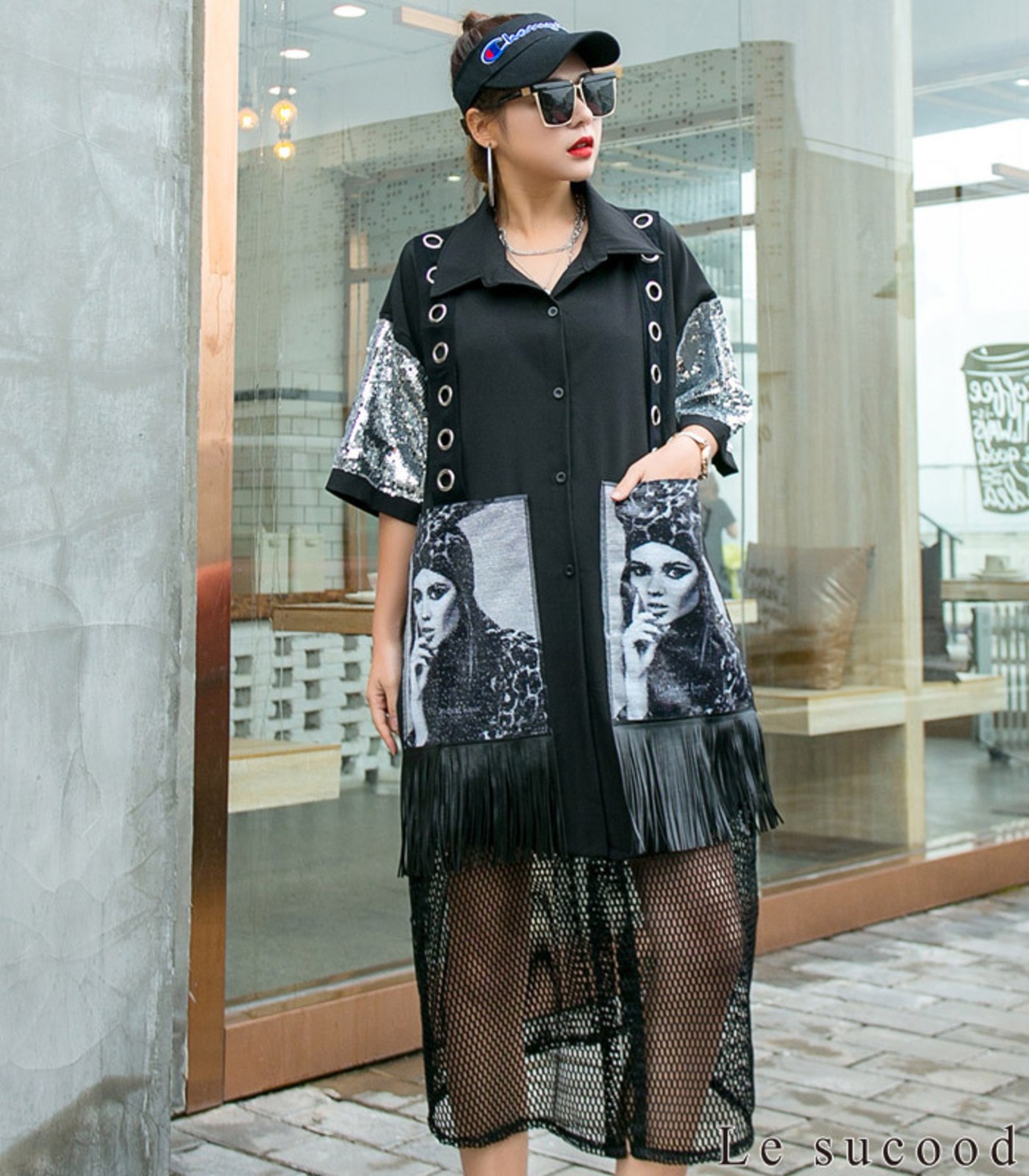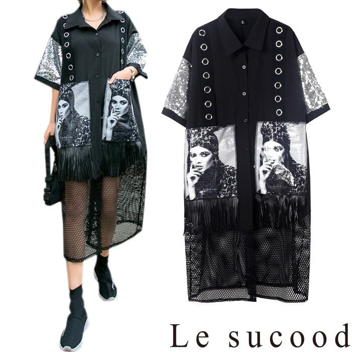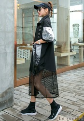 【Le sucood】【お支払い確認後20日以内発送】スパンコールメッシュ異素材シャツワンピース シャツワンピース 半袖 切り替え 変形 ゆったり フリンジ ミモレ丈 ロング丈 シャツチュニック 異素材MIX カジュアル 個性的 レディース モード系 ストリート 原宿系 青文字系 | Le sucood