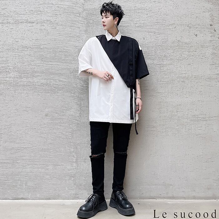 【Le sucood】【お支払い確認後20日以内発送】アシメ変型レイヤードシャツ 切り替え 変形 アシンメトリー バイカラー シャツ ツートンカラー モノトーン 半袖 5分袖 ゆったり 無地 トップス メンズ モード系 個性的 ストリート 原宿系 青文字系