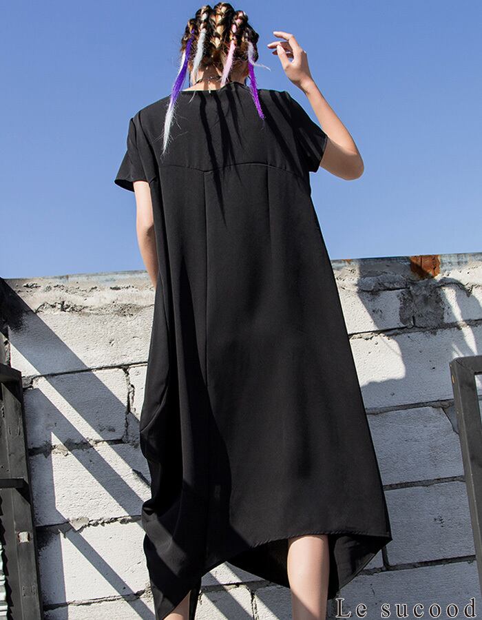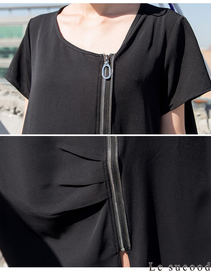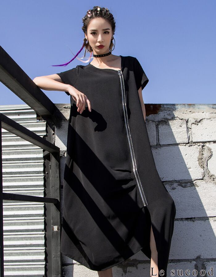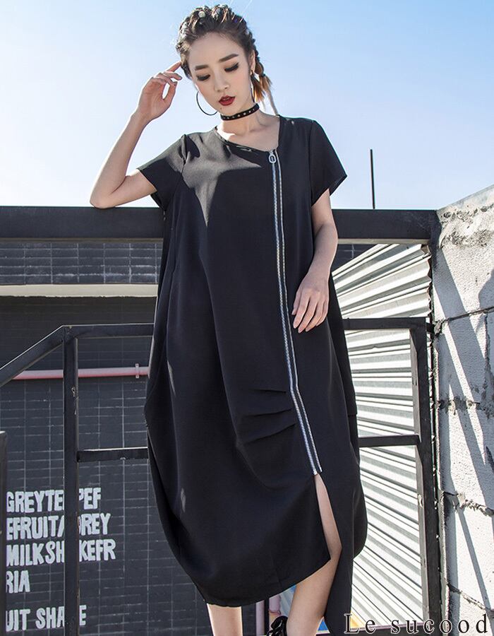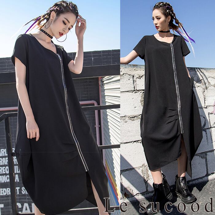 【Le sucood】【お支払い確認後20日以内発送】ジップコクーンワンピース 変形 アシメ ボリュームシルエット ワンピ Aライン ミモレ丈 ロング丈 クルー ネック スリット カジュアル 楽ちん お洒落 きれいめ モード系 半袖 アシメワンピ レディース ストリート系 シャツワンピ 個性的 韓国 ファッション | Le sucood