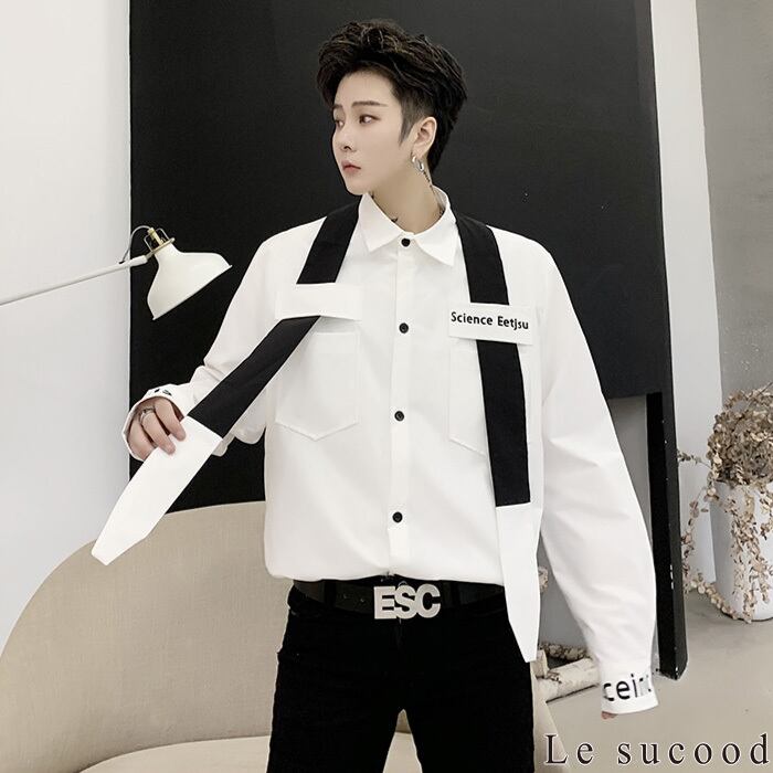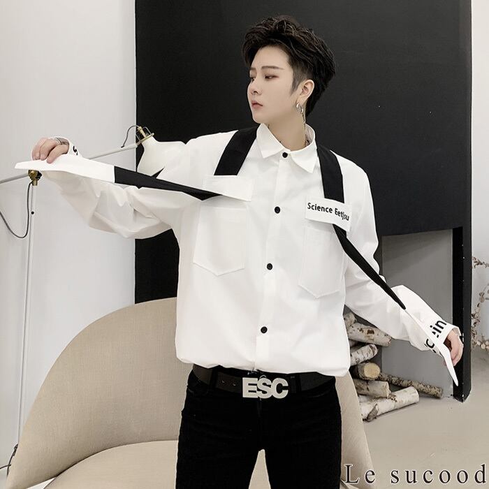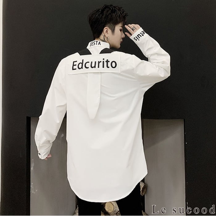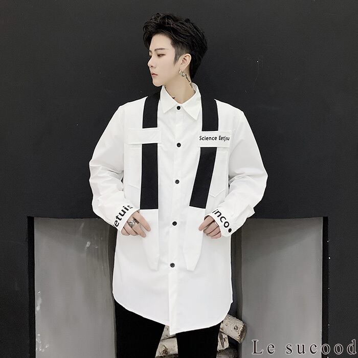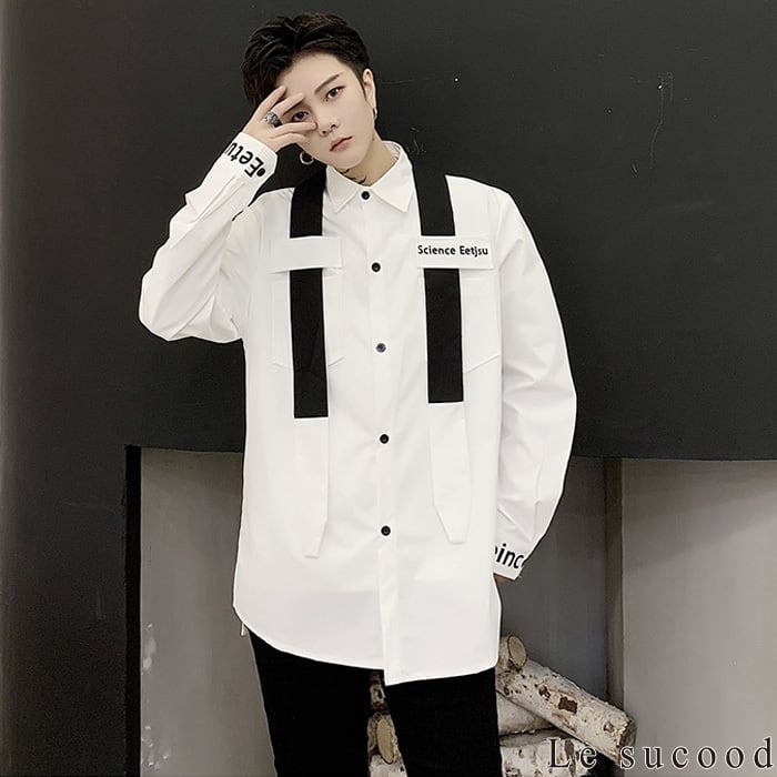 【Le sucood】【お支払い確認後20日以内発送】パーソナリティレターシャツ ストラップシャツ 長袖 白シャツ デザインシャツ ロングシャツ ビッグポケット 変形 レギュラーカラー トップス カジュアルシャツ バイカラーシャツ ブラウス 個性的 メンズ モード系 ストリート 原宿系 青文字系 | Le sucood