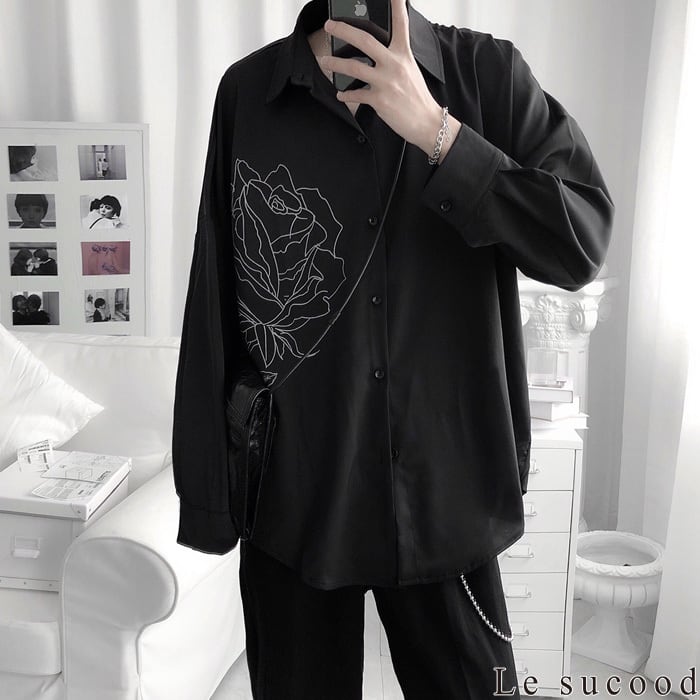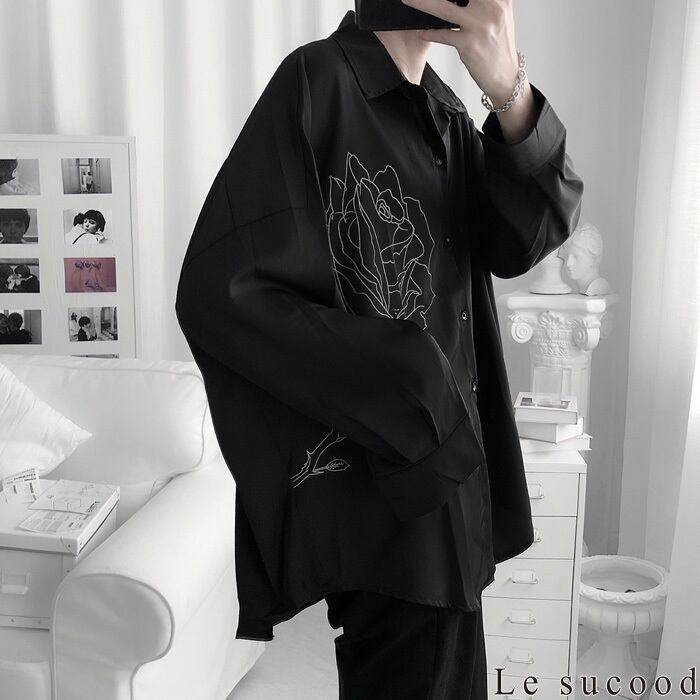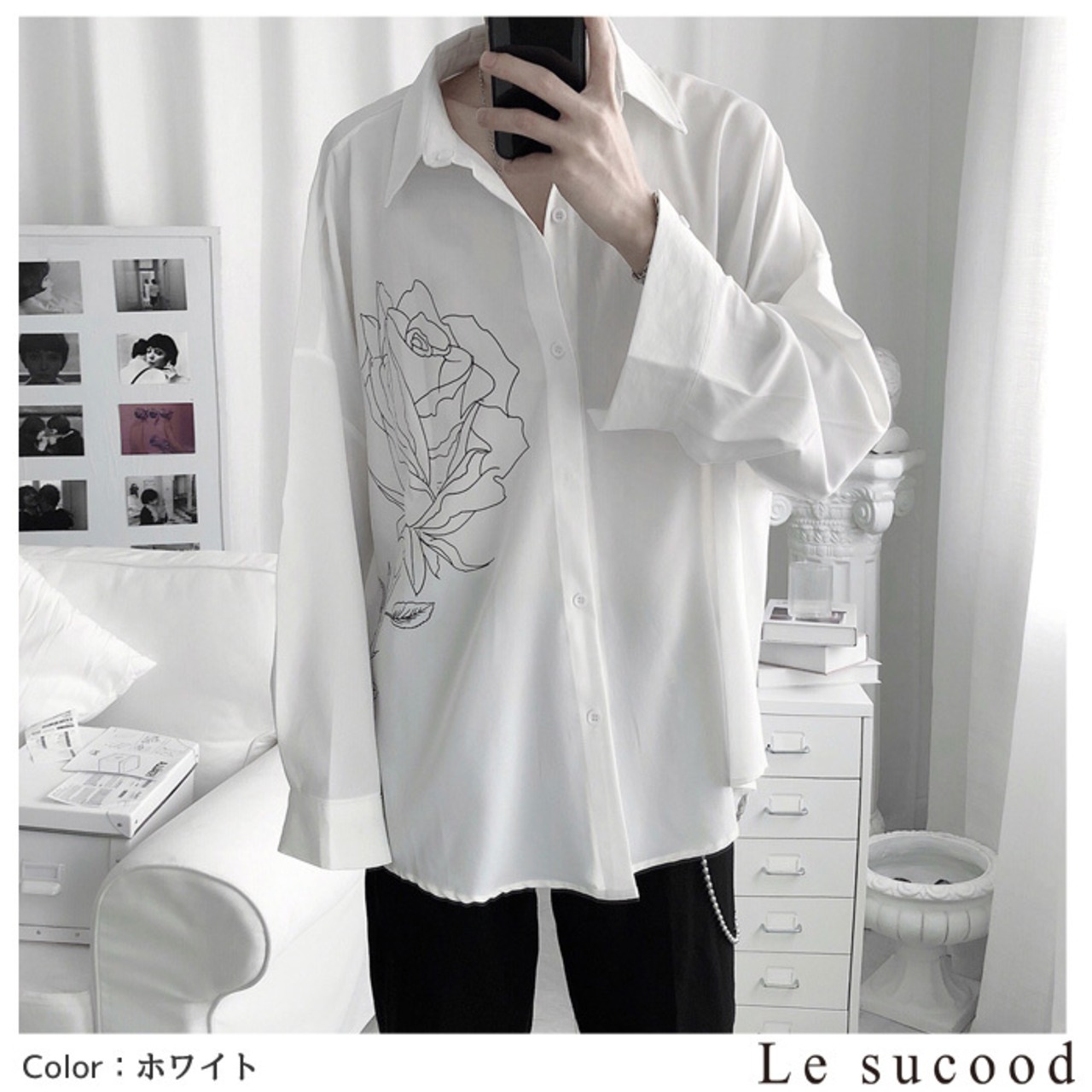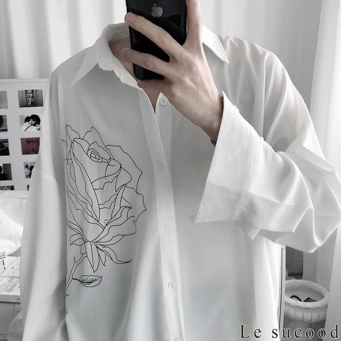 【Le sucood】【お支払い確認後20日以内発送】シンプルローズシャツ オーバーサイズ ゆったり ビッグシャツ ビッグシルエット 長袖 デザインシャツ ダボシャツ レギュラーカラー ドロップショルダー カジュアルシャツ ストリートモード ブラウス 個性的 メンズ モード系 ストリート 原宿系 青文字系 | Le sucood