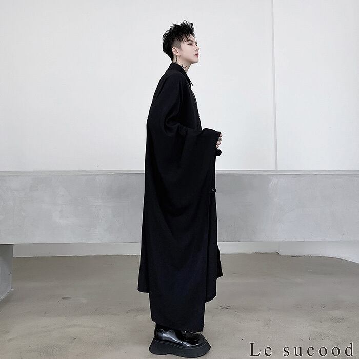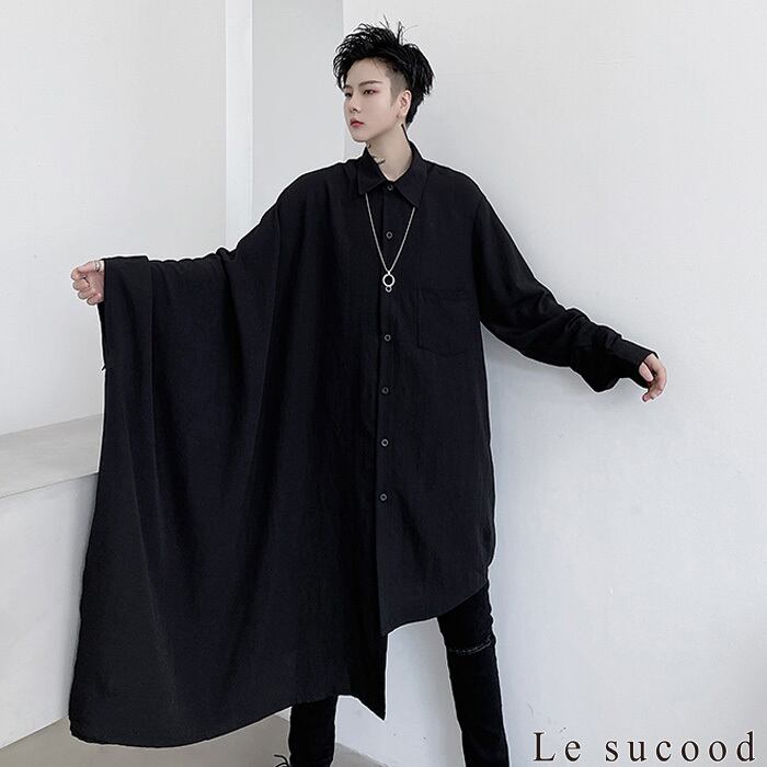【Le sucood】【お支払い確認後20日以内発送】ブラックアシメ変形ロングシャツ ロングシャツ シャツワンピ マントシャツ ビッグシャツ ケープシャツ ポンチョ オーバーサイズ ゆったり ダボシャツ ボリューム袖 長袖 モノトーン ストリートモード 個性的 メンズ モード系 ストリート 原宿系 青文字系 | Le sucood