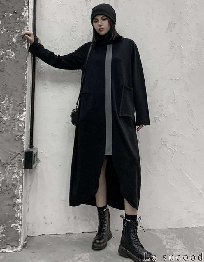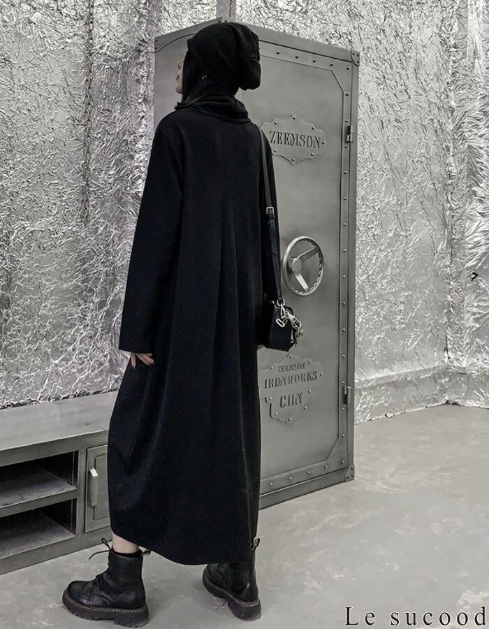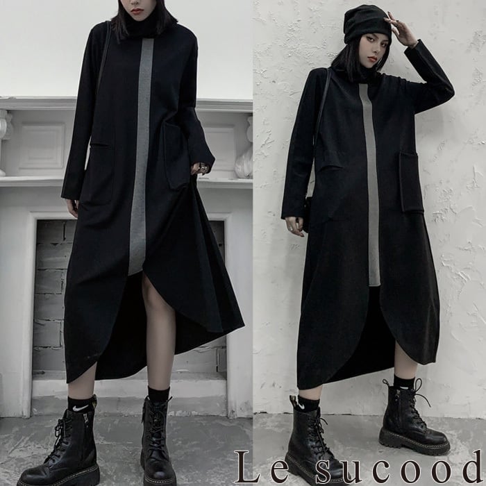 【Le sucood】【お支払い確認後20日以内発送】ラウンドカットタートルネックワンピ ハイネック ロングワンピ オールインワン ミモレ丈 ロング丈 切り替え モノトーン 無地 個性的 長袖 大人可愛い 大人カジュアル ナチュラル きれいめ シンプル 原宿系 ガーリー 青文字系 レディース モード系 ファッション | Le sucood