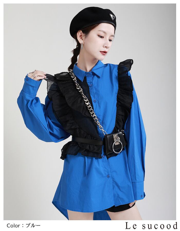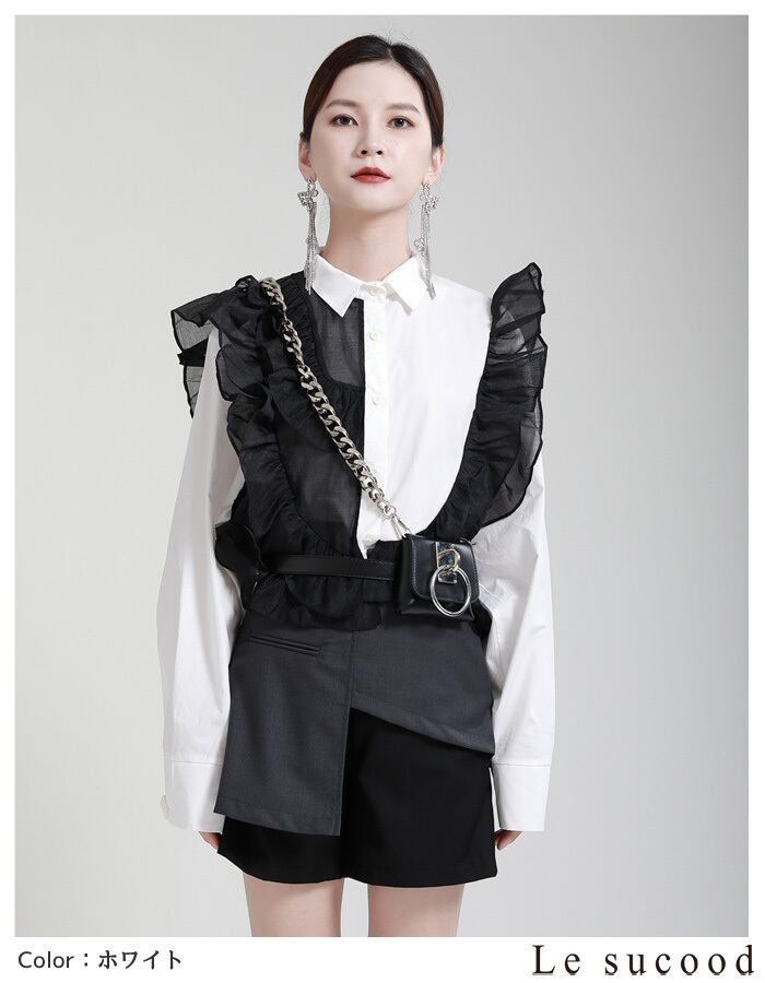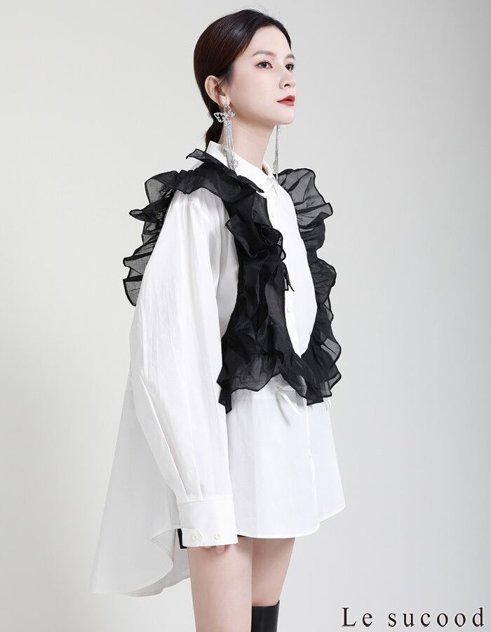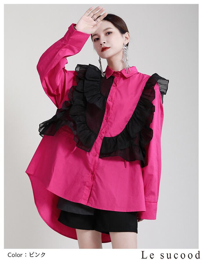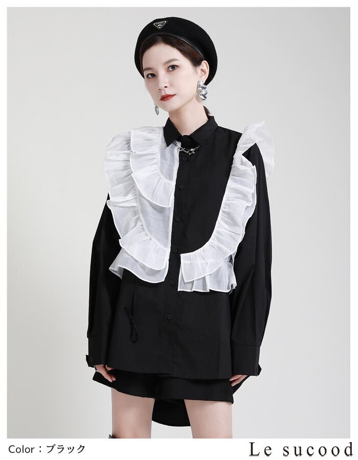 【Le sucood】【お支払い確認後20日以内発送】アシンメトリーフリルシャツ フリルブラウス 変形 アシメシャツ ゆったり ルーズシルエット ボリューム袖 ブラウス 長袖 個性的 エレガント レトロ モダン フェミニン 大人可愛い 大人カジュアル 原宿系 ガーリー 青文字系 レディース モード系 ファッション