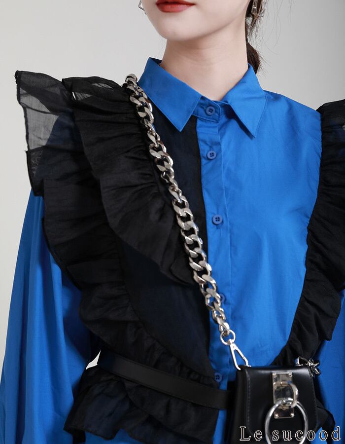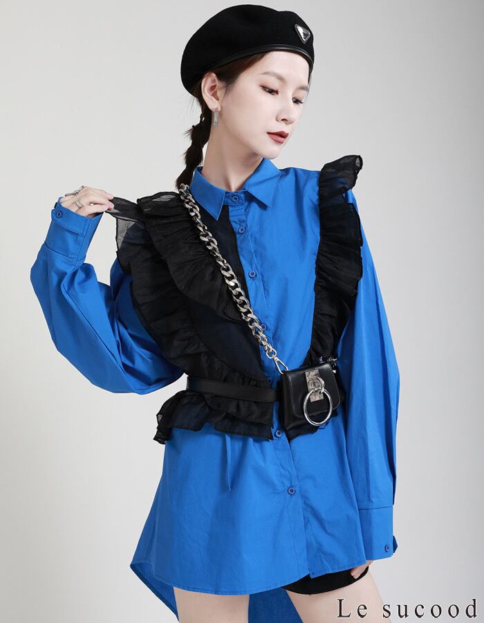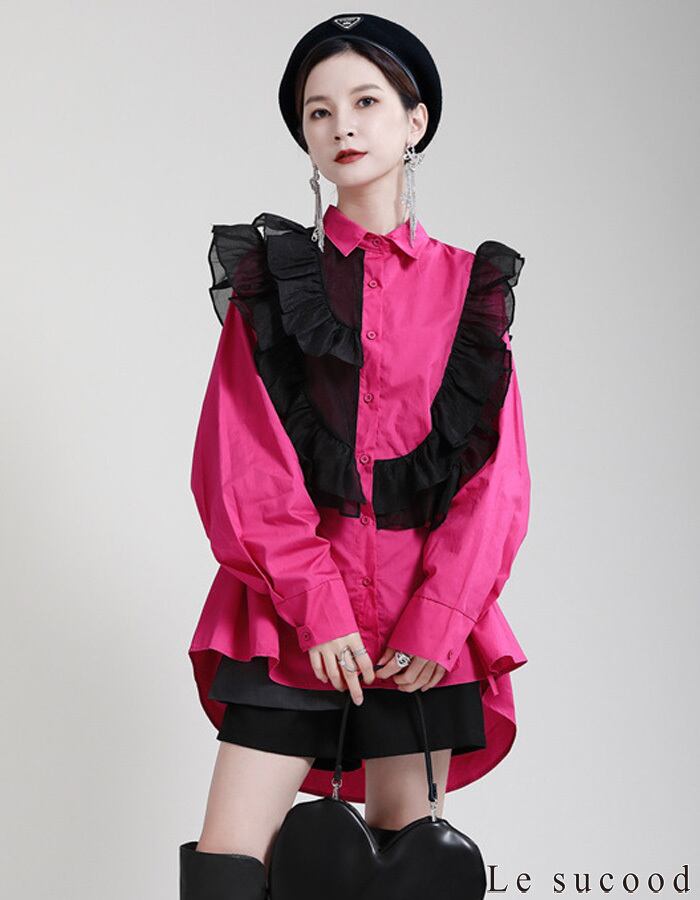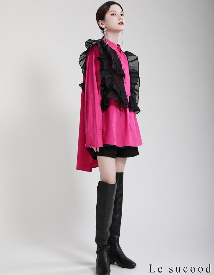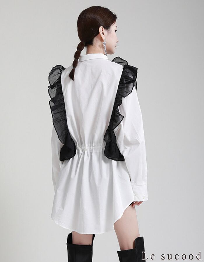 【Le sucood】【お支払い確認後20日以内発送】アシンメトリーフリルシャツ フリルブラウス 変形 アシメシャツ ゆったり ルーズシルエット ボリューム袖 ブラウス 長袖 個性的 エレガント レトロ モダン フェミニン 大人可愛い 大人カジュアル 原宿系 ガーリー 青文字系 レディース モード系 ファッション