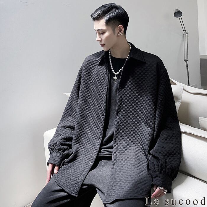 【Le sucood】【お支払い確認後20日以内発送】ドットエンボスシャツジャケット ビッグシャツ オーバーサイズ デザインシャツ ゆったり 羽織り ダボシャツ 長袖シャツ モノトーン ドロップショルダー ボリューム袖 ロングシャツ モードストリート カジュアル個性的 ストリート モード系 原宿系 メンズ | Le sucood