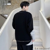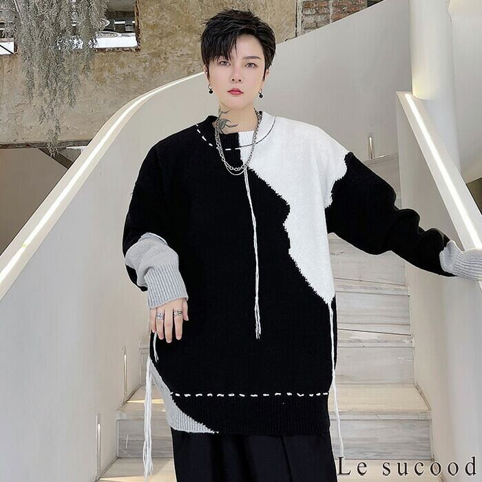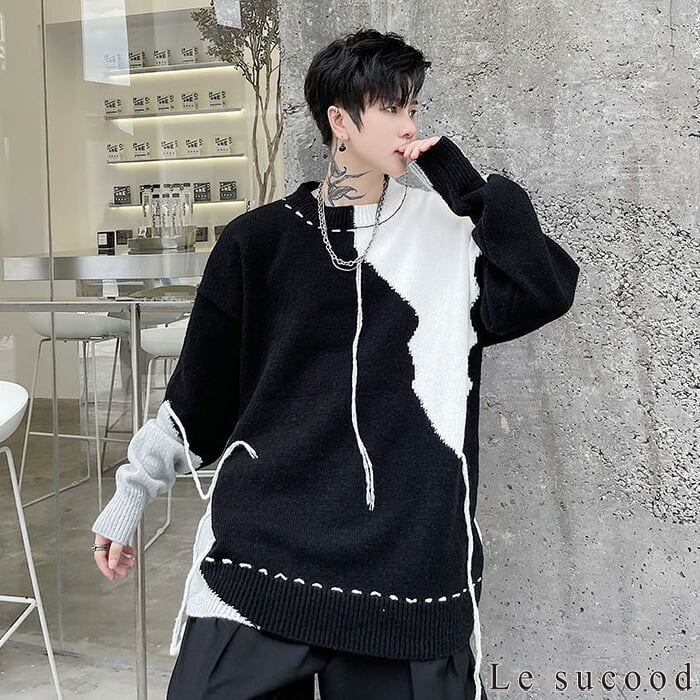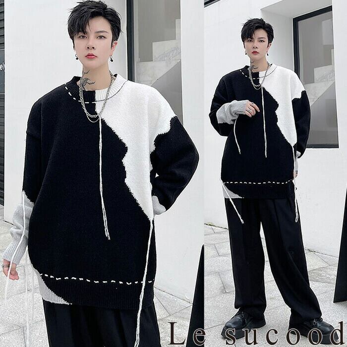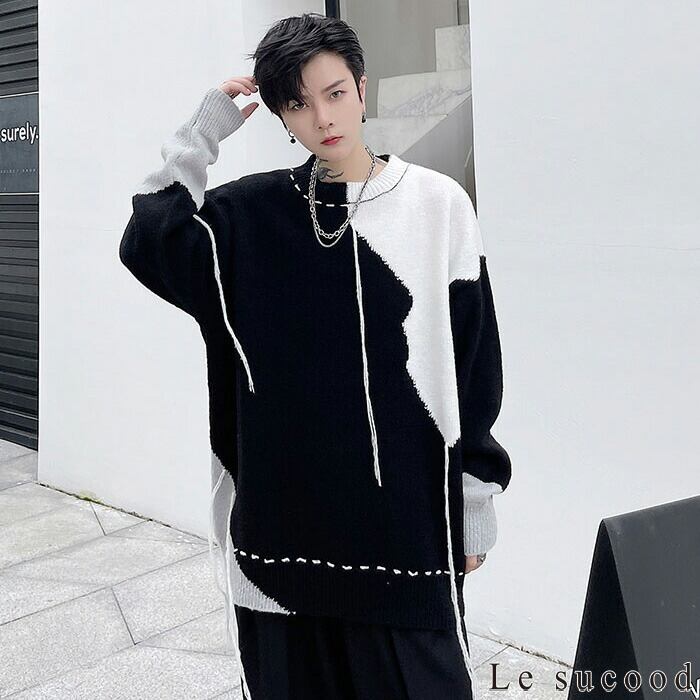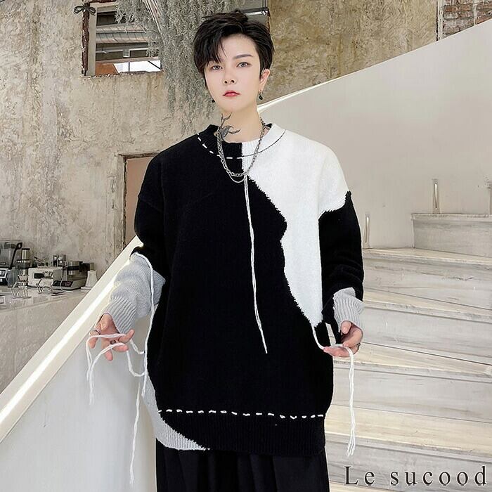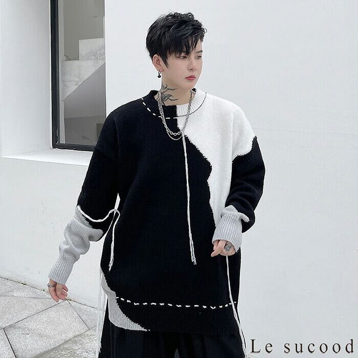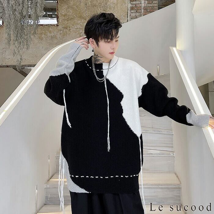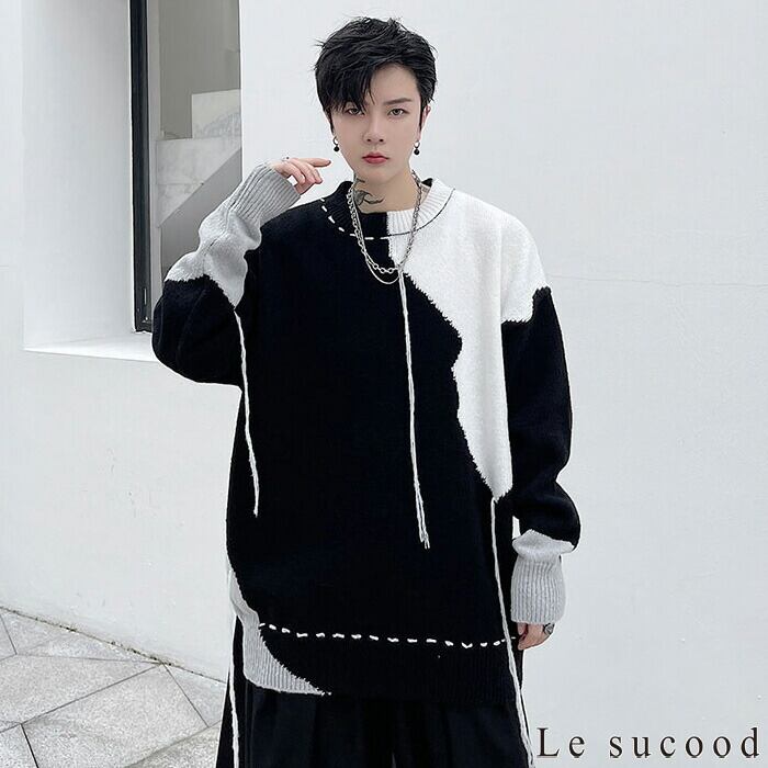 【Le sucood】【お支払い確認後20日以内発送】モノクロフリンジニット クルーネックニット デザインニット ドロップショルダー 総柄 切り替え ステッチ オーバーサイズ ゆったり モノトーン カジュアル きれいめ トップス 長袖 メンズ ストリート モード系 個性的 原宿系 青文字系 | Le sucood