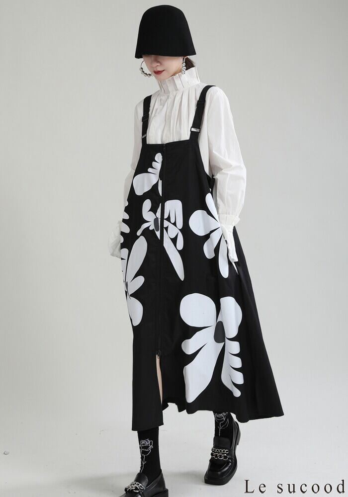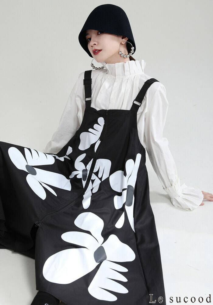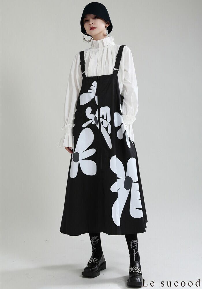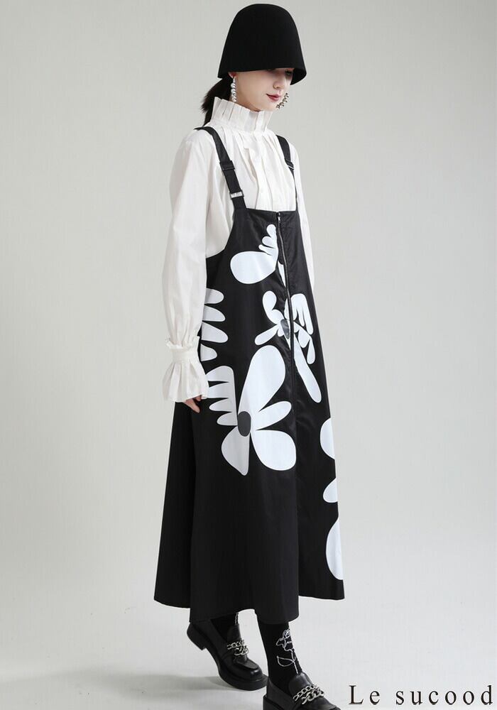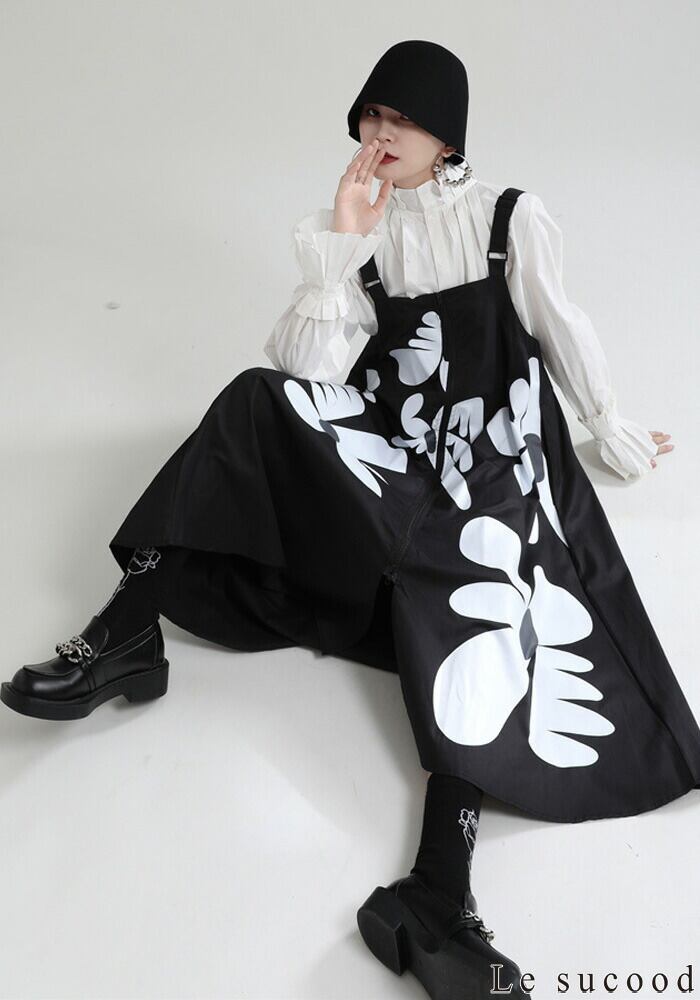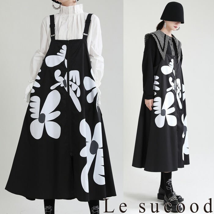 【Le sucood】【お支払い確認後20日以内発送】ビッグフラワージャンパースカート 花柄 モノトーン Aライン フレアスカート ゆったり エプロンドレス ジャンスカ ロングスカート サロペットスカート ロング丈 ミモレ丈 大人カジュアル 大人可愛い レディース モード系 個性的 ストリート 原宿系 青文字系 | Le sucood
