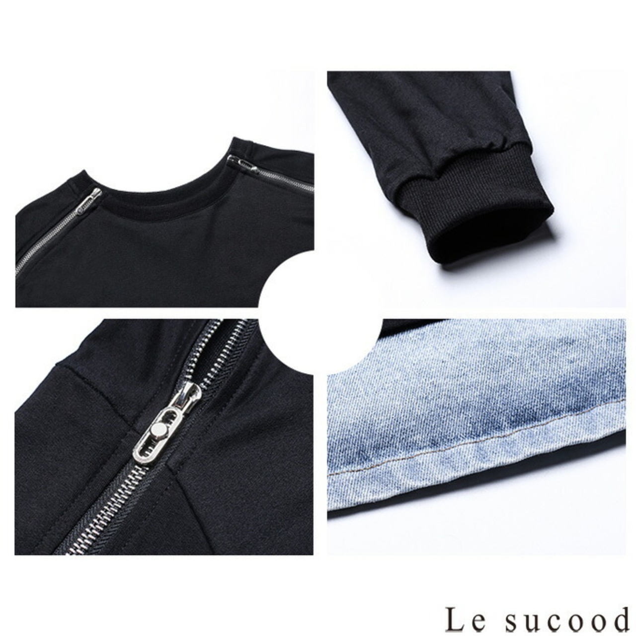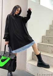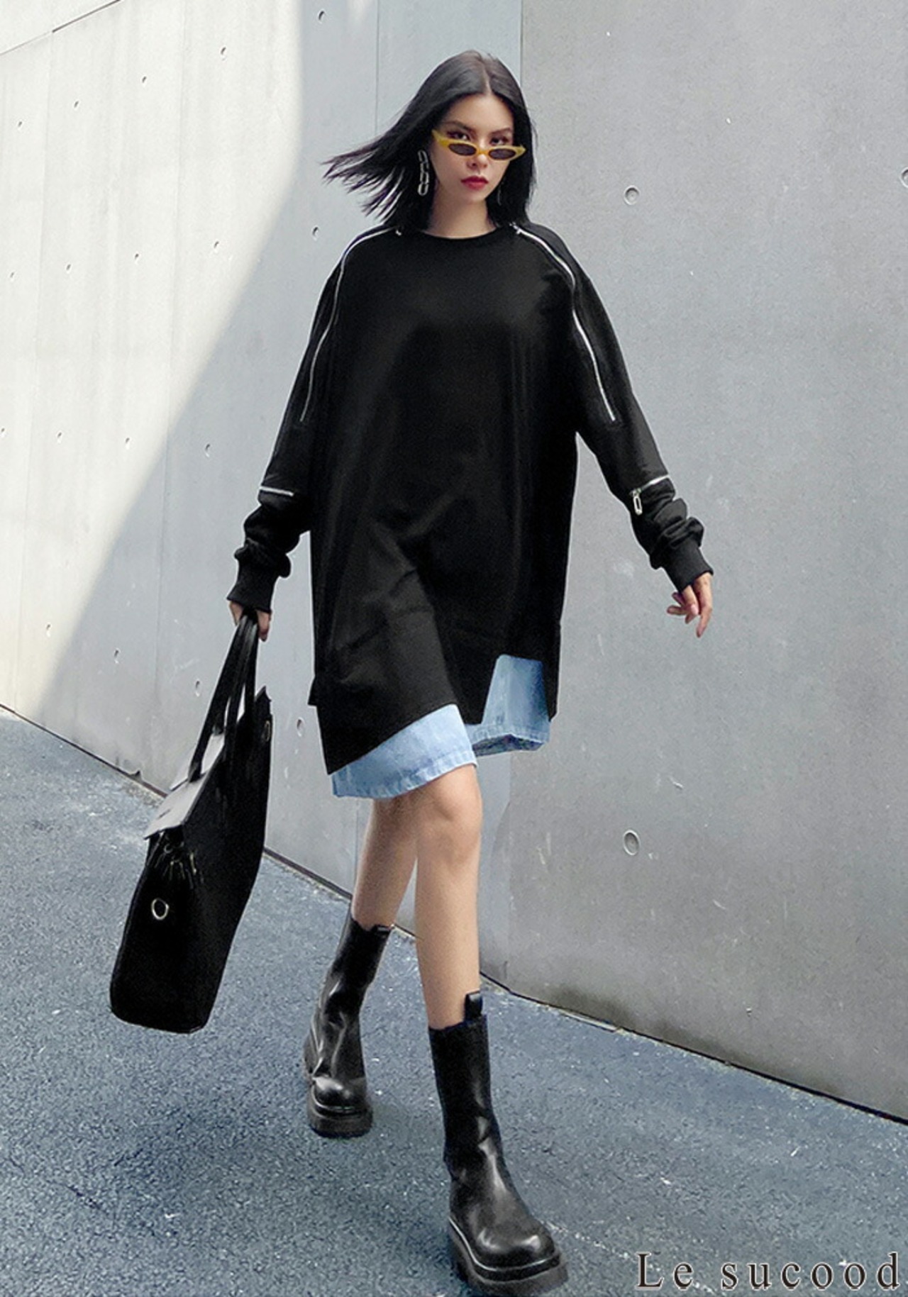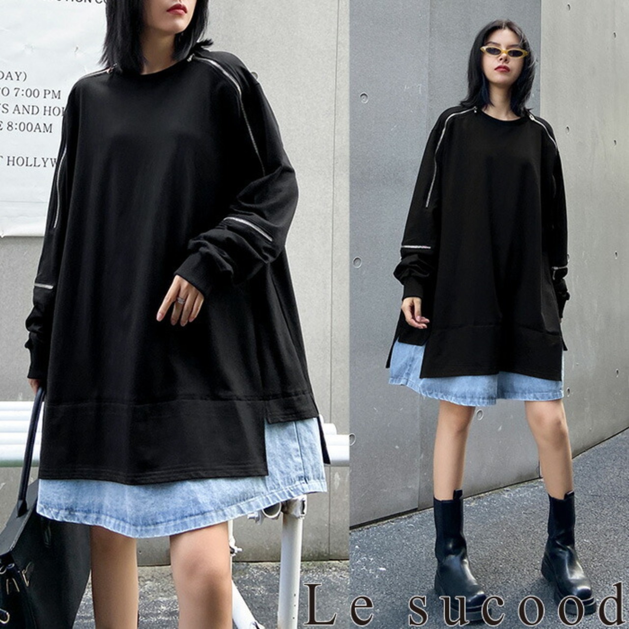 【Le sucood】【お支払い確認後20日以内発送】デニム切り替えロングジップTシャツ Tシャツワンピ ロングTシャツ ロングワンピ ラグランワンピ 変形 オーバーサイズ ゆったり レーヤードデザイン ミニ丈 膝上丈 大人カジュアル 大人可愛い ガーリー レディース モード系 個性的 ストリート 原宿系 青文字系 | Le sucood