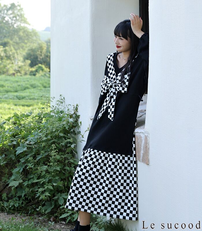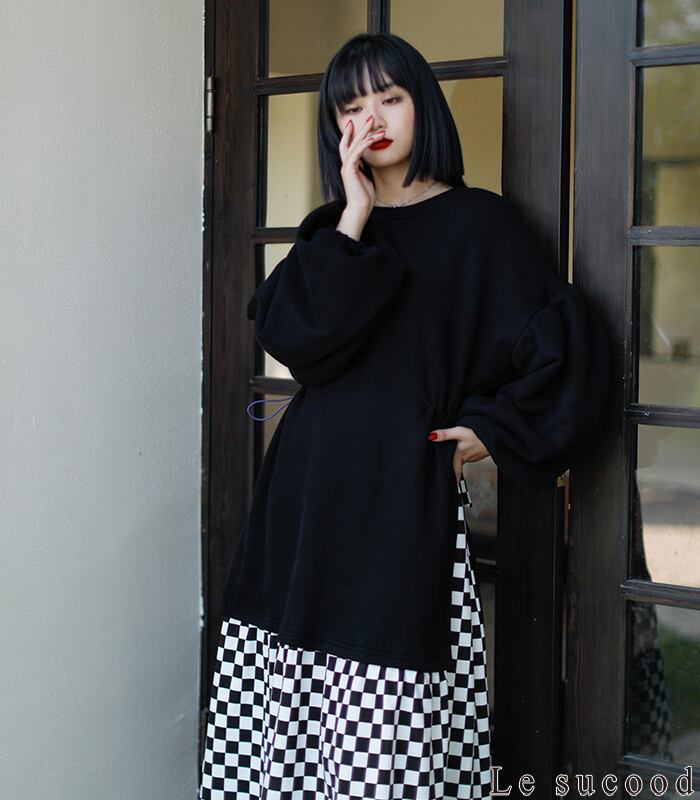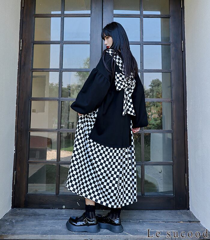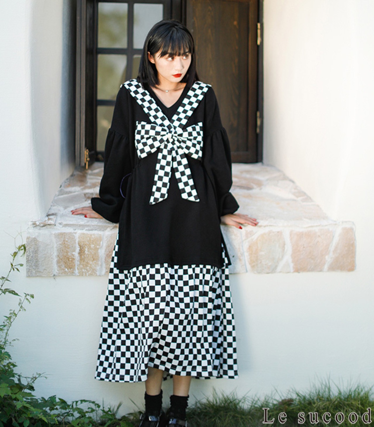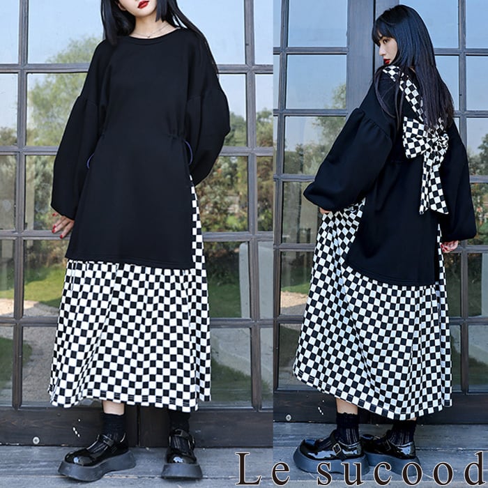 【Le sucood】【お支払い確認後20日以内発送】レイヤード風チェッカーリボンワンピース ロングワンピ 切り替え チュニックワンピース Aライン ドロップショルダー ボリューム袖 バルーンスリーブ オーバーサイズ ゆったりミモレ丈 長袖 ガーリー レディース モード系 個性的 ストリート 原宿系 青文字系 | Le sucood