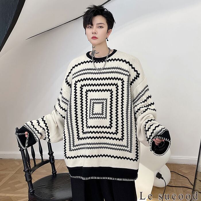 【Le sucood】【お支払い確認後20日以内発送】スクエアステッチセーター クルーネック ざっくりニット グラフィック 幾何学模様 デザインニット プルオーバー ボリューム袖 オーバーサイズ ゆったり ドロップショルダー カジュアル トップス 長袖 メンズ ストリート モード系 個性的 原宿系 青文字系 | Le sucood