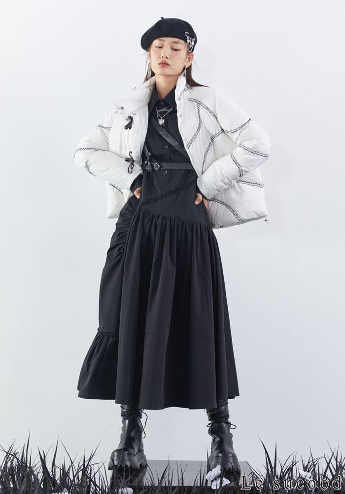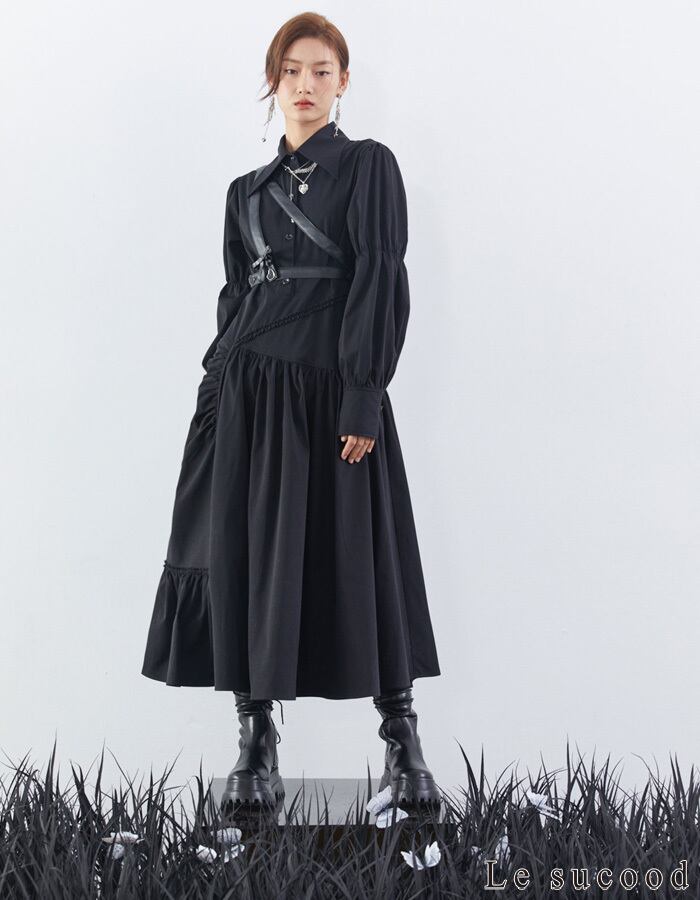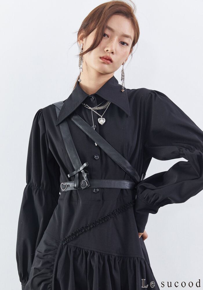 【Le sucood】【お支払い確認後20日以内発送】リボンベルトアシメブラックワンピース シャツワンピ ギャザーワンピース ハイウエスト シャーリングワンピース デザインワンピ ボリューム袖 パフスリーブ Aライン 変形 長袖 レディース カジュアル モード系 個性的 ストリート 原宿系 青文字系 | Le sucood
