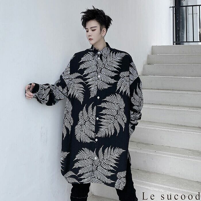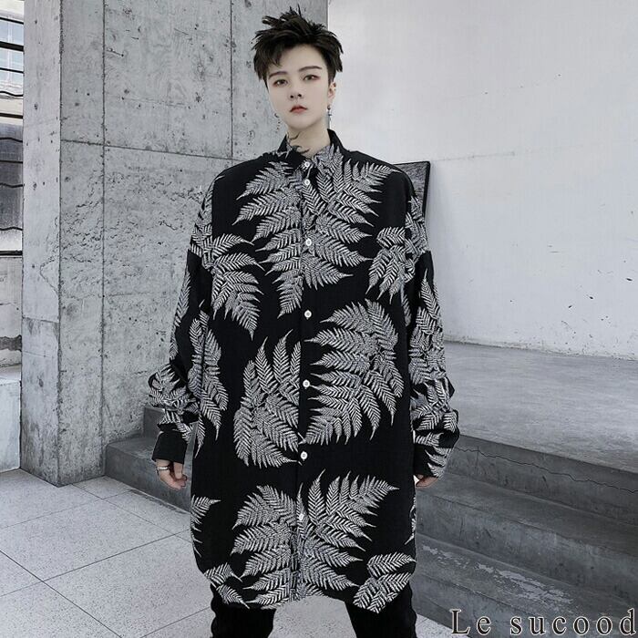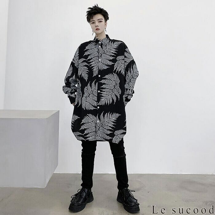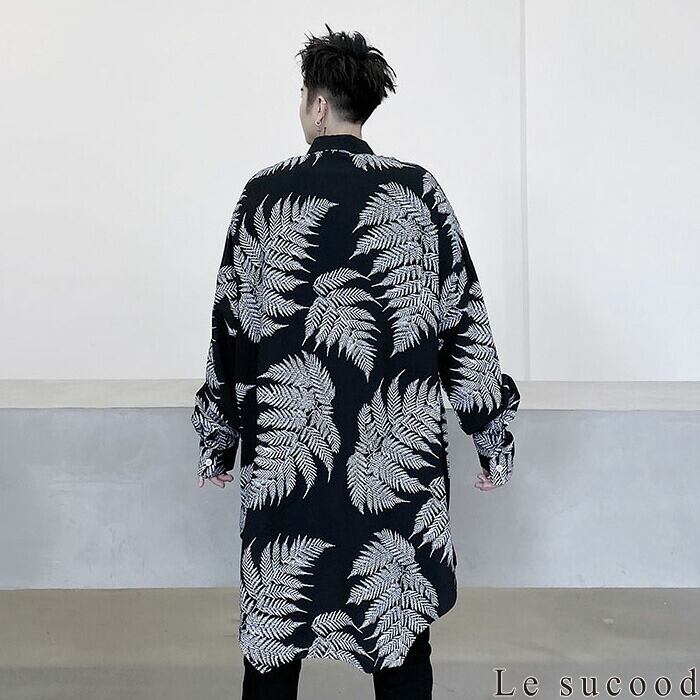 【Le sucood】【お支払い確認後20日以内発送】ボタニカルロングシャツ シャツワンピース オーバーシャツ ゆったり ビッグシルエット モノトーン レギュラーカラー ルーズシルエット ロング丈 カジュアル トップス 羽織り 長袖 オシャレ きれいめ メンズ ストリート モード系 個性的 原宿系 青文字系