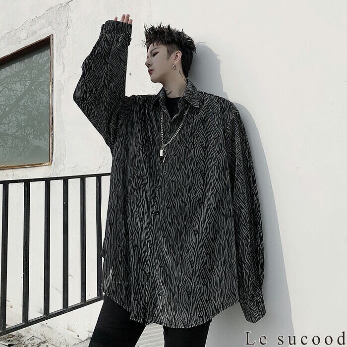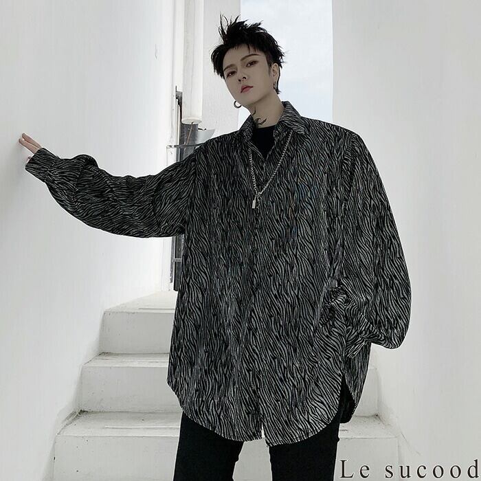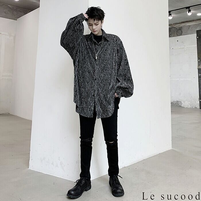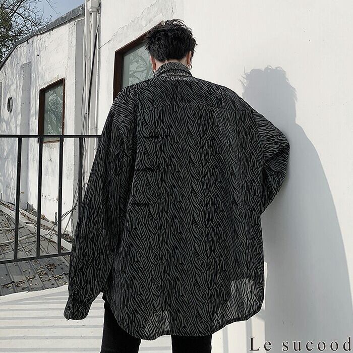【Le sucood】【お支払い確認後20日以内発送】ゼブラベロアシャツ 柄シャツ 総柄 アニマル柄 ボリューム袖 ドロップショルダー ゆったり ビッグシルエット モノトーン ルーズシルエット カジュアル トップス 羽織り 長袖 オシャレ きれいめ メンズ ストリート モード系 個性的 原宿系 青文字系 | Le sucood