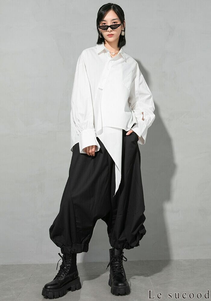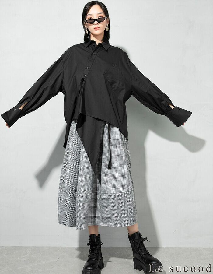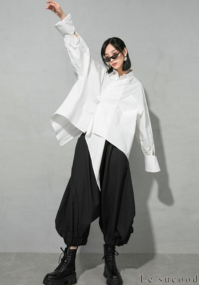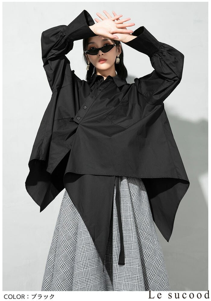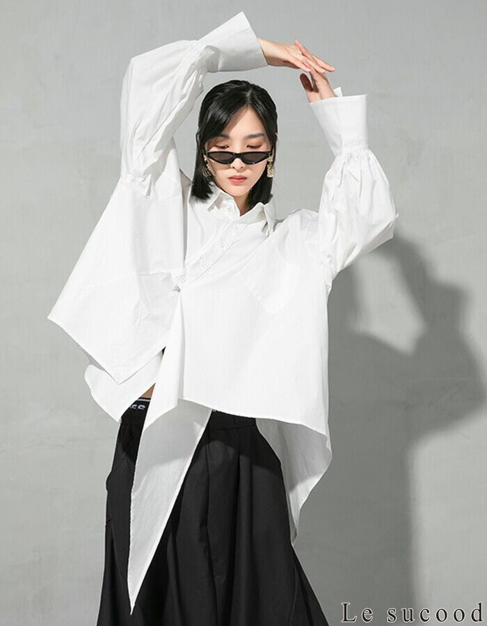 【Le sucood】【お支払い確認後20日以内発送】斜めボタンアシンメトリーシャツ ロングシャツ イレヘムシャツ アシメシャツ ドロップショルダー ロングカフス 変形 ビッグシャツ テールカット カジュアル トップス ブラウス 長袖 オシャレ きれいめ レディース ストリート モード系 個性的 原宿系 青文字系 | Le sucood