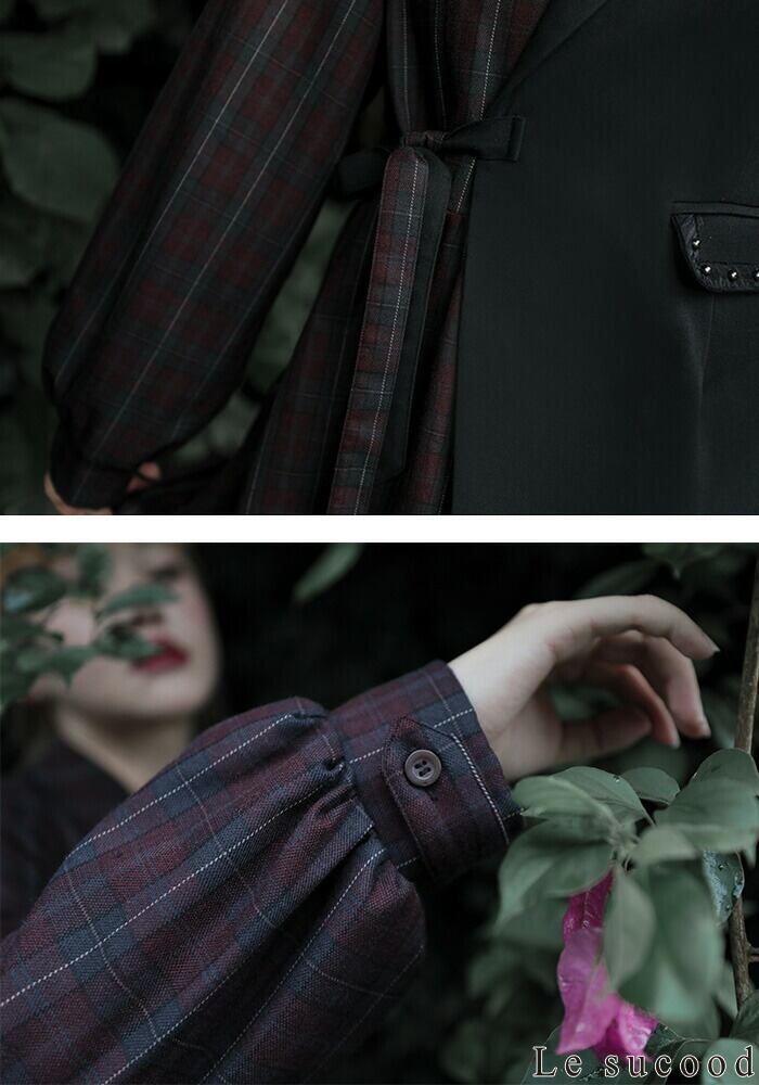 【Le sucood】【お支払い確認後20日以内発送】ダークチェックアシメワンピース ジャケットワンピース ミモレ丈 ひざ下丈 Vネックワンピース チェックワンピース ドッキングワンピース 変形 アシメデザイン Aライン 長袖 きれいめ フェミニン レディース ストリート モード系 個性的 原宿系 青文字系