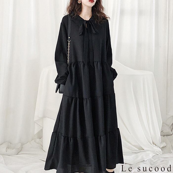 【Le sucood】【お支払い確認後20日以内発送】黒無地ティアードワンピース ロングワンピ フレアワンピ ロング丈 リボンワンピ Aライン ゆったり ボリューム袖 ミモレ丈 ひざ下丈 長袖 大人カジュアル 大人可愛い きれいめ フェミニン レディース ストリート モード系 個性的 原宿系 青文字系