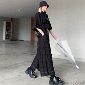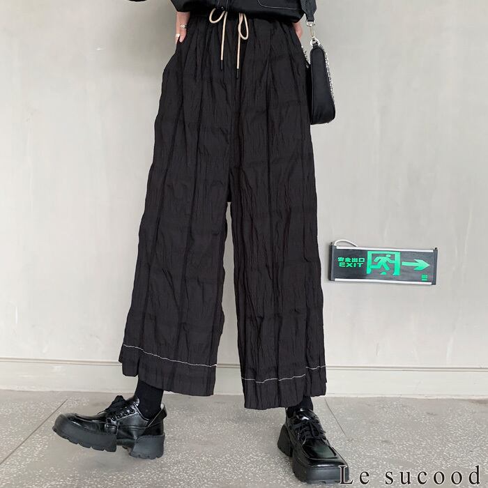 【Le sucood】【お支払い確認後20日以内発送】ルーズリンクルワイドレッグパンツ ガウチョパンツ スカーチョ タイパンツ ワイドパンツ ワイドシルエット 袴パンツ イージーパンツ クロップドパンツ ゆったり 個性的 ボトムス カジュアル 無地 レディース モード系 ストリート 原宿系 青文字系 | Le sucood