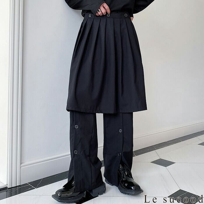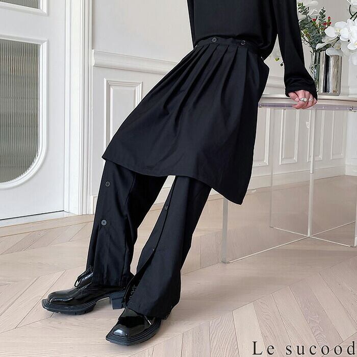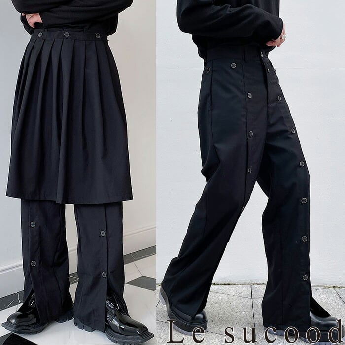 【Le sucood】【お支払い確認後20日以内発送】プリーツラップ風ボタンスリットパンツ エプロンパンツ フロントスリットパンツ ワイドパンツ ロングパンツ ストレートパンツ ワークパンツ デザインパンツ ワイドシルエット 変形 個性的 ゆったり カジュアル メンズ モード系 ストリート 原宿系 青文字系 | Le sucood