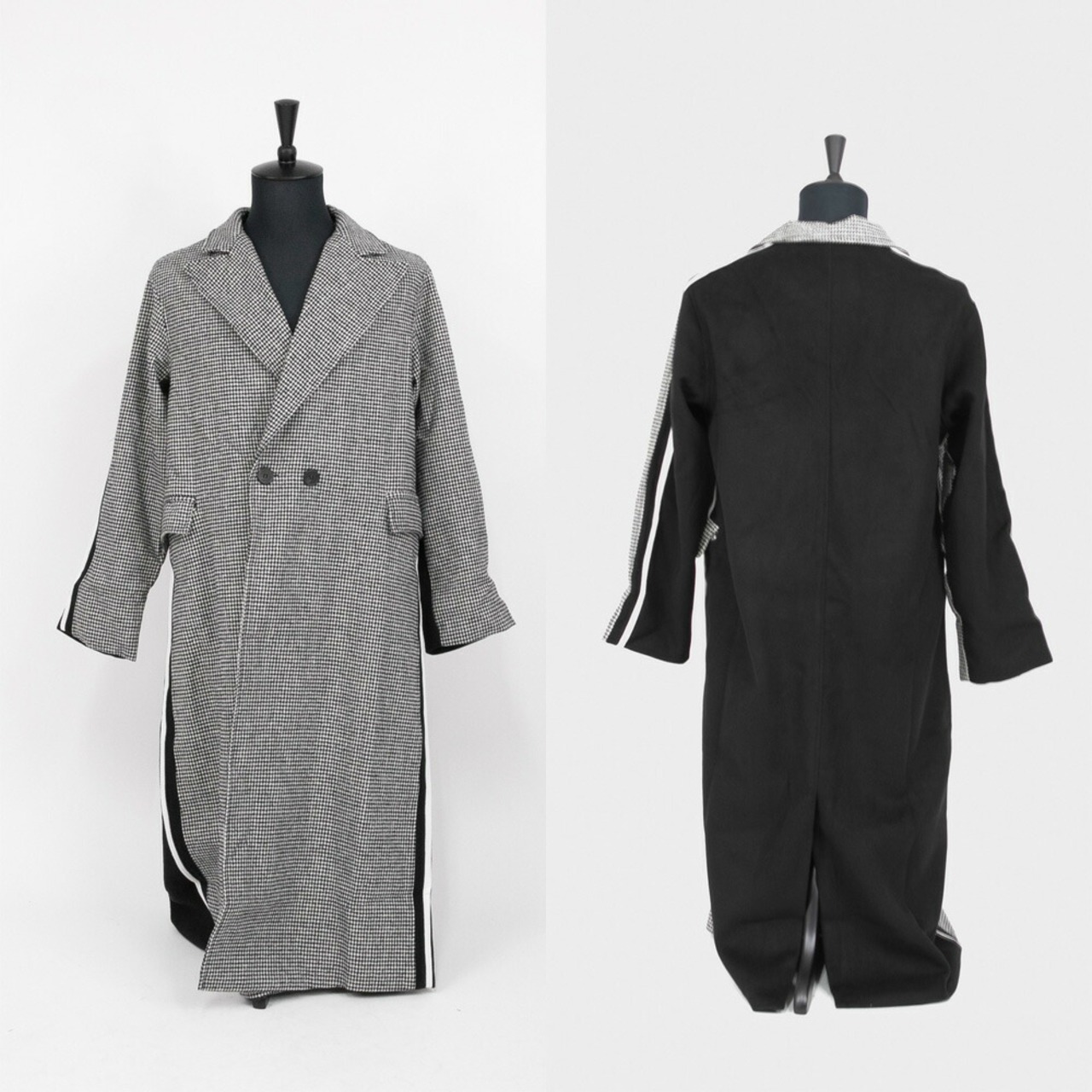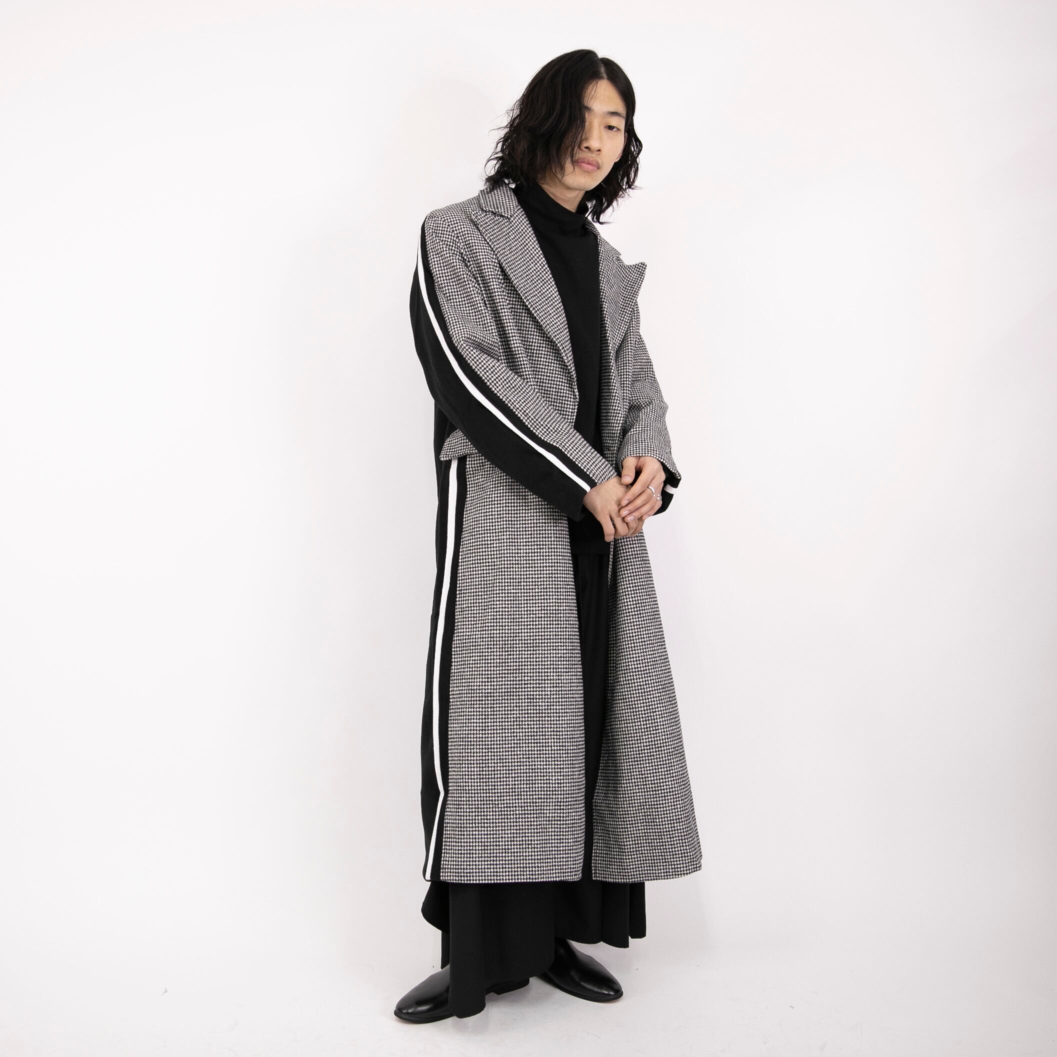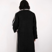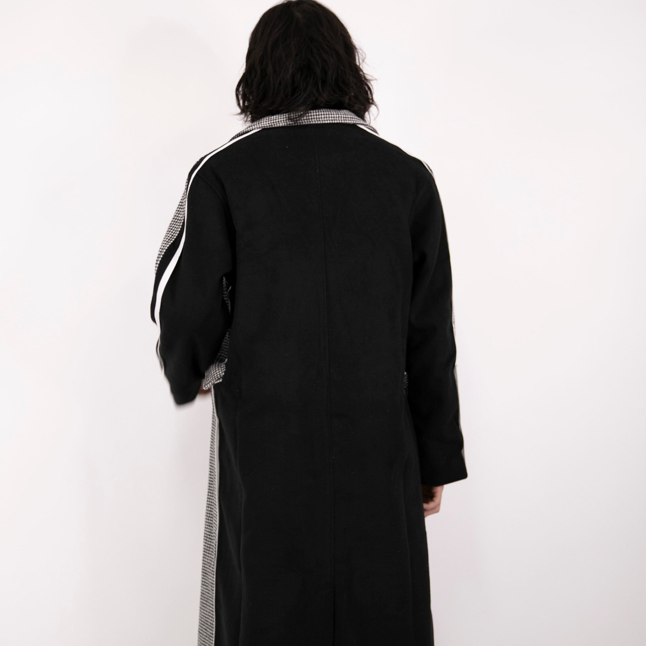 前はチェック、後ろは無地のブラックと、前後で異なる印象を魅せてくれるロングコート。