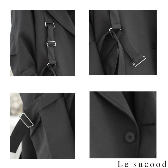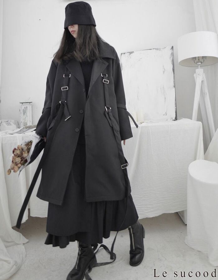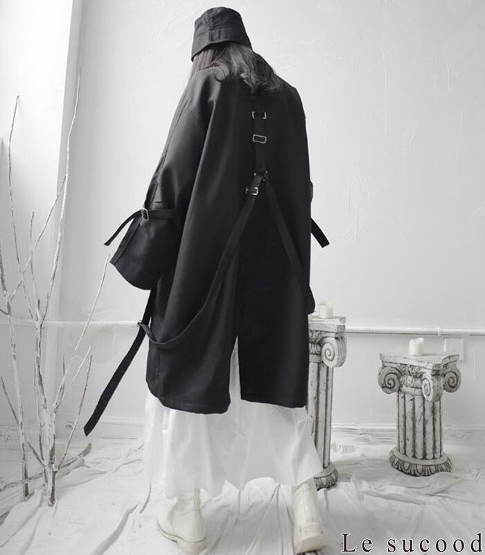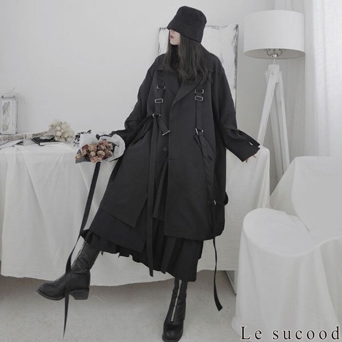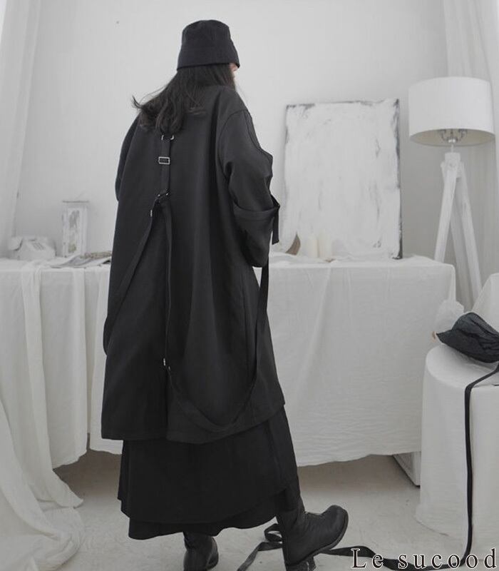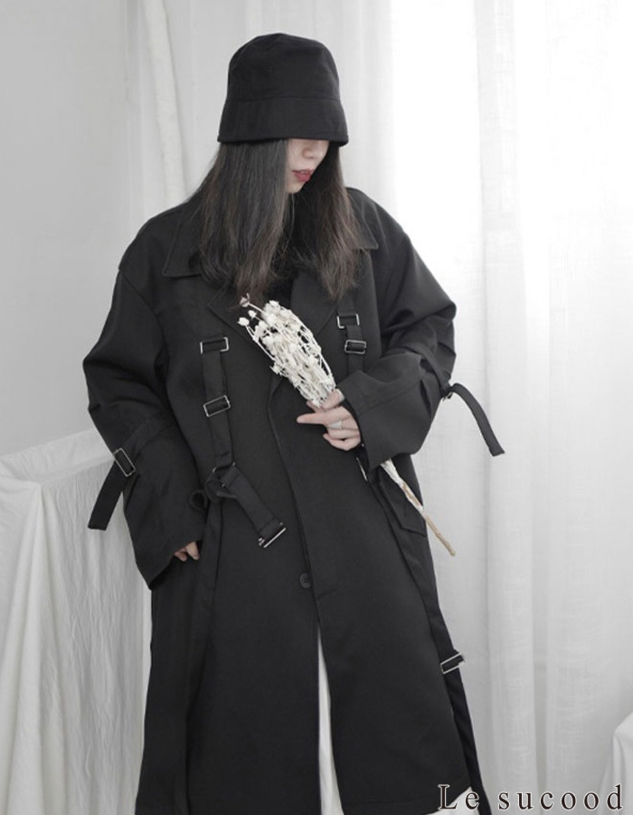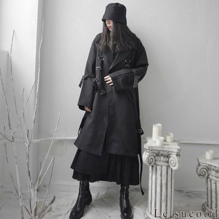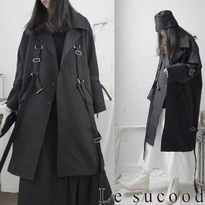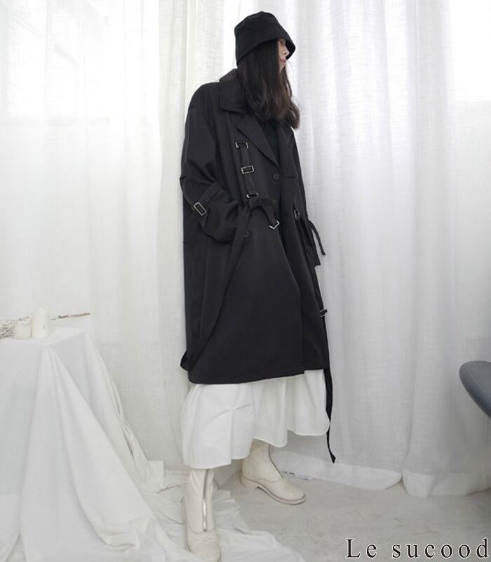 【Le sucood】【お支払い確認後20日以内発送】ビッグシルエットベルトブラックコート オーバーサイズ ビッグシルエット ゆったり ロングコート 羽織 トレンチコート ミリタリーコート ドロップショルダー モノトーン モード きれいめ 個性的 青文字系 レディース モード系 ストリート ファッション | Le sucood
