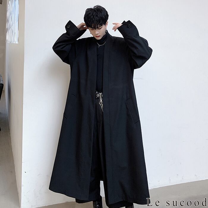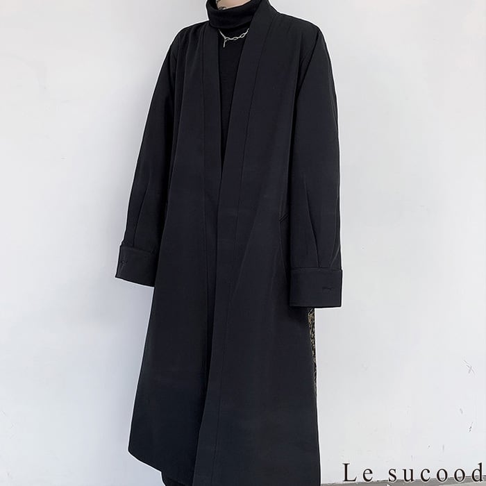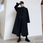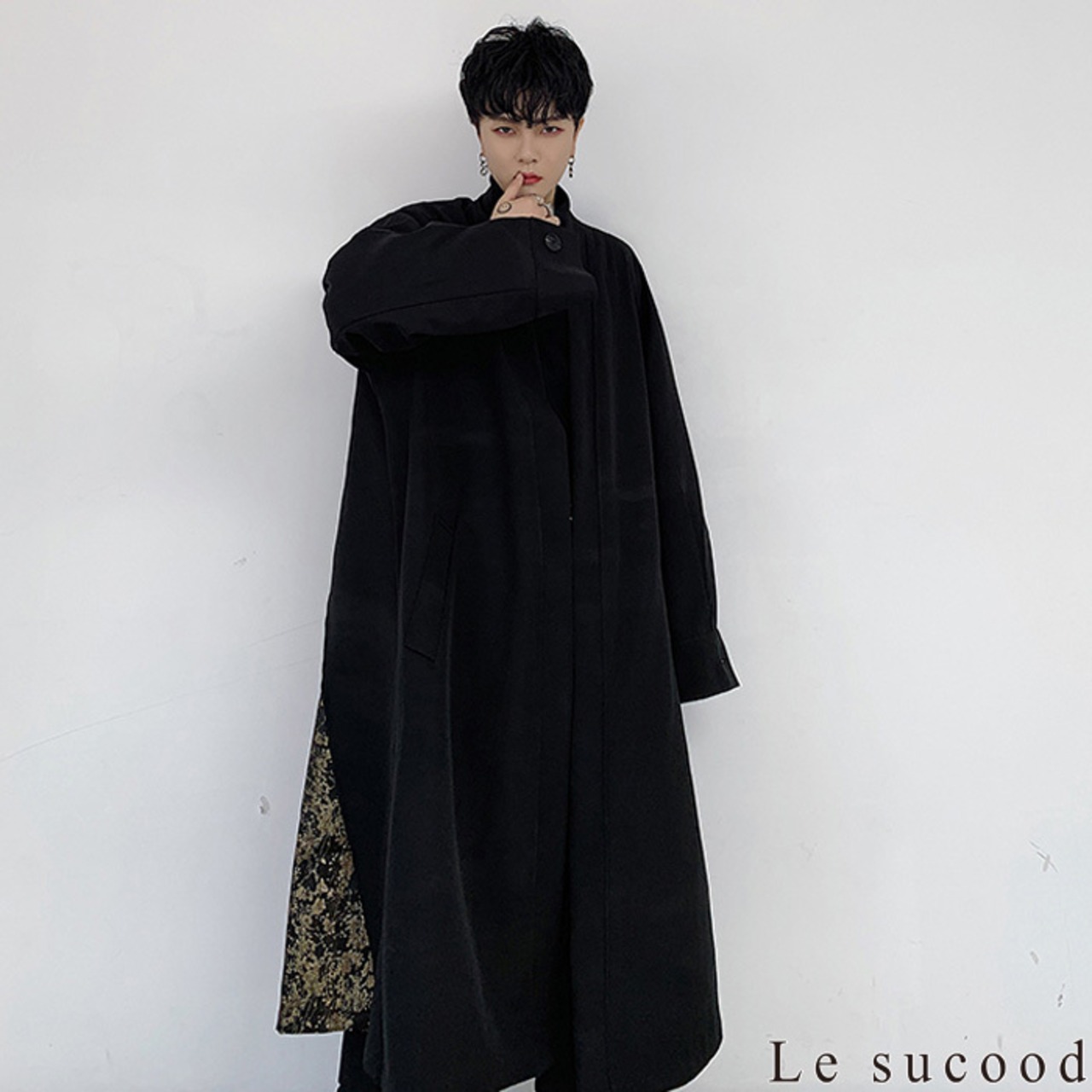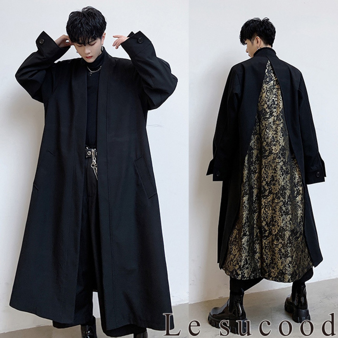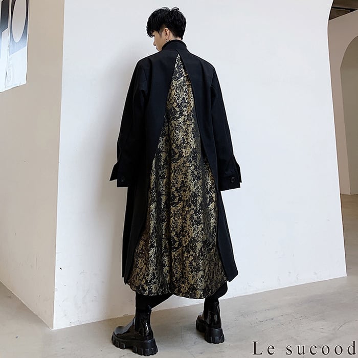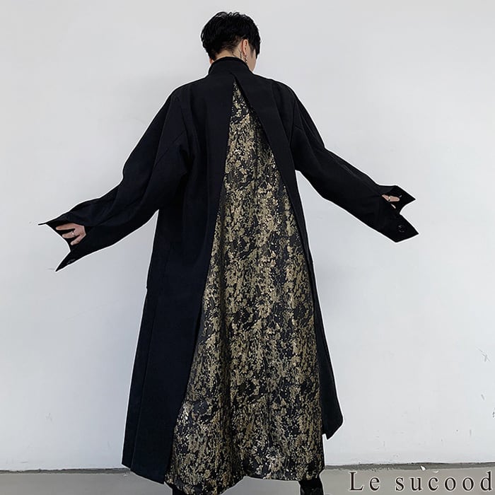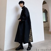 【Le sucood】【お支払い確認後20日以内発送】バック柄切替ロングコート ビッグコート ノーカラーコート オーバーコート オーバーサイズ Aラインコート ゆったり ボリューム袖 ドロップショルダー ロング丈 変形 羽織り アウター アジアン エスニック モード 個性的 ストリート モード系 メンズ | Le sucood