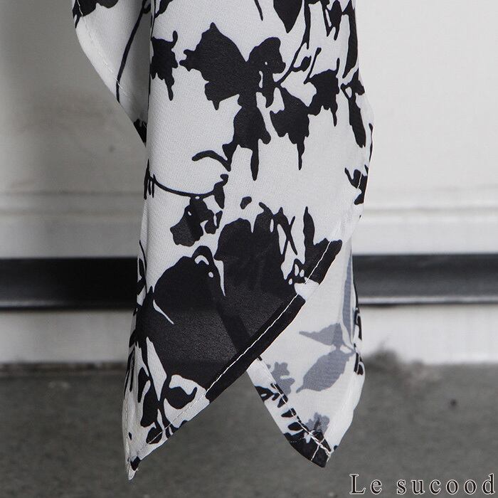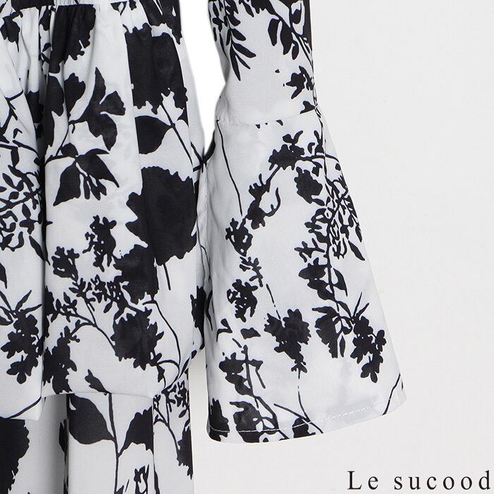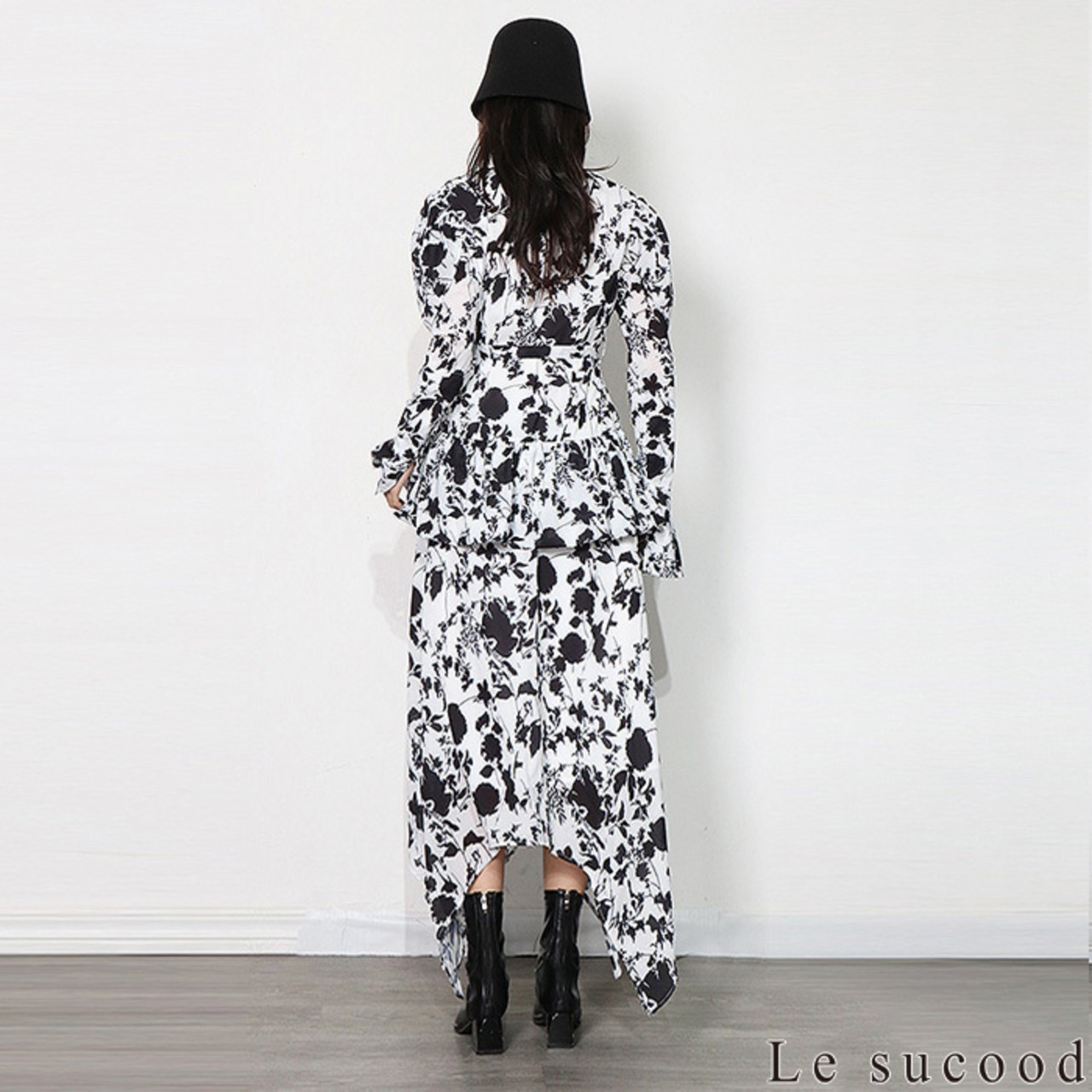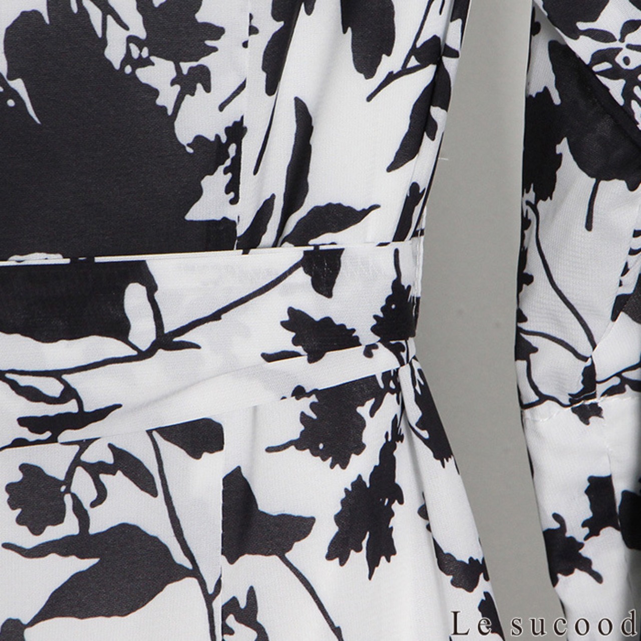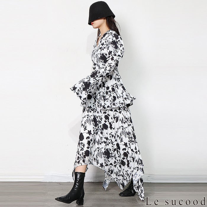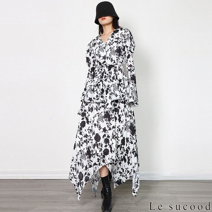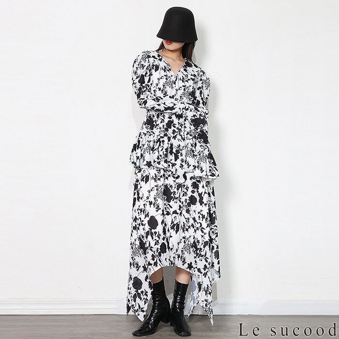 【Le sucood】【お支払い確認後20日以内発送】ペプラム風ヘムカットフラワーワンピース ヘムデザインワンピース デザインワンピ 総柄 花柄ワンピ Vネック ハイウエスト Aライン フレアシルエット 長袖 ロング丈 マキシ丈 モノトーン レディース ストリート モード系 個性的 原宿系 青文字系