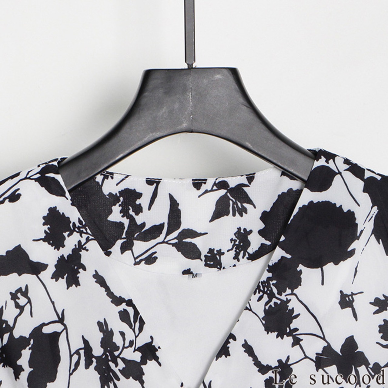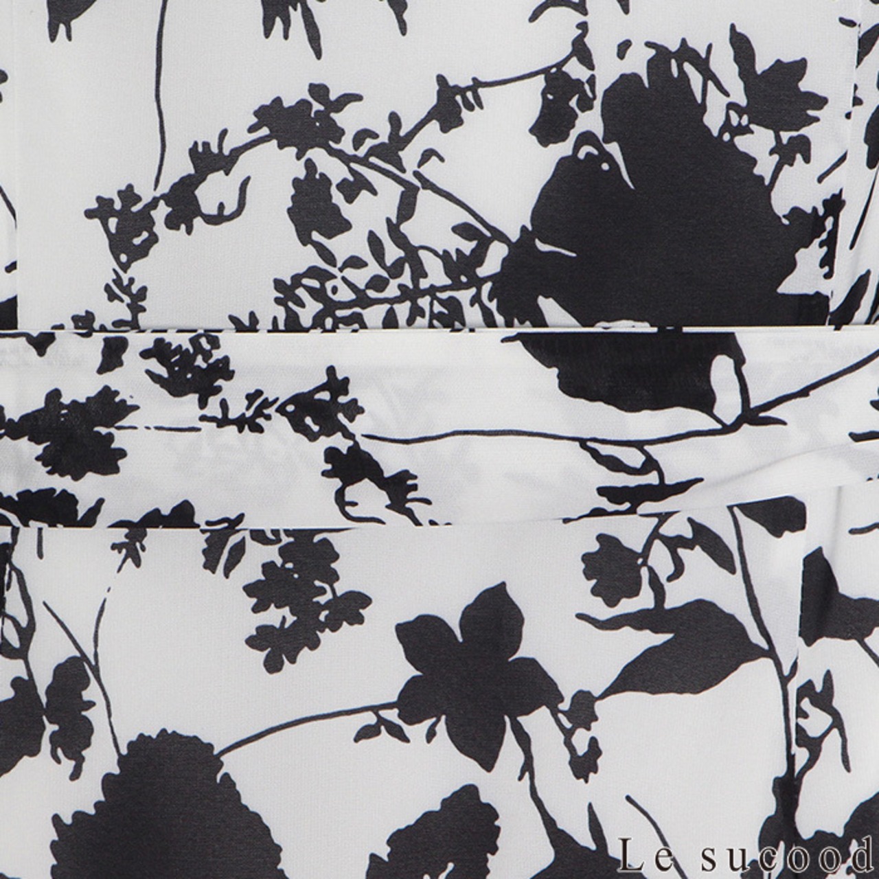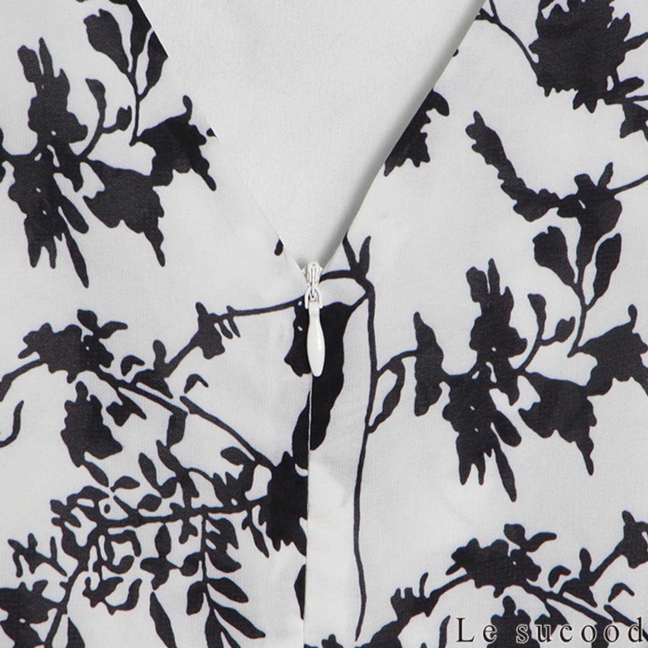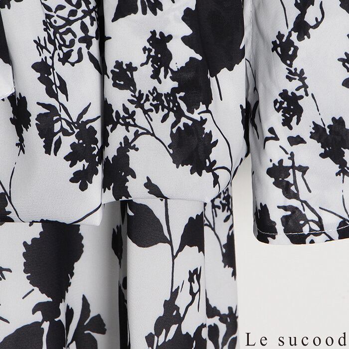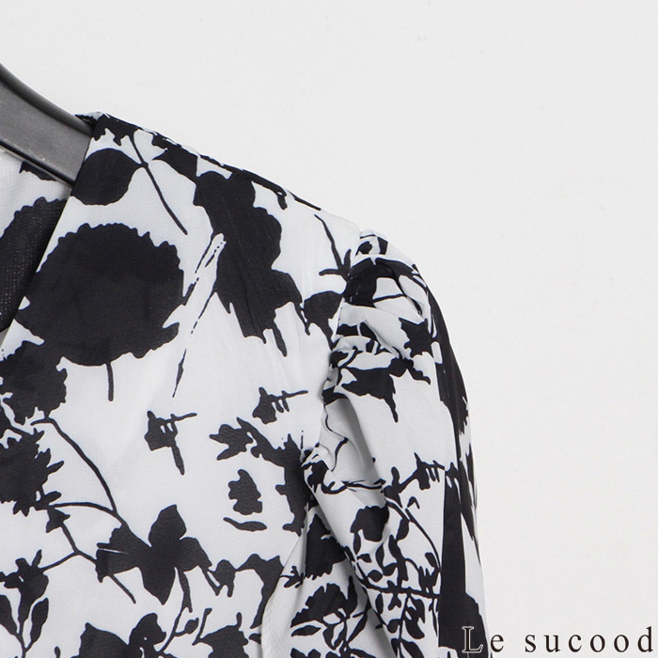 【Le sucood】【お支払い確認後20日以内発送】ペプラム風ヘムカットフラワーワンピース ヘムデザインワンピース デザインワンピ 総柄 花柄ワンピ Vネック ハイウエスト Aライン フレアシルエット 長袖 ロング丈 マキシ丈 モノトーン レディース ストリート モード系 個性的 原宿系 青文字系