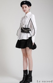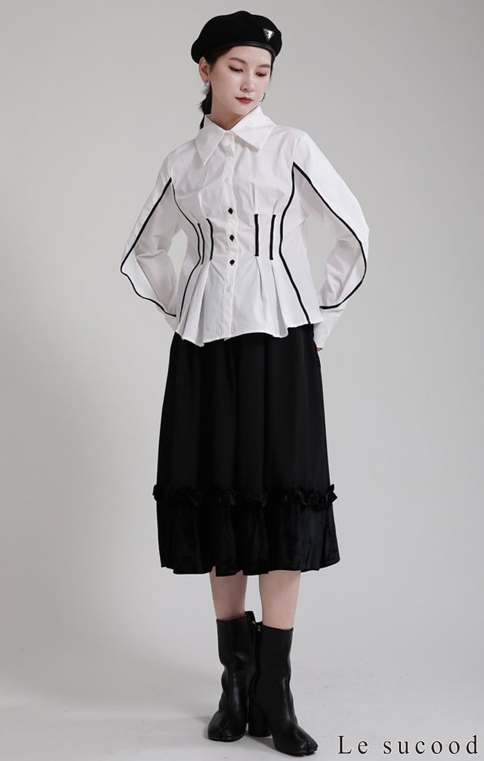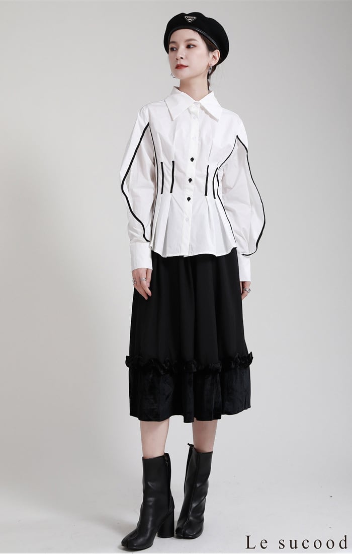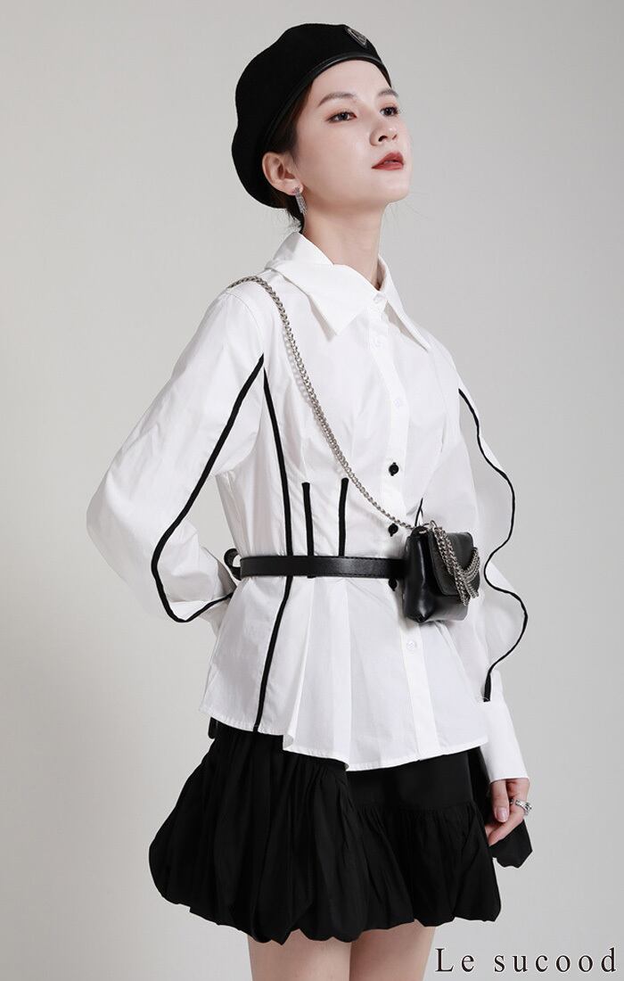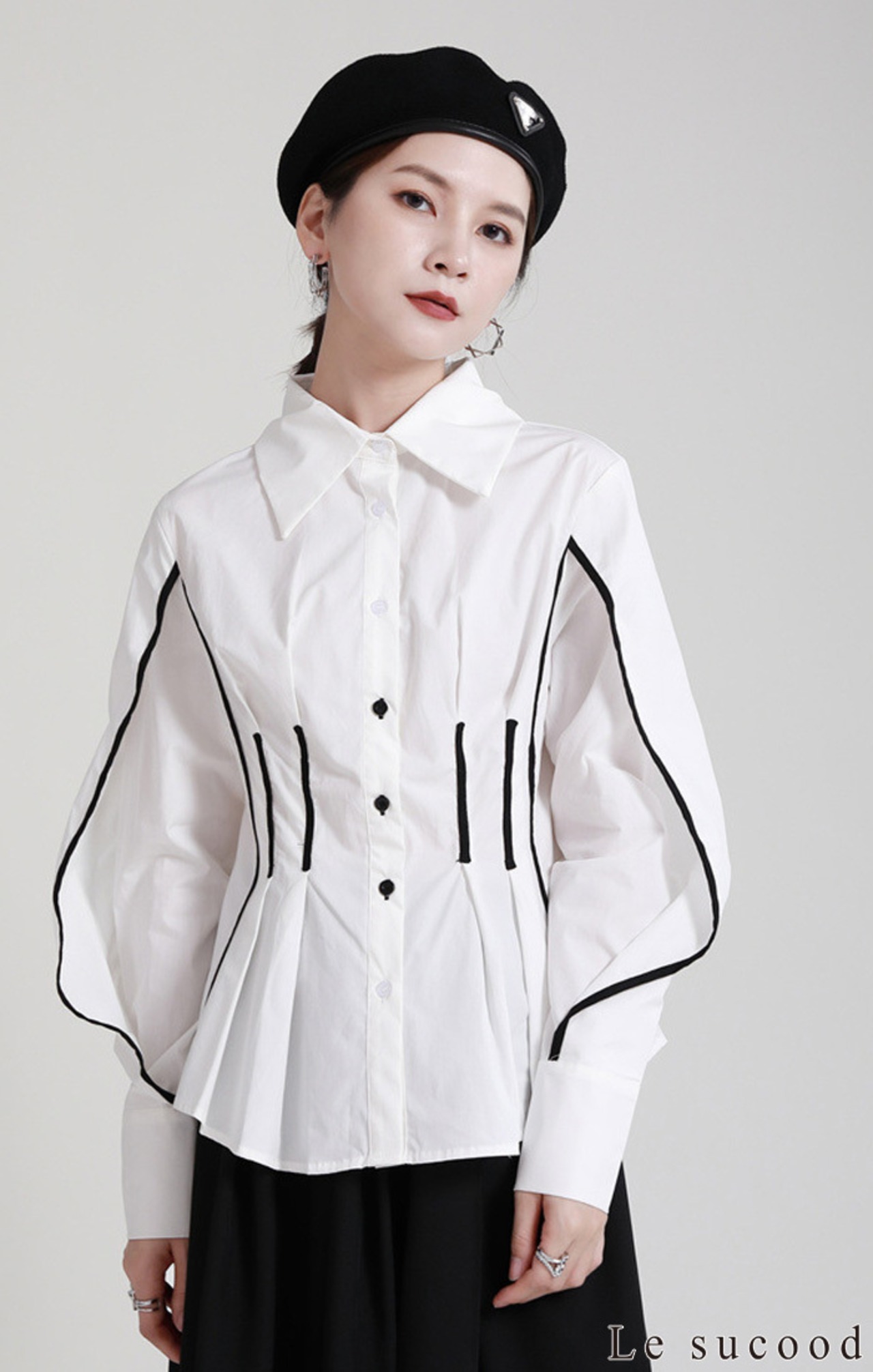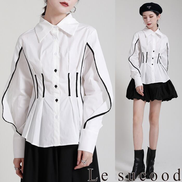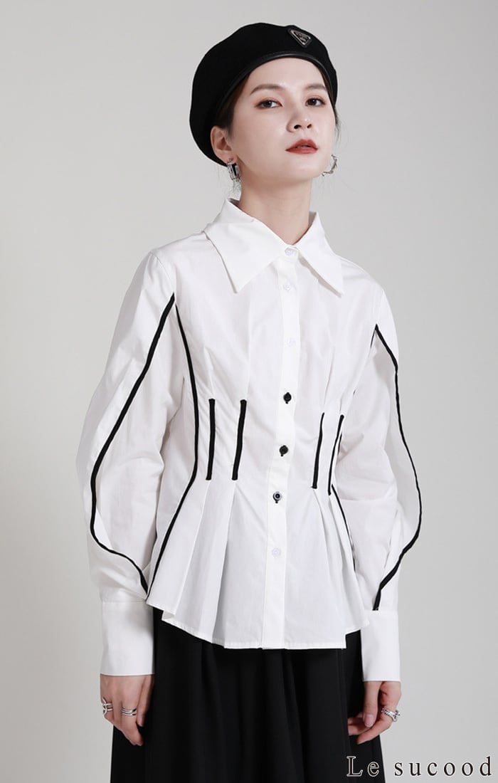 【Le sucood】【お支払い確認後20日以内発送】フレンチレトロコントラストシャツ シャーリングシャツ デザインシャツ 長袖 ボリューム袖 ブラウス 大人カジュアル 大人可愛い フェミニン シンプル カジュアル きれいめ おしゃれ レディース ストリート モード系 個性的 原宿系 青文字系 | Le sucood