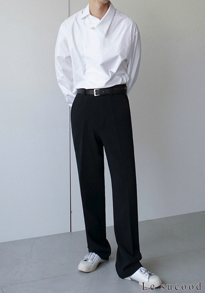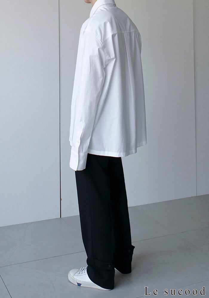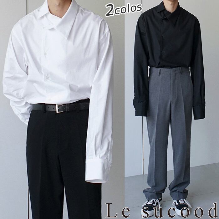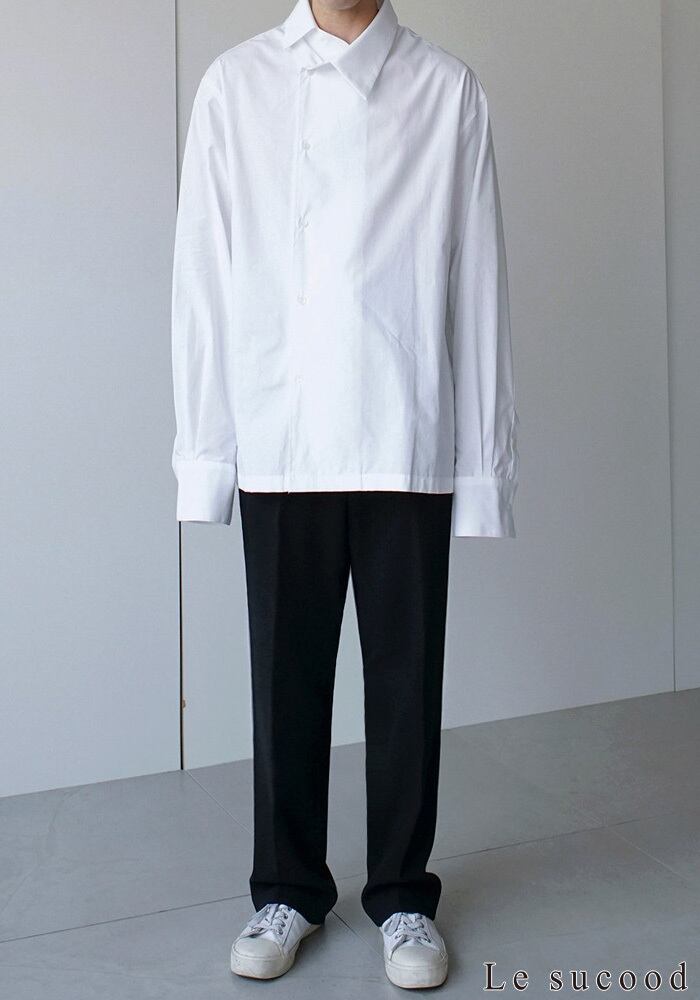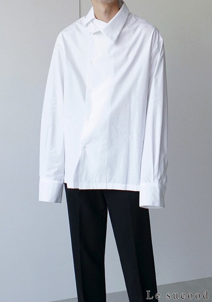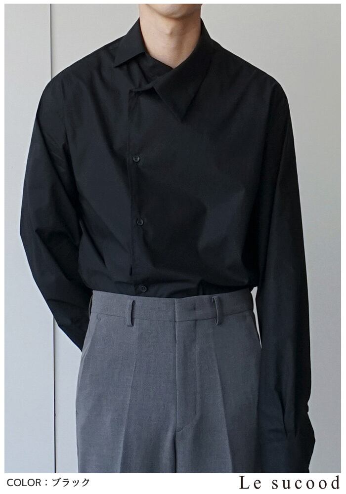 【Le sucood】【お支払い確認後20日以内発送】変形襟シンプルシャツ オーバーサイズシャツ アシンメトリー アシメシャツ 変形シャツ カジュアルシャツ デザインシャツ ゆったり 羽織り トップス モノトーン 長袖 無地 個性的 メンズ モード系 ストリート サロン系 原宿系 青文字系 | Le sucood
