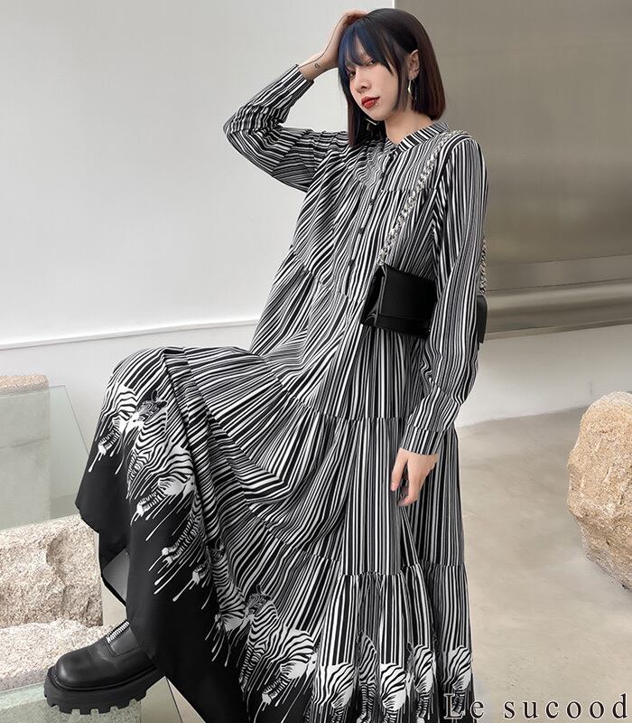 【Le sucood】【お支払い確認後20日以内発送】ゼブラストライプマキシワンピース デザインワンピ ロングワンピ ゆったり Aライン フレアワンピ マキシ丈 ロング丈 長袖 ゼブラ柄 動物柄 アニマルモチーフ モノトーン フェミニン 大人カジュアル レディース ストリート モード系 個性的 原宿系 青文字系 | Le sucood