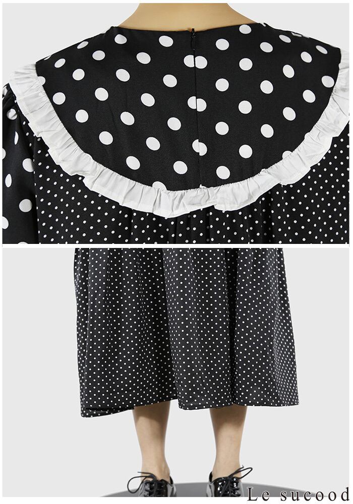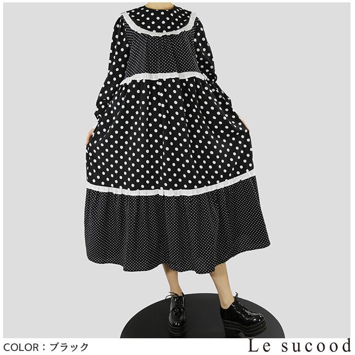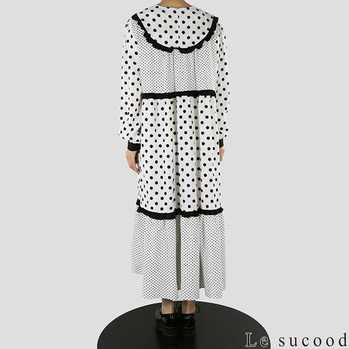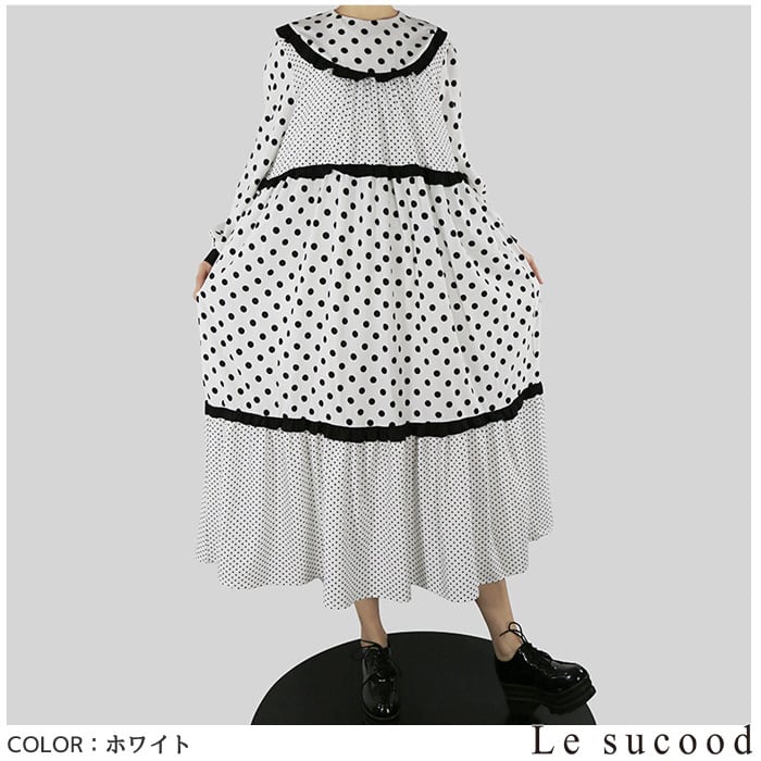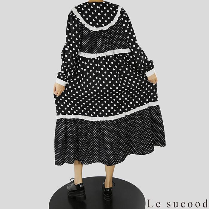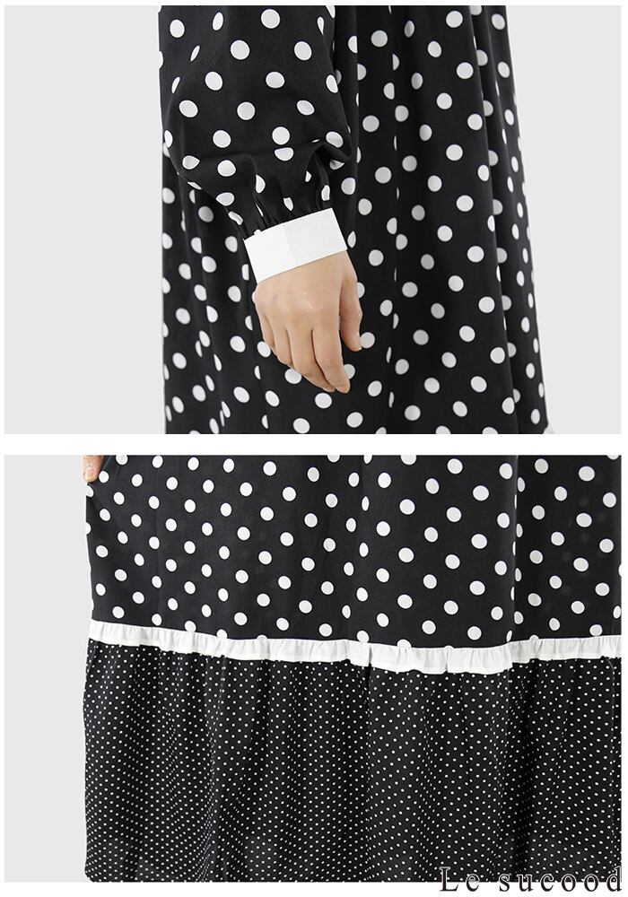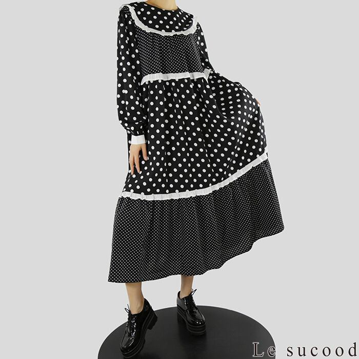 【Le sucood】【お支払い確認後20日以内発送】ドット切替ロングワンピース ドット柄ワンピ フリルワンピ ゆったり Aライン フレアワンピ マキシ丈 ロング丈 長袖 水玉 モノトーン レトロ クラシカル フェミニン 大人カジュアル 大人可愛い レディース ストリート モード系 個性的 原宿系 青文字系 | Le sucood