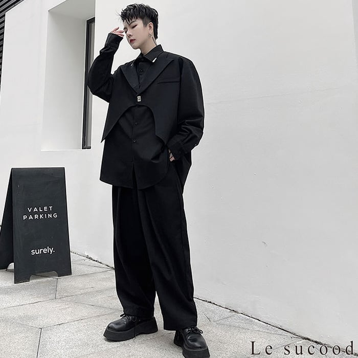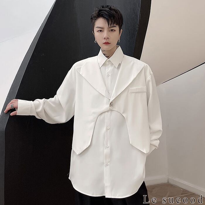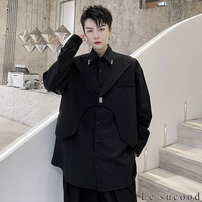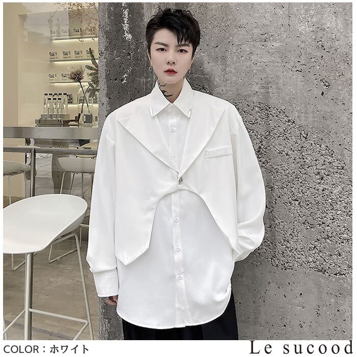 【Le sucood】【お支払い確認後20日以内発送】ジャケットレイヤード風デザインシャツ フェイクツーピース シャツジャケット ビッグラペルシャツ レイヤードデザインシャツ 変形 オーバーサイズ ドロップショルダー ゆったり モノトーン 長袖 個性的 メンズ モード系 ストリート サロン系 原宿系 青文字系 | Le sucood