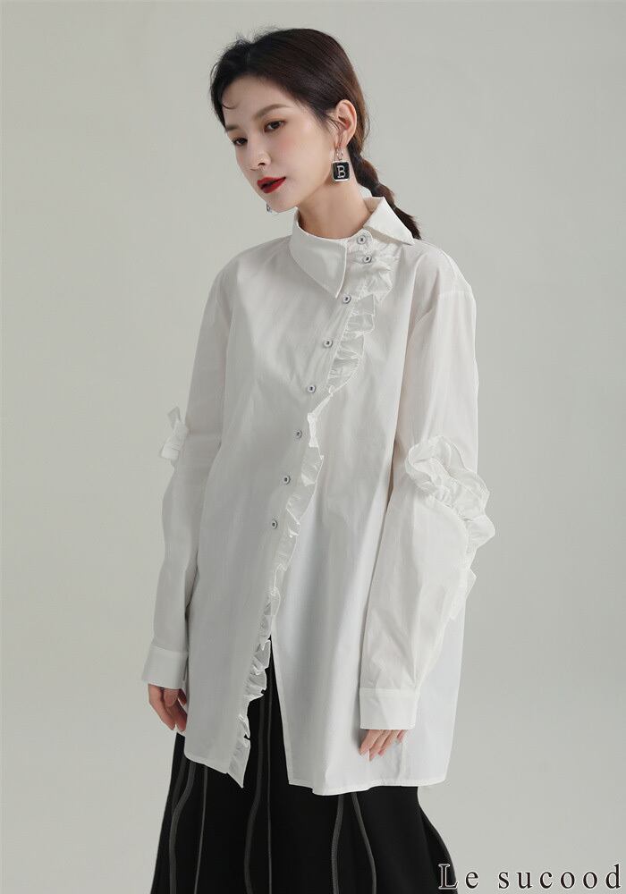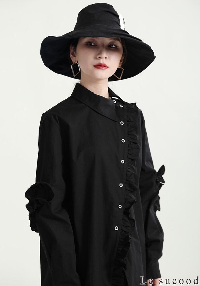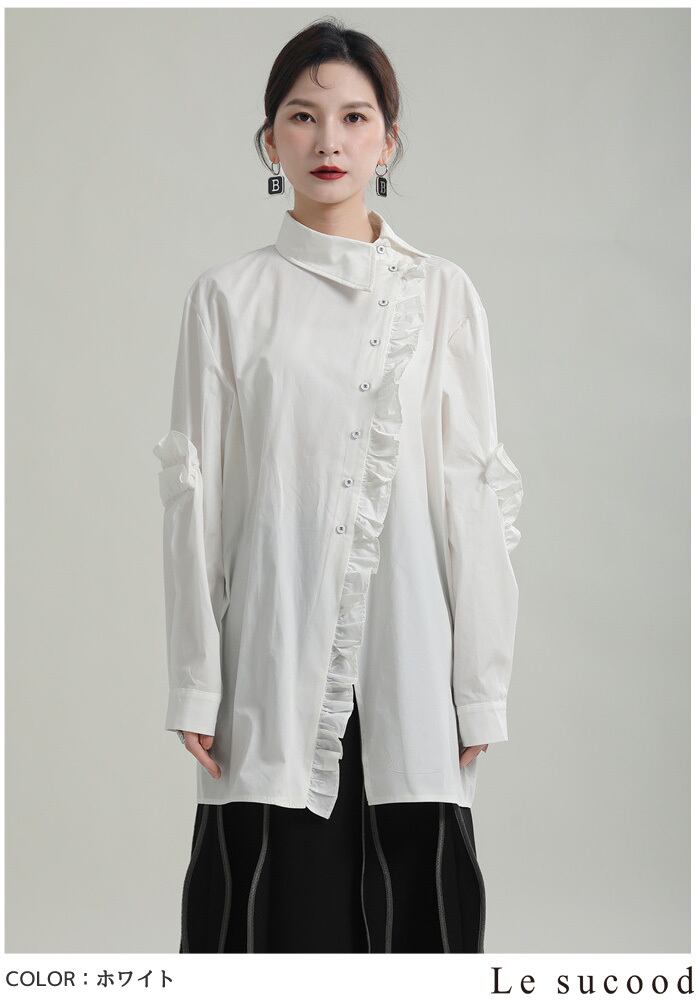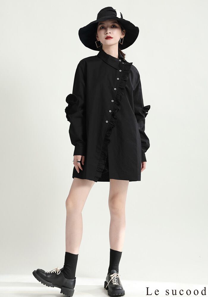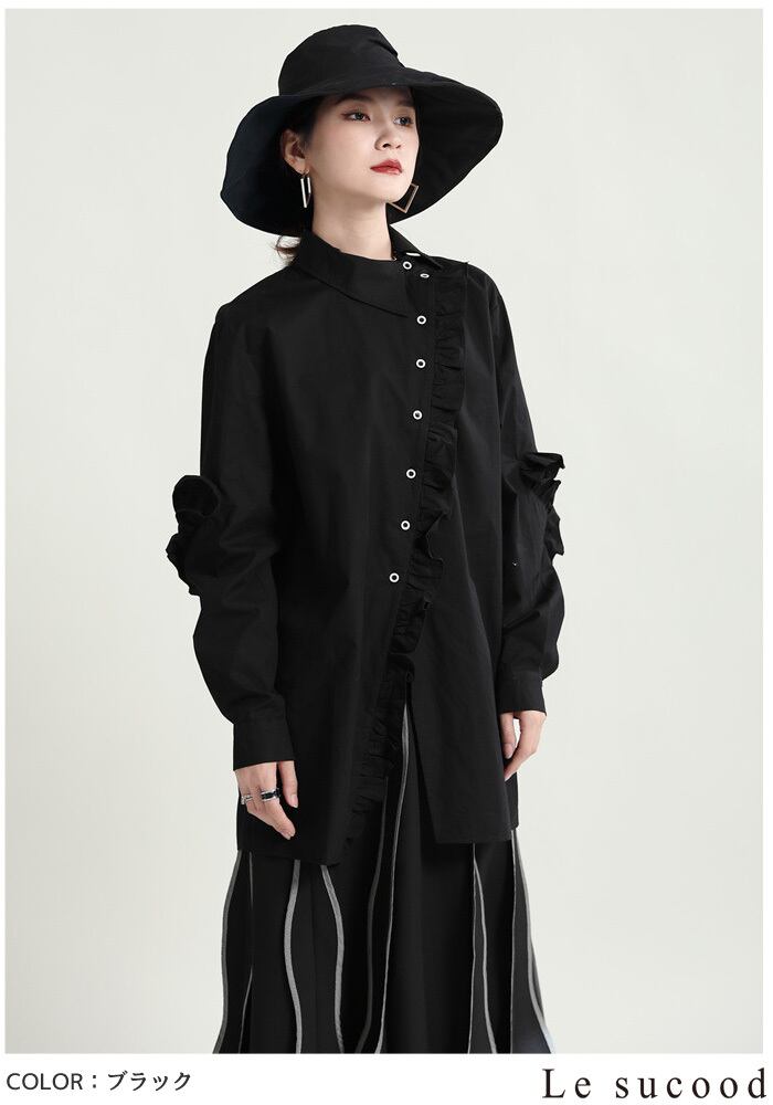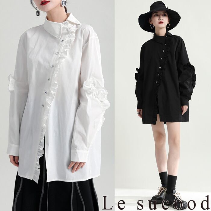 【Le sucood】【お支払い確認後20日以内発送】斜めボタンフリルロングシャツ フリルシャツ アシメシャツ 変形シャツ オーバーサイズ ドロップショルダー ボリューム袖 ゆったり ドロップショルダー ブラウス フェミニン 大人カジュアル レディース ストリート モード系 個性的 原宿系 青文字系 | Le sucood