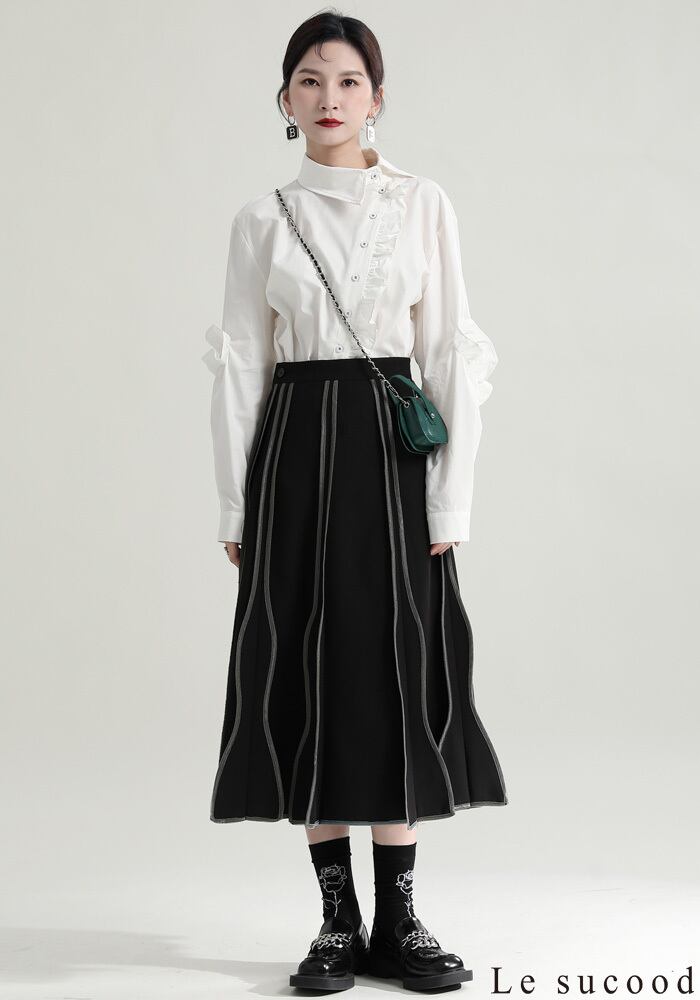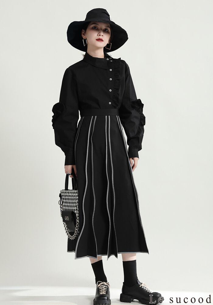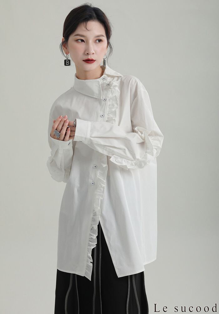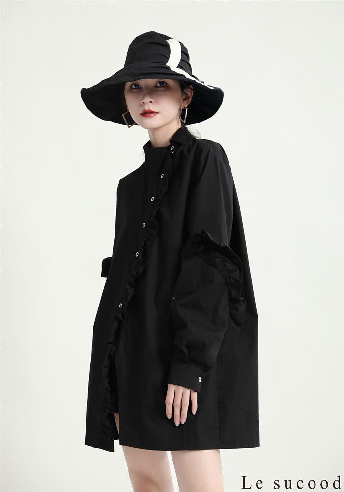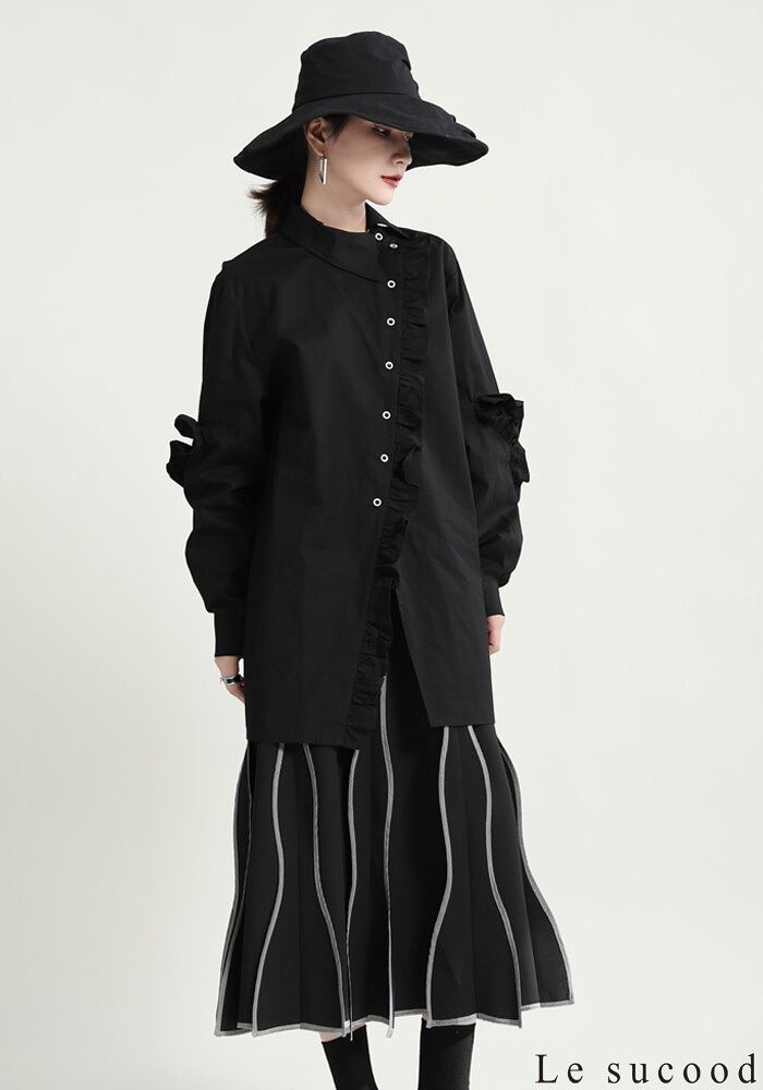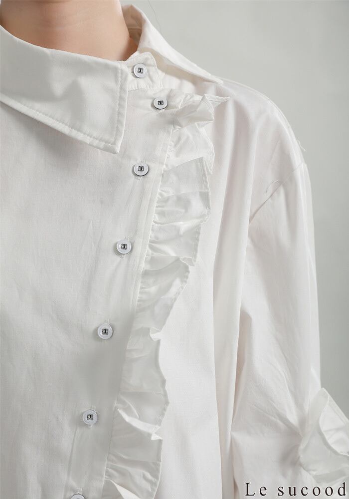 【Le sucood】【お支払い確認後20日以内発送】斜めボタンフリルロングシャツ フリルシャツ アシメシャツ 変形シャツ オーバーサイズ ドロップショルダー ボリューム袖 ゆったり ドロップショルダー ブラウス フェミニン 大人カジュアル レディース ストリート モード系 個性的 原宿系 青文字系 | Le sucood