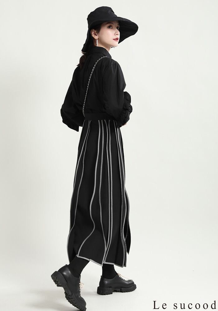 大胆なフリル使いと変則的な襟がモードなロングシャツです。