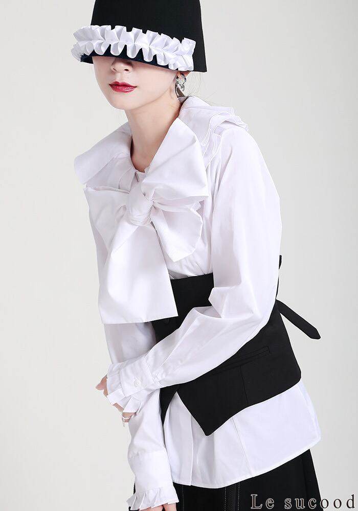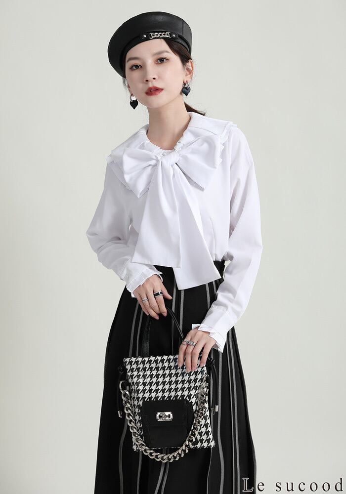 【Le sucood】【お支払い確認後20日以内発送】プリーツカラービッグリボンタイシャツ リボンシャツ ボウタイシャツ ボウタイブラウス ネックリボン プリーツシャツ ビッグカラーシャツ ブラウス フェミニン 無地 ホワイト 白 大人カジュアル レディース ストリート モード系 個性的 原宿系 青文字系