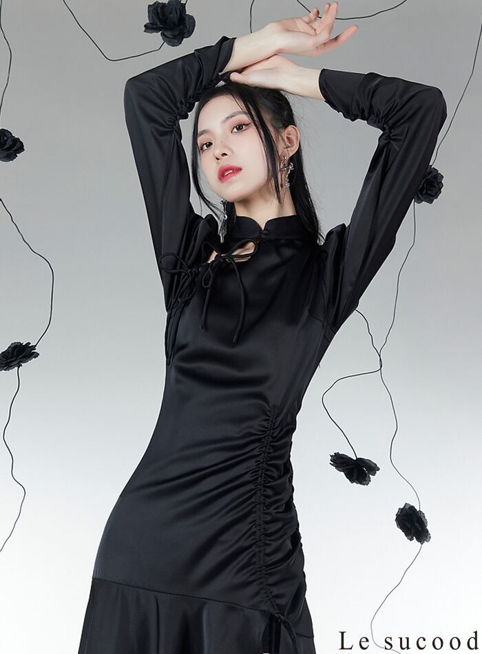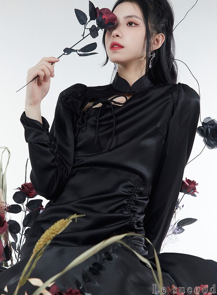 【Le sucood】【お支払い確認後20日以内発送】ラクジュアリーチャイナワンピ チャイナドレス チャイナ服 長袖 ロングワンピ バルーンスリーブ スリット マキシ丈 フェミニン きれいめ シンプル モノトーン アジアン エスニック 民族風 レディース ストリート モード系 サロン系 個性的 原宿系 青文字系 | Le sucood